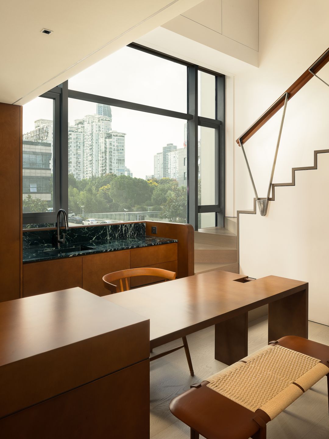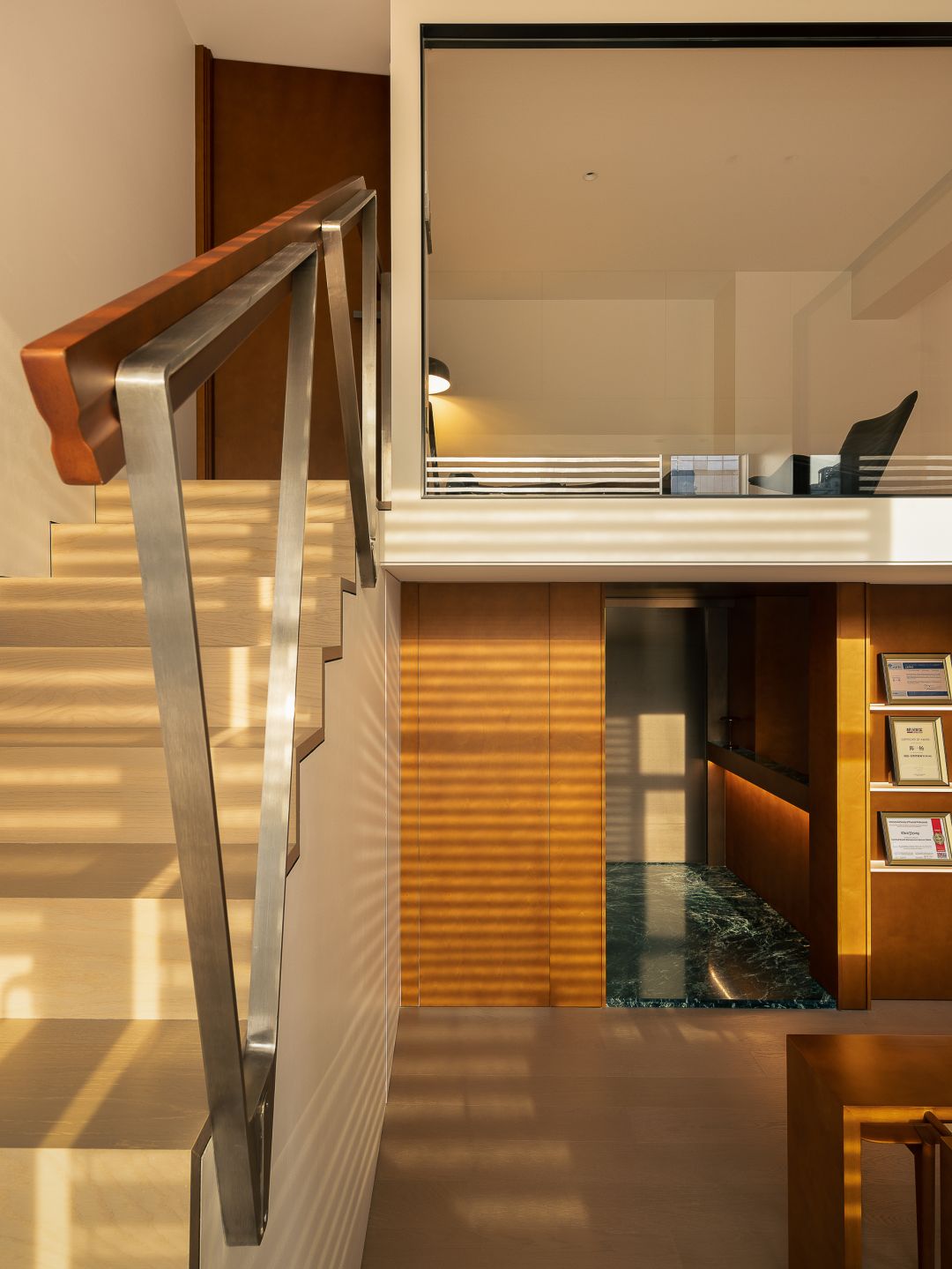 一半的空间让给流动的光,记录着时光的流逝。扶梯而上,纯净通透的夹层无遮挡的被展现,时尚的艺术氛围跃然而出。