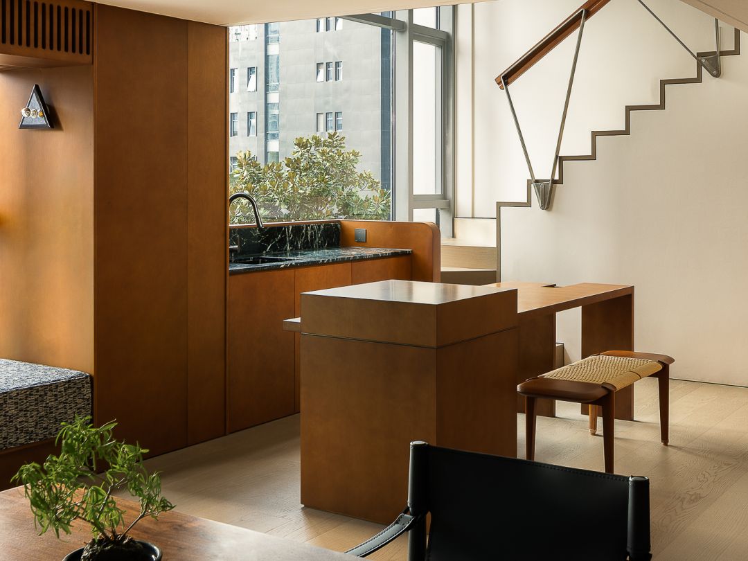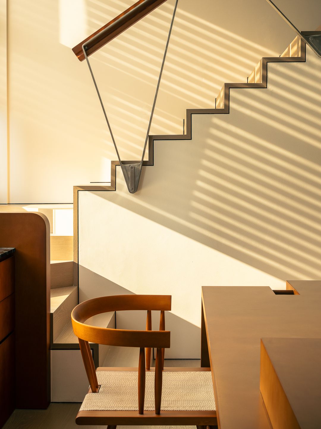 立面的简约特征体现功能的真实表现,暴露下的几何构图,纤细锐利的三角线型取代了传统扶手的柔和曲线,展现纯粹几何关系下的静态美感。设计以稳固的三角几何关系承接上下空间的转折,圆角元素柔化金属材质的冷硬与三角的尖锐感。
