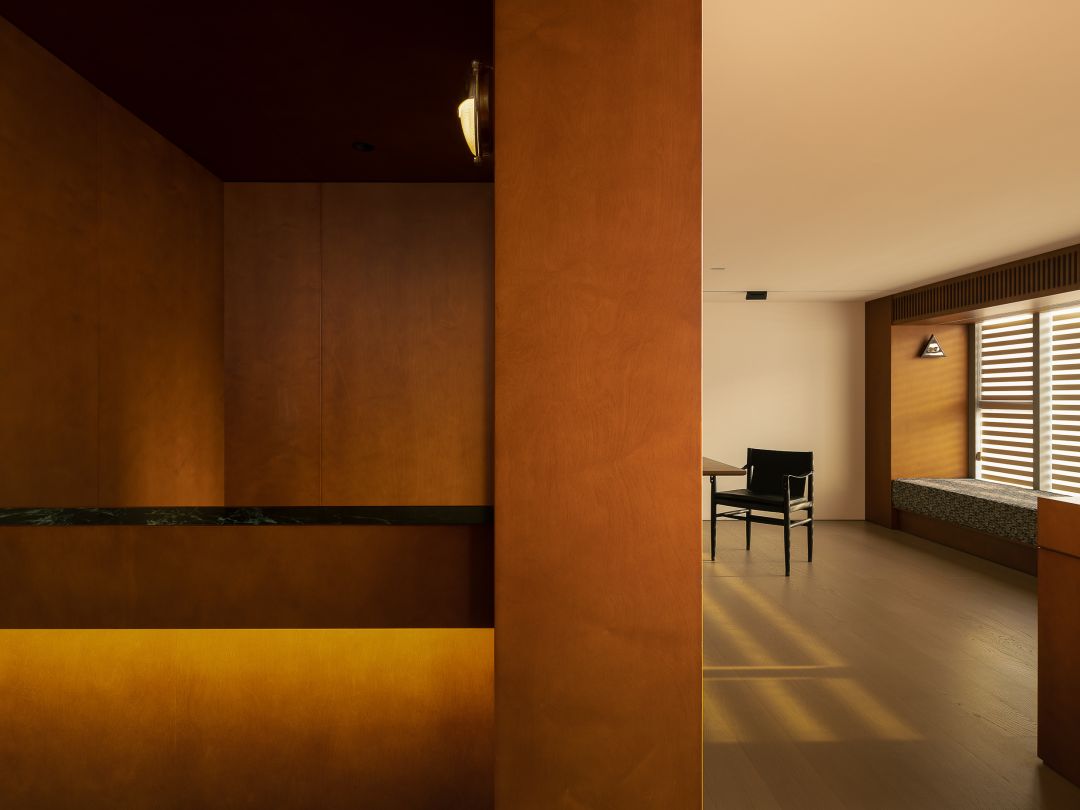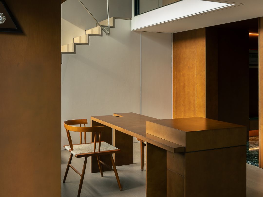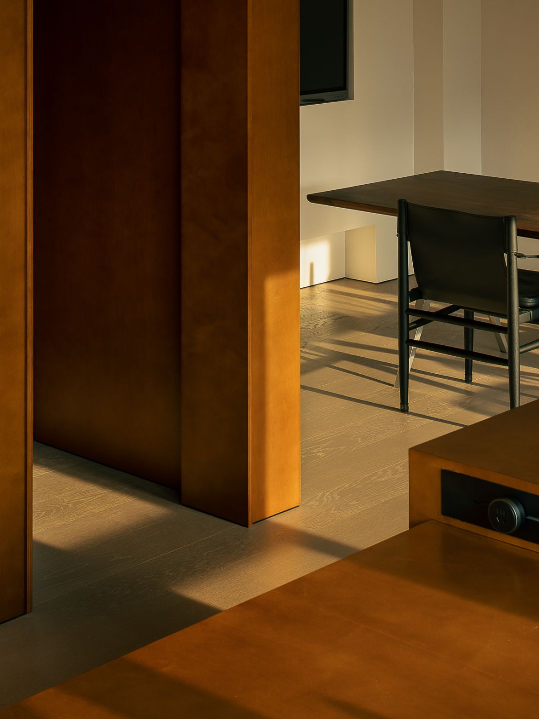 空间内的运力、用色、明暗蕴涵着德式美学下的庄重与饱满。设计以暖阳为调,结合“晨”阳的意蕴,饰面铺陈出复古而学院派的风味,如可可般浓郁醇厚,彰显经典永恒。