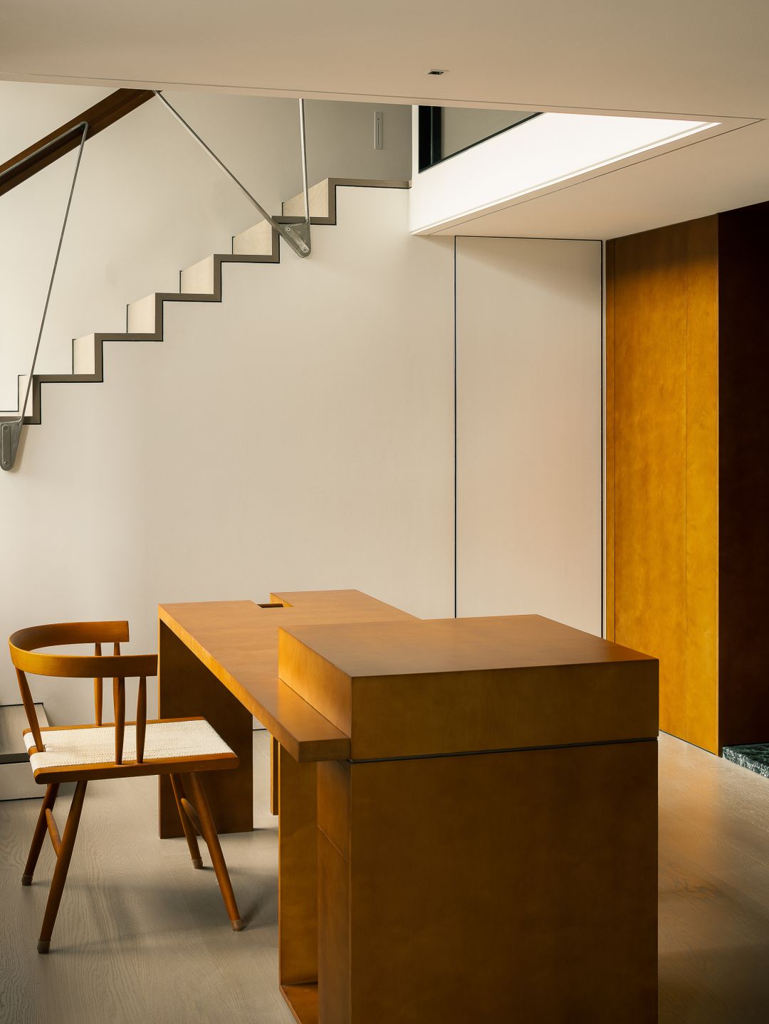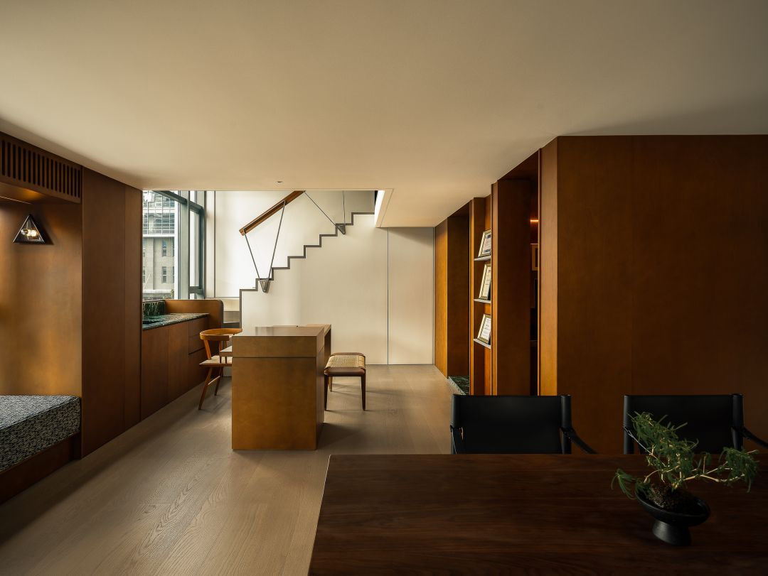 金属的质感与木质的温润,极端的材质对比,极高的精度和尺寸性表达,让极简风格的延续相得益彰。三角几何更是如拉绳般纤细却展现极致的力感支撑空间,是艺术与技术的统一,更是极简下自洽的空间美感。白色界面上映射出栅格般的等分线条排列纹理,是光带给空间的惊喜。