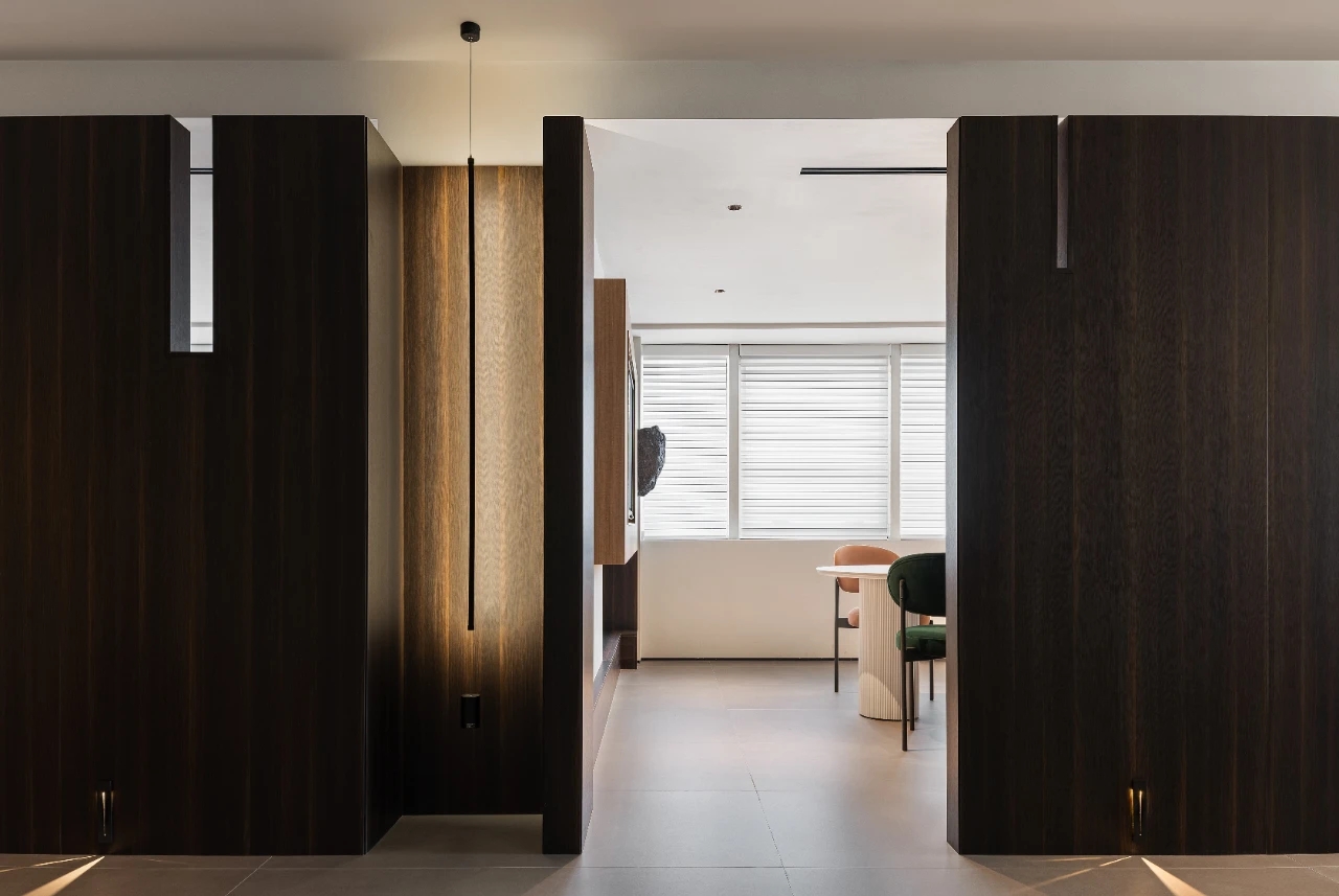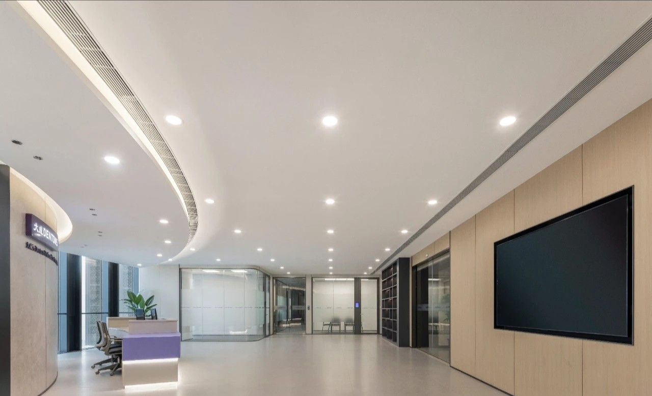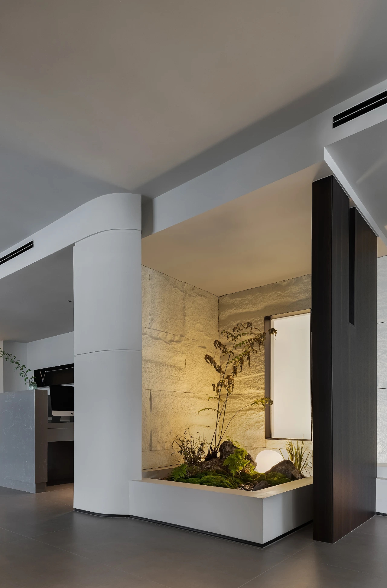 延续主楼层的布置,副楼的前区依旧是顺势的流线延申至工区。与之不同的是天花与立面造型和材质的用法,没有主楼层的叠复交加明显此处天花更简易直接、立面的材质也换成木饰面与主层冷调的岩石面形成对比。前台的形式也是随之改变增加了紫色亚克力的岩石纹路,用通透的材质结合凹凸的岩面将柔与刚整体结合起来。