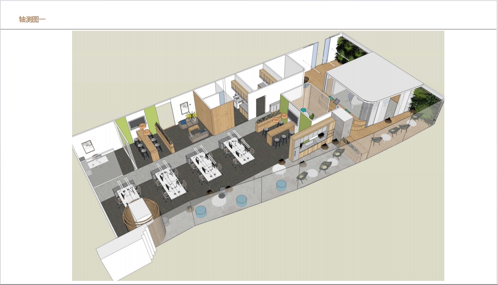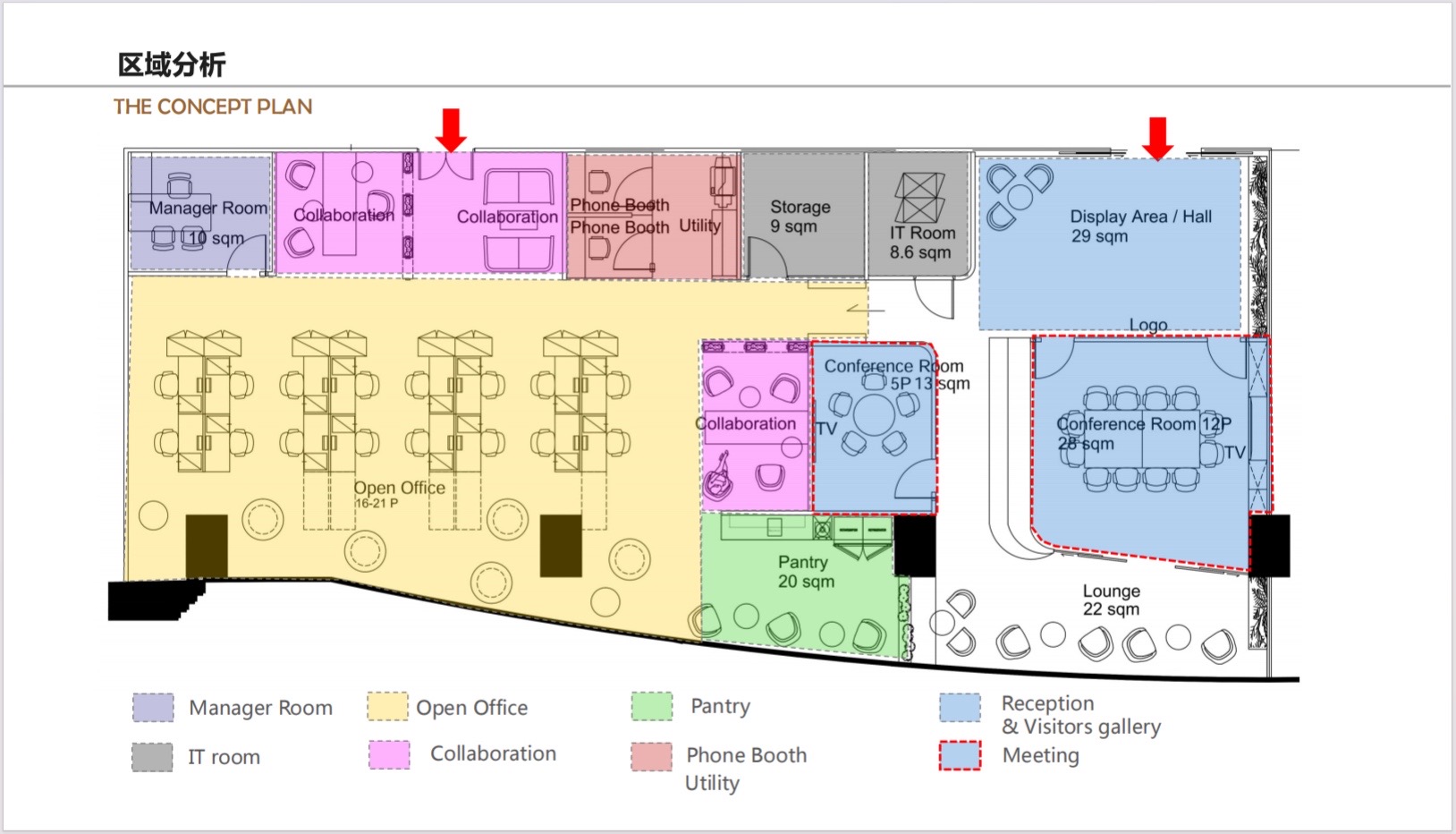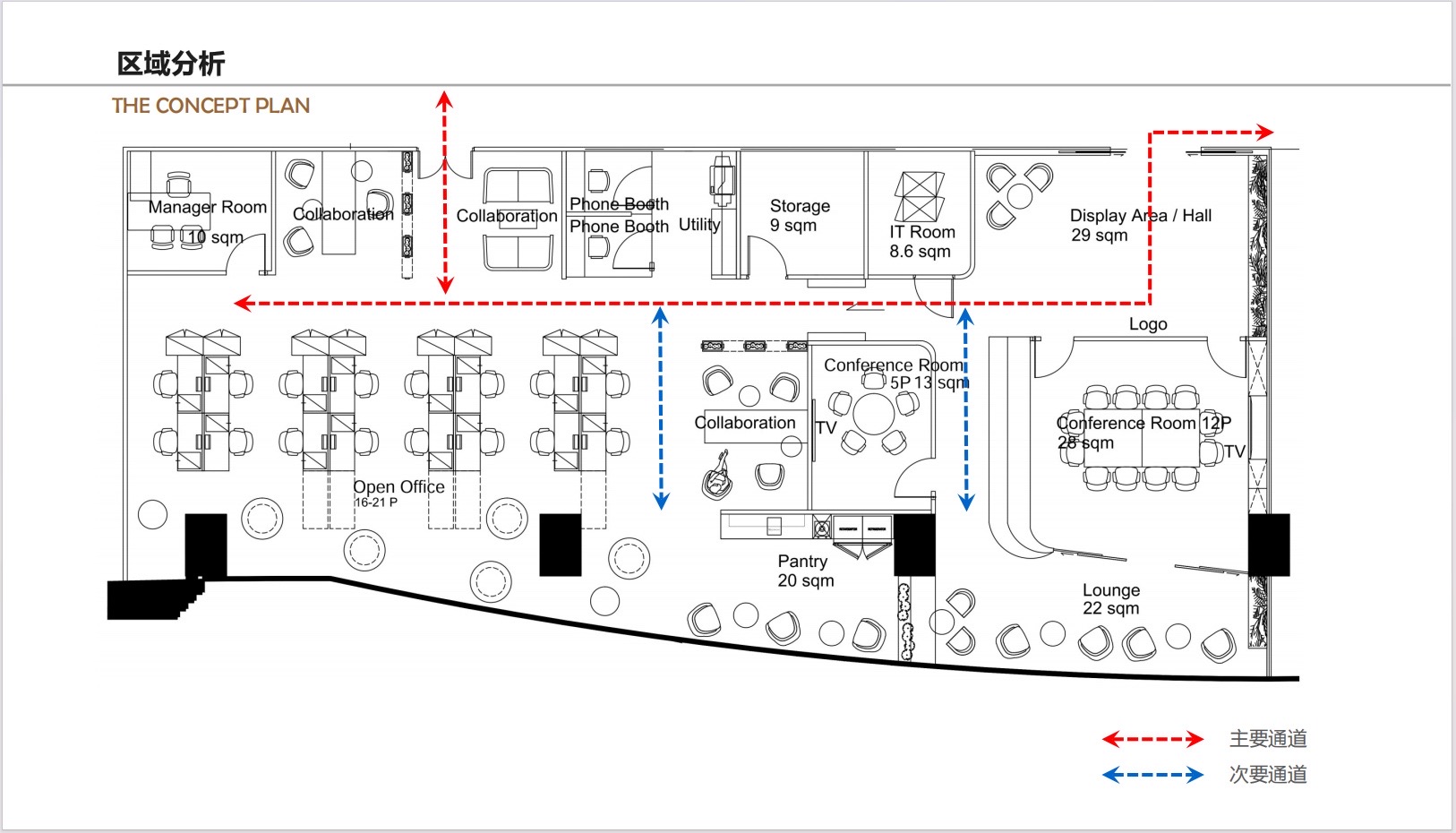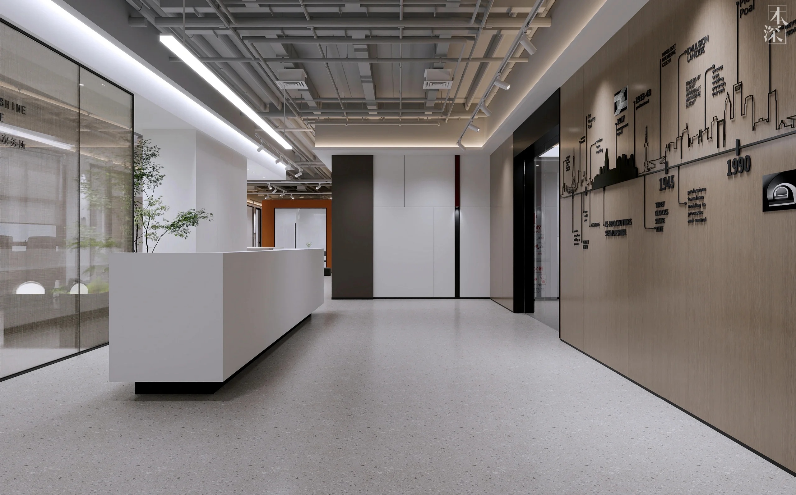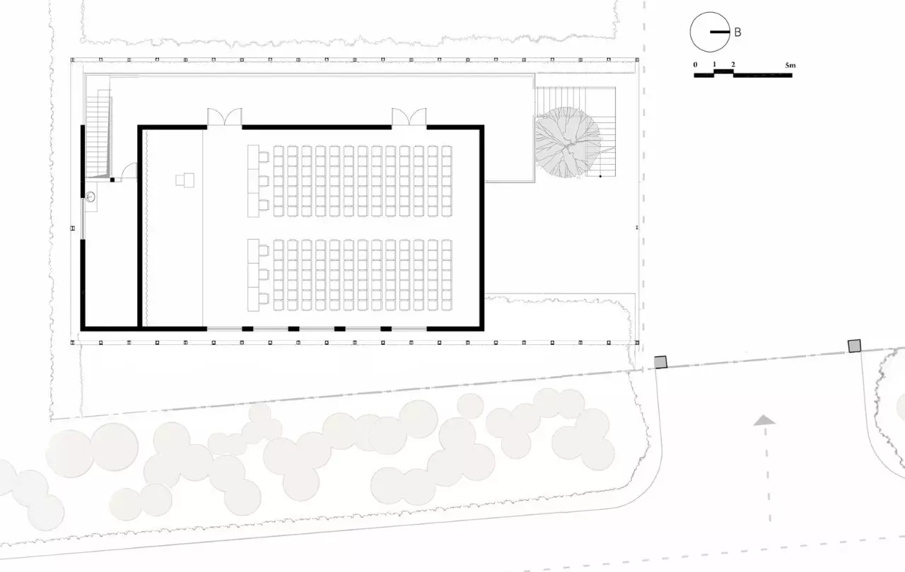 包含了两个主要功能,一楼主要是18人的工作空间,二楼是一个可以容纳200个座位的大厅。然而,该公司同时关注位于一楼的、将会与二楼通过走廊相联系的主大厅的设计。