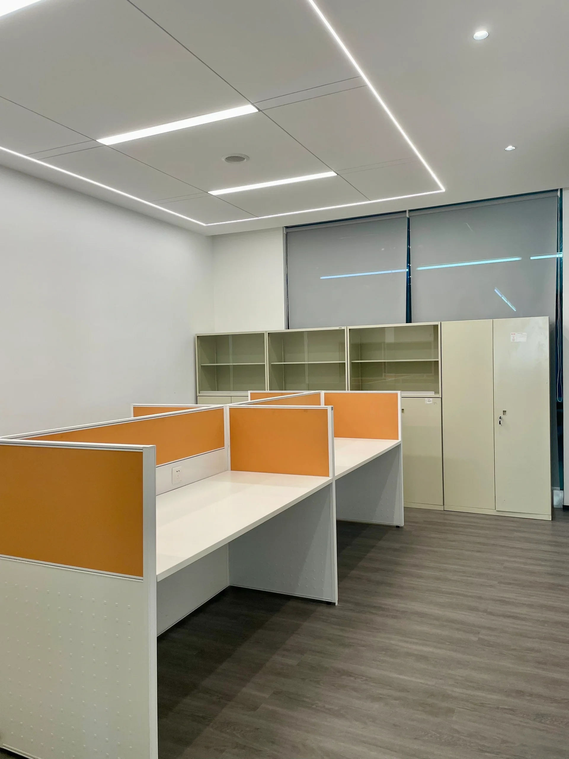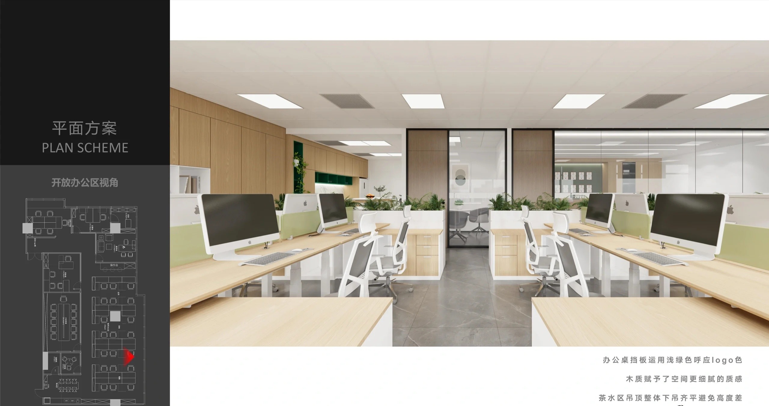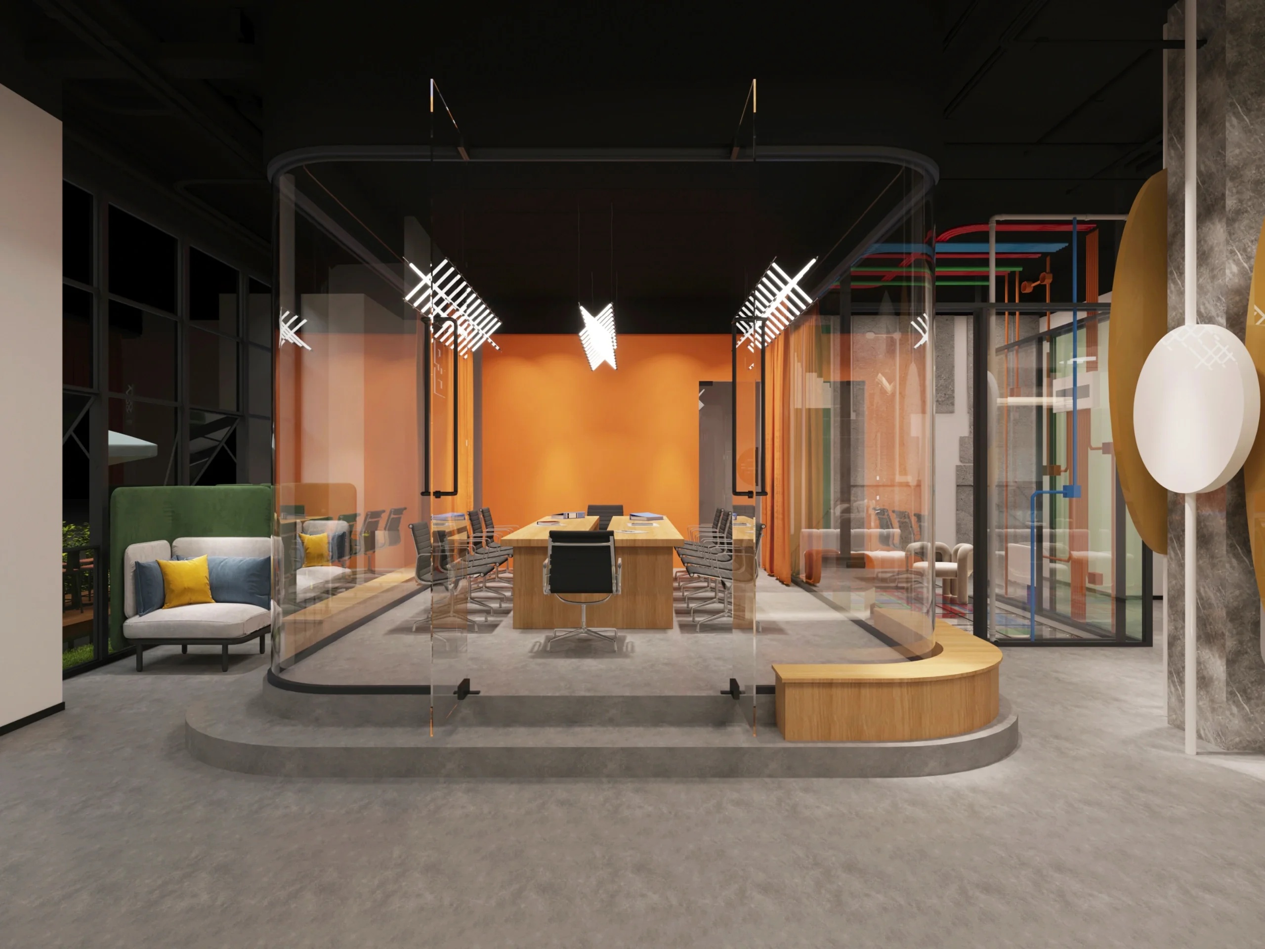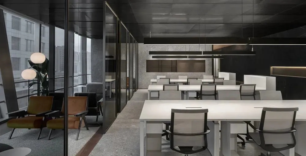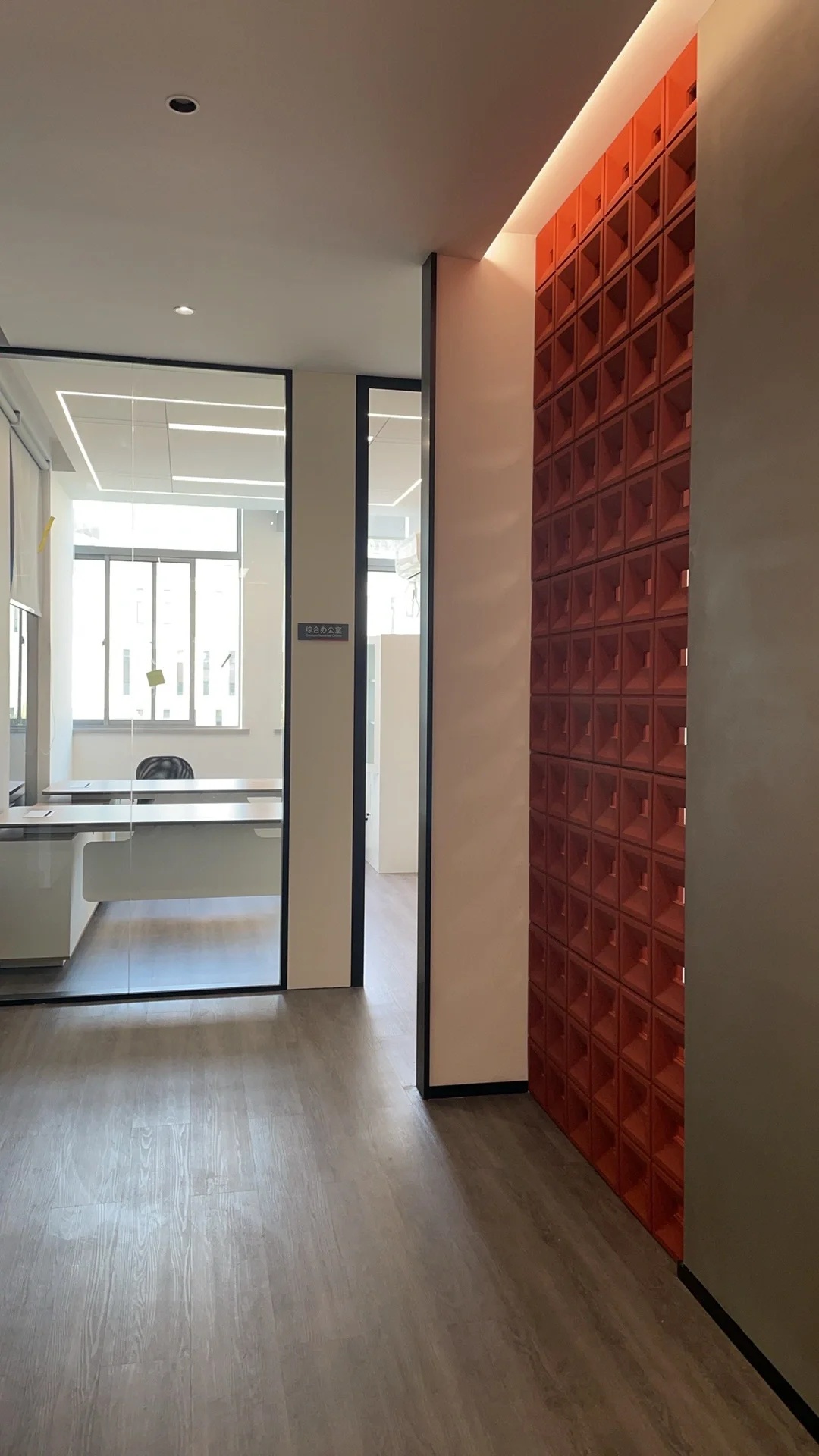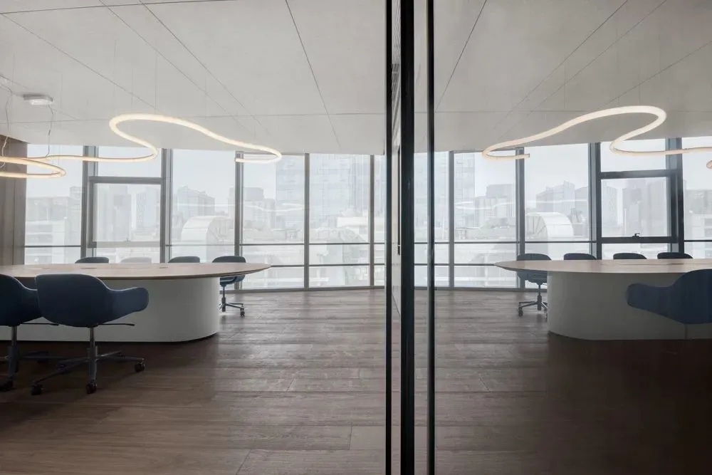 最大的开间留给了开放办公区,在原有结构下顺势而为,一道可开合的滑轨玻璃门区分了办公空间和讨论区,一来用以在功能上满足不同场景的办公需求,其次用以缓解临窗工位易受外部影响的问题。