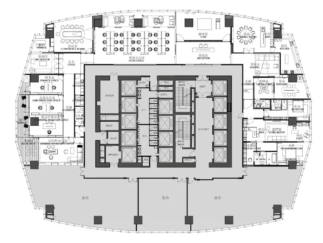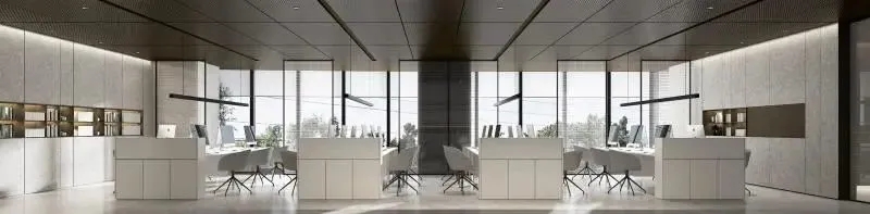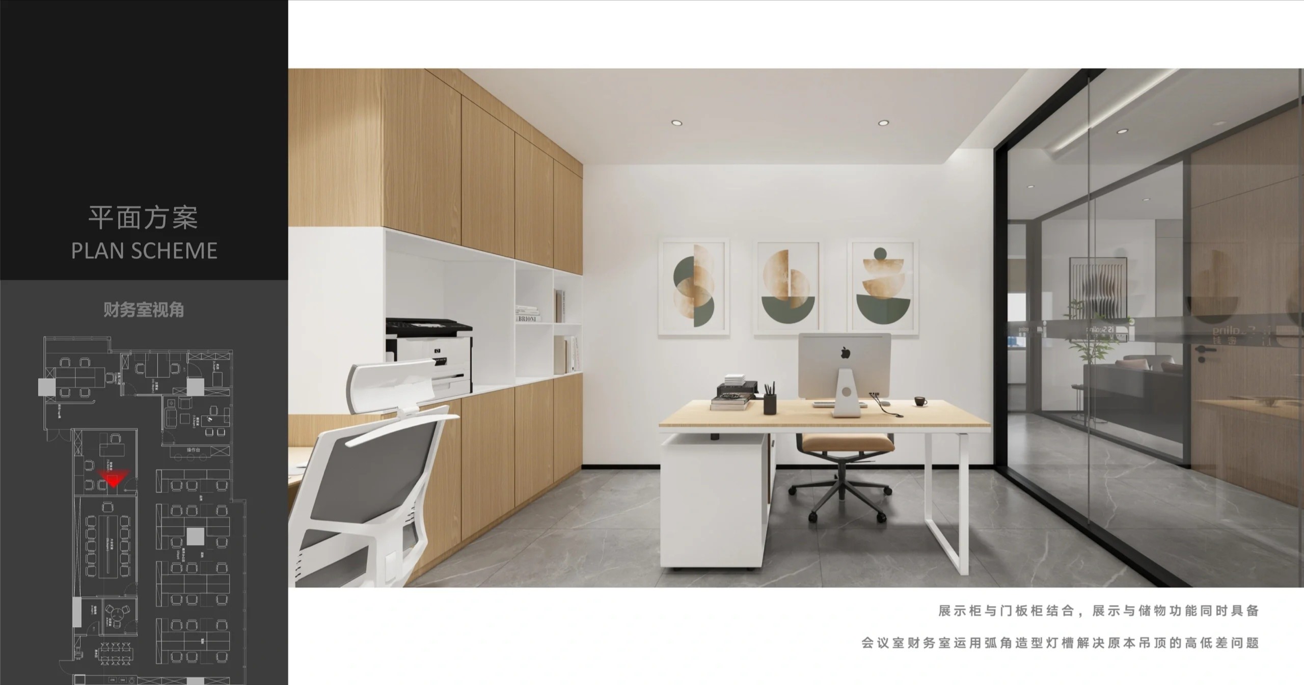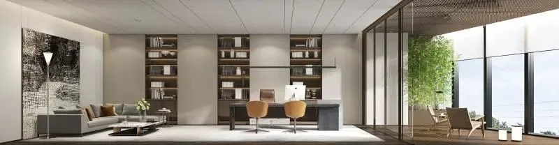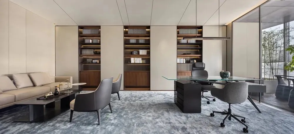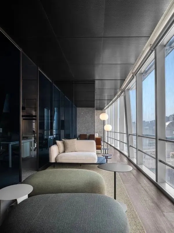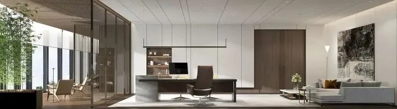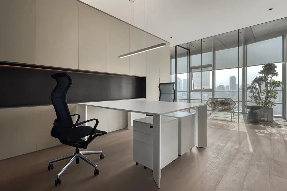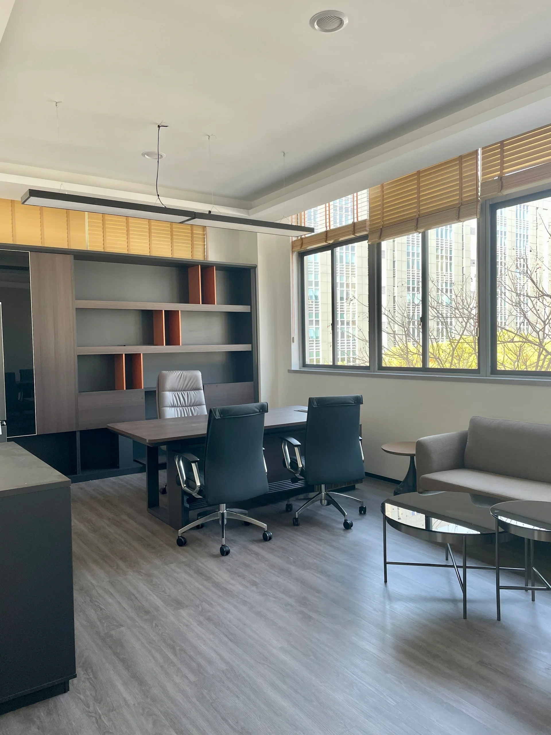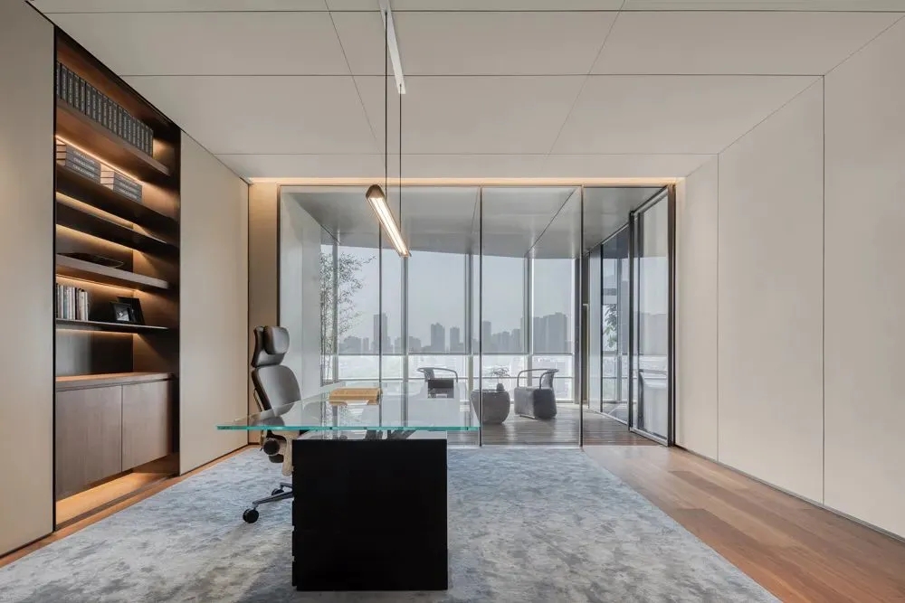 总经理办公室配套了会客区、办公区和洗手间,并有一条独立动线以满足业主的功能需求。墙面壁布一直延伸至天花,与柜体分割比例相呼应。在手法上去装饰化,空间中的功能随家具的摆放而界定,传达了一个自由、安静的办公氛围。在办公室与建筑帷幕之间我们打造了一个室内庭院,庭院不仅与其他独立办公室产生了互动,又因调用了不同的形式语言, 为大空间增加了的层次感。
