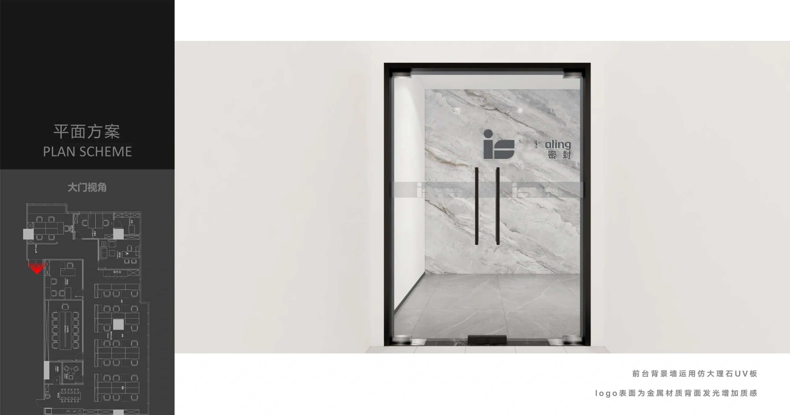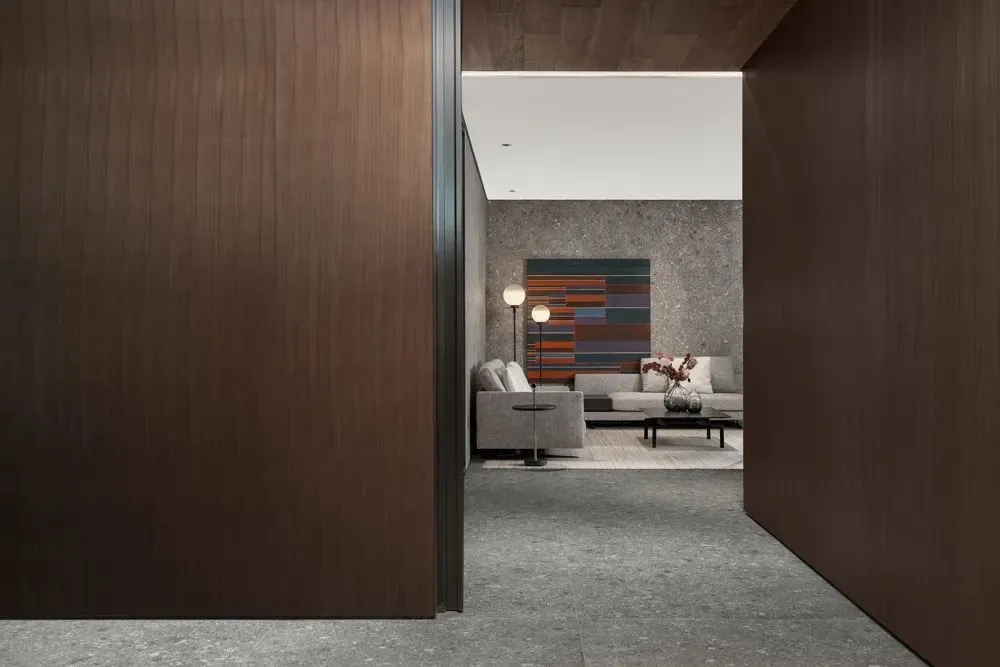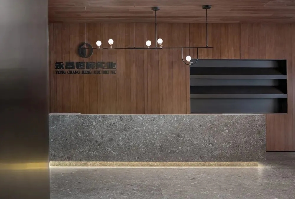 为平衡现代建筑中大量的玻璃、钢结构和大理石的冰冷,接待区在材质策略上达成了米兰灰&胡桃木的组合,材料独特的纹理对比强调了人在木盒子中的体验,设计师希望让人进入场所后能第一时间唤起记忆中对天然木的依赖与留恋,这与永昌恒辉公司的待客之道不谋而合。