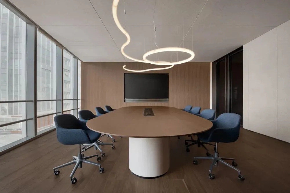 效率和创意是会议室所必需的空间属性,作为公司团队沟通计划和碰撞想法的场所,纯粹的匀质空间或许更能表达其精神。“如无必要,勿增实体”,我们选用两种不同肌理的材质呈现了一种严肃的韵律。最后,在这个秩序的房间中,我们希望代表灵活的 Artemide 灯管能赋予空间新的可能性。“功能决定了物品的位置,加入的物品又在影响空间的精神,最后再由空间给人以感动。”