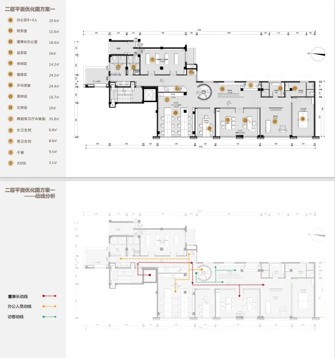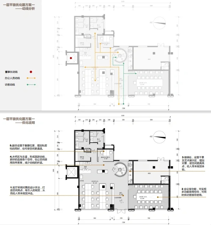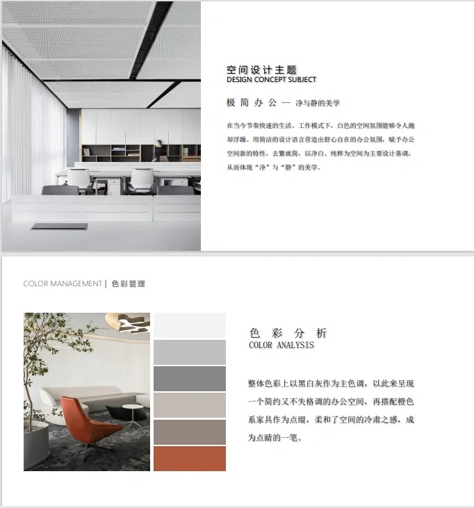 设计依据办公性质的需求,将空间合理划分为会议区,独立办公区和开敞办公区,占据两层的办公空间以一部现代感十足的白色钢梯连接,空间通透,实现了上下空间的渗透和延续,体现了企业开放和包容的设计情怀。