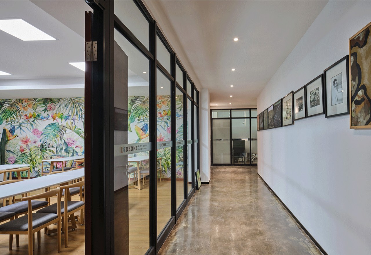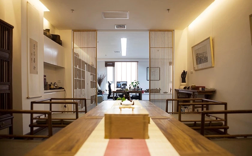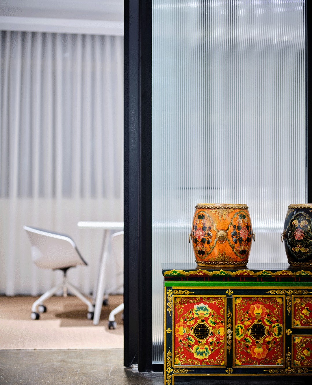 独立办公室亦是极简大气,呈现出一系列高度精致巧妙的设计:随处可见的木质纹理让人联想起酿酒的场景,水磨石纹理地面以及大面积玻璃隔断则带来精致和丰富的质感,塑造出一个优雅高端的品质空间。