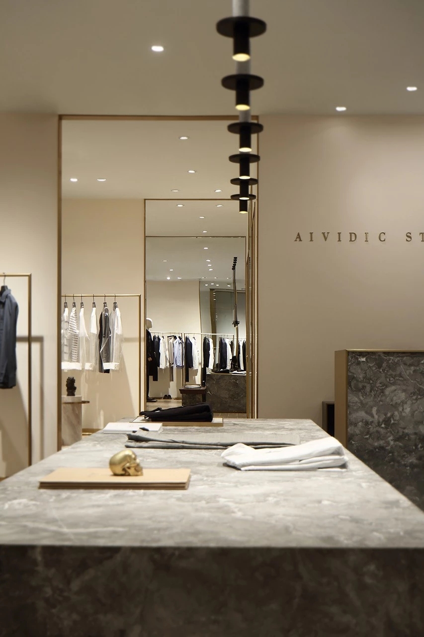AIVIDIC STUDIO男装精品店位于福州金融街万达广场,内部充满了简约的现代美感,这个空间以米色为主调,以原木陈设,用金属收边,简洁的风格增添了精致的颜色,呈现文艺淡雅的温暖和家居般的舒适,传递着"AIVIDIC STUDIO" 品牌气质。
