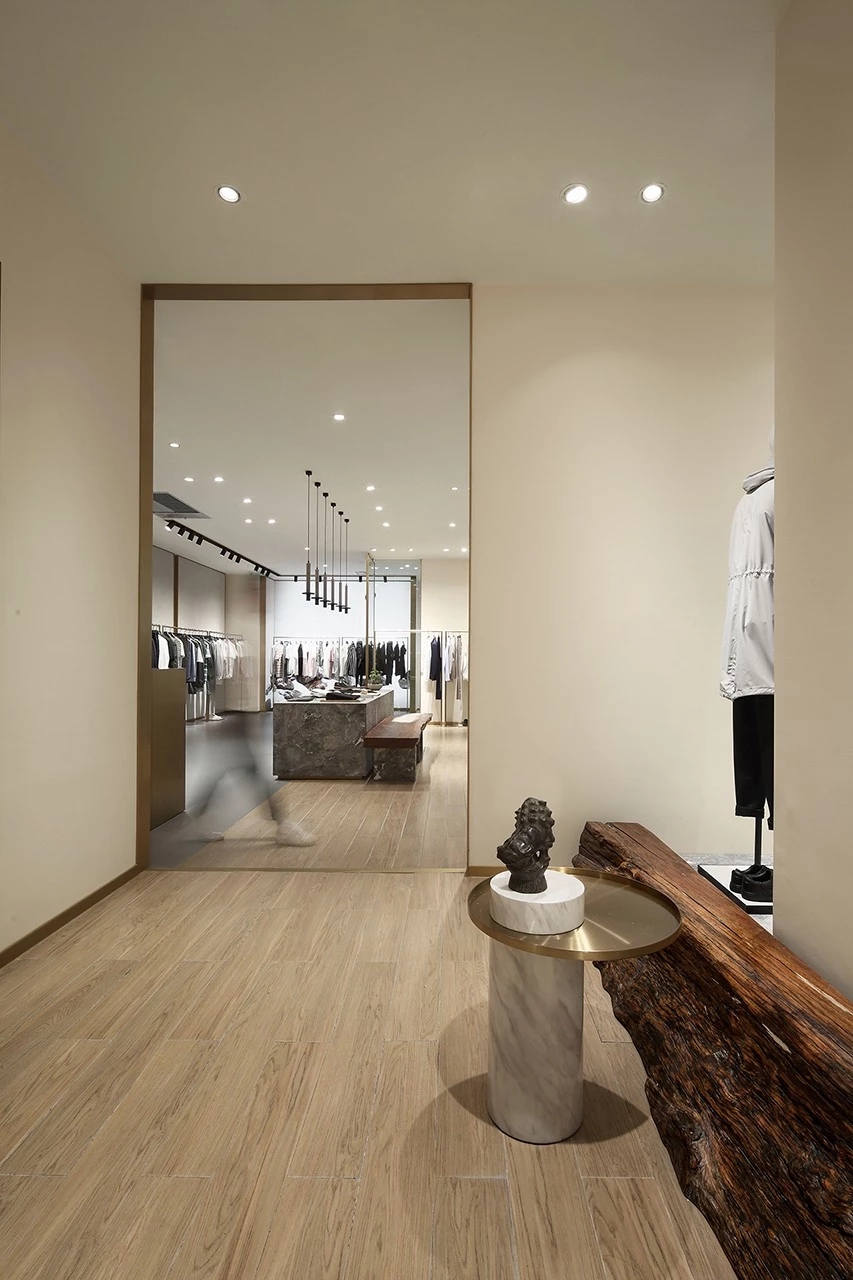 空间以中岛为核心,通过展陈将开放的空间立体化,橱窗到室内的视觉由低到高,依次过渡,墙面背景经由金属收口,分割成不同比例的方形,并通过灯带丰富视觉构成。衣架采用细长的金色拉丝框架置于背景前列,灰色的水泥砖和木地板的组合,在储物柜的位置划分一条简洁的分界,色彩与质感的对比平衡产生了和谐的韵律。