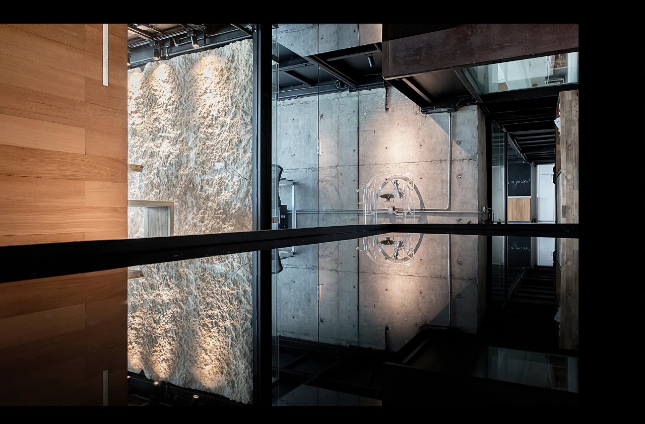 甫入大门,踏上水池上的石板,只听见水声潺潺,一方上下贯通的小前厅就摆在了眼前。大白漆墙,清水泥地,大原木门,这便是进入办公空间的第一印象。楼梯一隅、阁楼办公处的光景、水池那头映入的倒影……或遮或露,从矩形量体中透出一二,既有洒脱泼墨的留白,也有小巧精致的引景,尽显空间虚实架构之精妙。