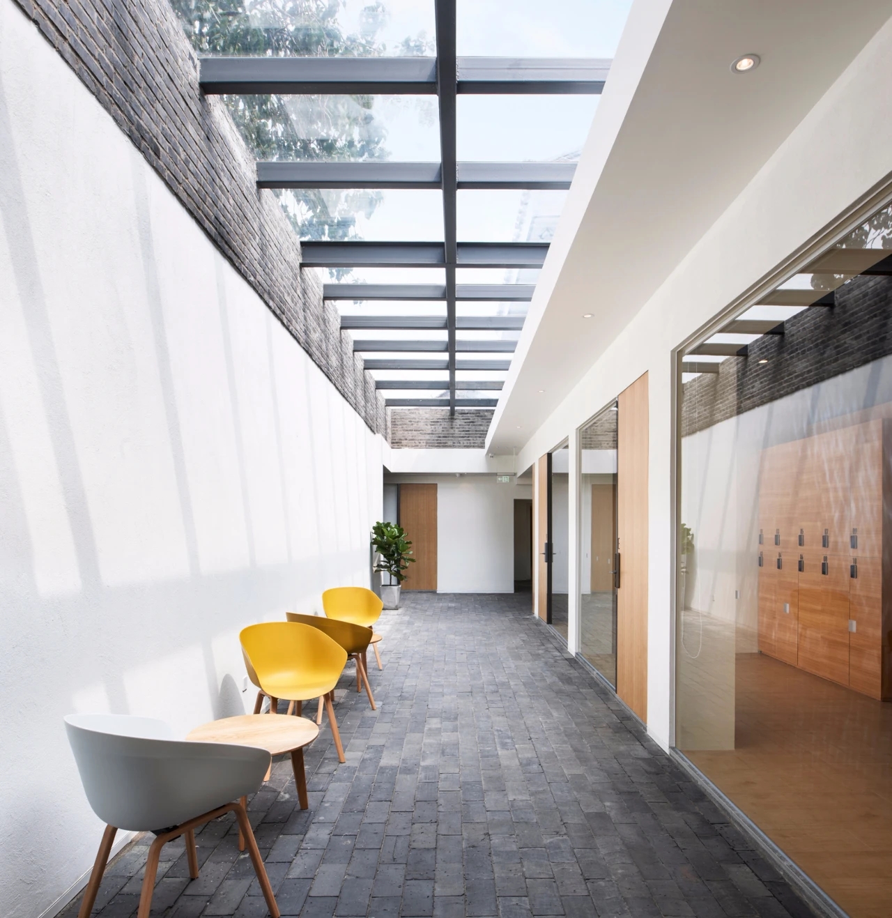 The indoor audiovisual reading area is facing the front courtyard of the white polar. The glass brick hide in the front courtyard wall to bring soft lighting for the room. In the twilight, the warm yellow light reflected from the vitreous brick, interlaced with the modern light and shadow matrix. The eastern corridor of the front yard is a shared corridor for recreation, which help extend the street of hutong and city, forming a ‘half outdoor’ new space.