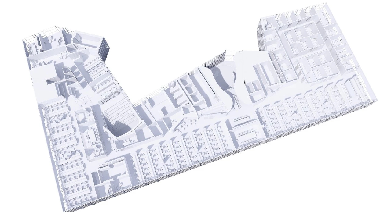 书中除了黄金屋,还能有什么?学习是永无止境的过程,知识就像太空中的繁星,望不到边界,开课吧新办公区的设计概念“银河”由此得来。取自银河不规则的曲线作为主视觉的设计语言,大量复制应用在办公空间的核心区域。以7米多挑高的前台大堂区为核心视觉表达,将传统规则的书架变为非常规的形态,利用镜面钢板铺满天花制造反射叠加的效果,将视觉一下子拉到超过14米的高度,辅以灯带的氛围营造,徜徉书海的画面感即刻生成。