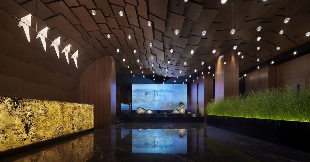 延续穿透的灯光之美开场,室内艺术品的陈列也揉合特色素材与现代手法解译抽象禅风,演绎全新感官体验。比如收银台上的折纸小鸟灯,采用可折叠的合成纸、黄铜和钢材料共同制成,有着雕塑般的独特形态与灵动。