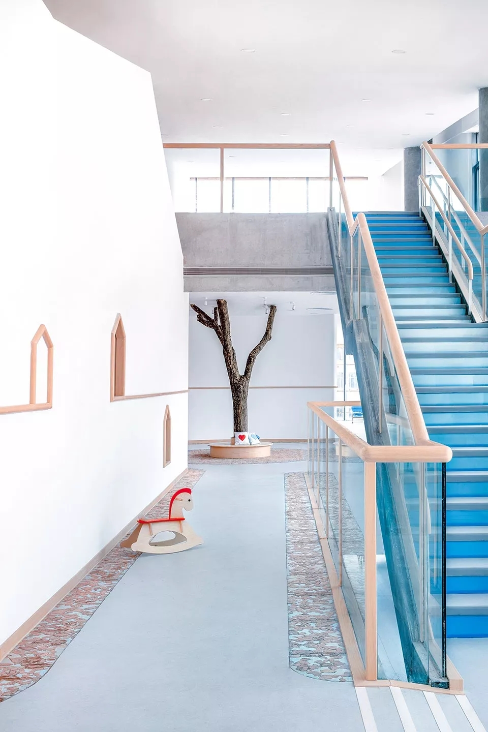 一个蓝色大楼梯连接着每层楼,宛如以前人们改造的运河。从整体来看,房屋与楼梯的布置呈现出一幅自然和谐的画面——座沿河搭建的村庄。如村庄一样,蒙特梭利幼儿园也是一个社区,在这里儿童与成人自由交流、互相学习。