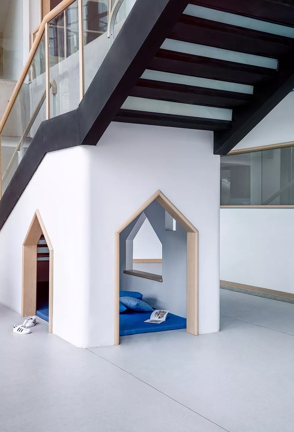原有的建筑物是一个开放空间,整个大空间分作 4 层。设计的首要任务是根据孩子的比例改造空间。加入了许多小房屋的设计,这样可以让孩子更具有主人感和安全感。
