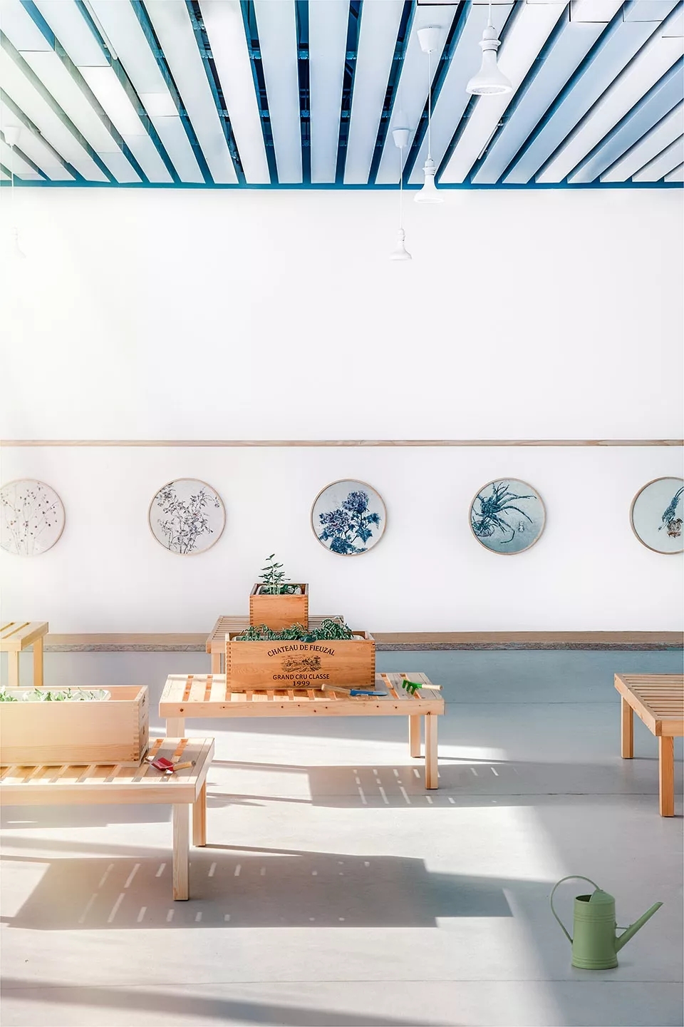 图书馆是一个开放空间,在中央种下一棵树,好似一一个乡村小镇的广场;走廊设计成多功能的开放空间,孩子们可以便捷地到处活动,这样不仅可以提高他们的社交技能,也便于老师的管理;部分走廊还被打造成为田野的模样,让小朋友们可以体验季节的变化。