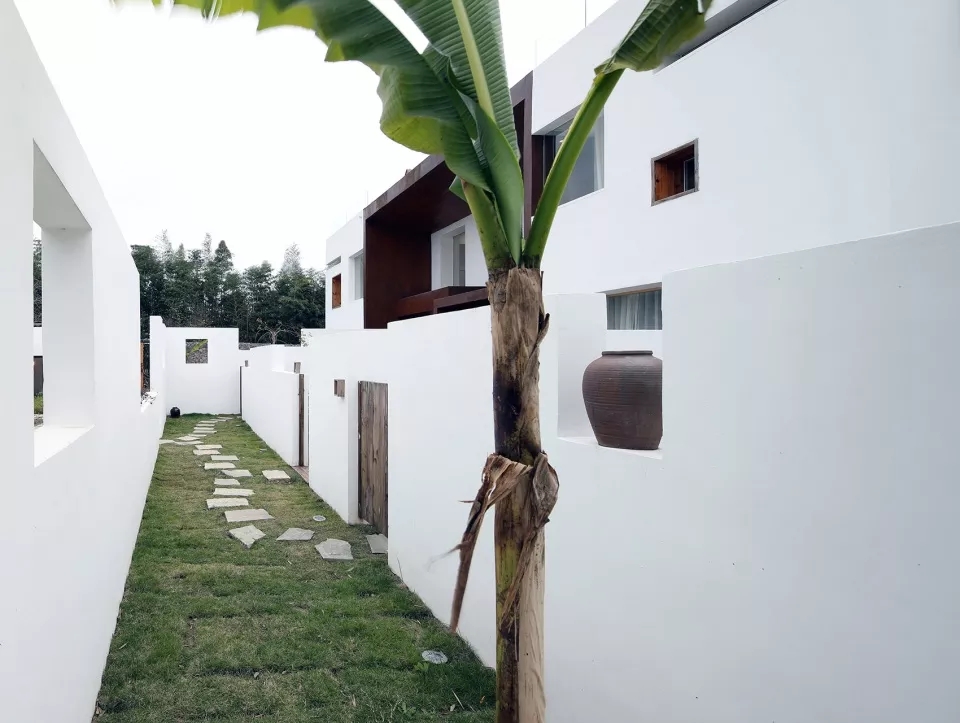 为了让空间产生张力与质感,从原有建筑延申出了几道内院,一个是南北向的一个东西向的。这使得一层的客房不仅变得更加安静与私密,同时也跟域外的城市产生了两极变化。客房透过院子通过高低错落及交错的院墙与外部有了选择性的对话,将域外的城市拉开的更加遥远。
