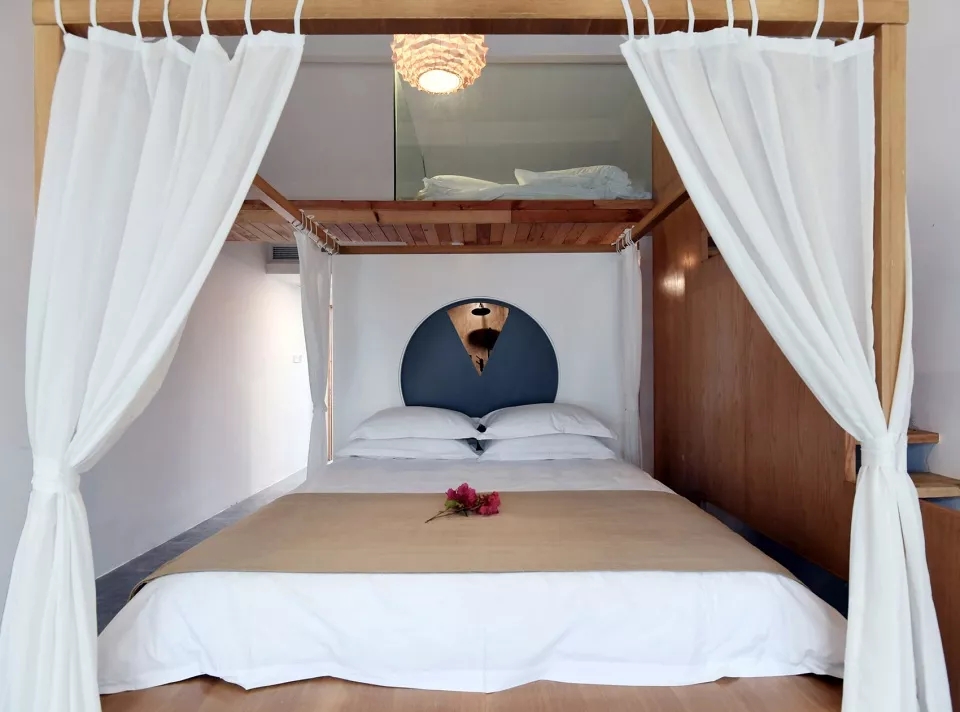 二层客房大小不一的窗洞和落地的窗户更好的让室外的风景引入室内形成差异化的风景。南北通透的窗景将河对岸的竹林和北边闲置绿地联系在一起,让客房暴露在更加荒野的自然中。