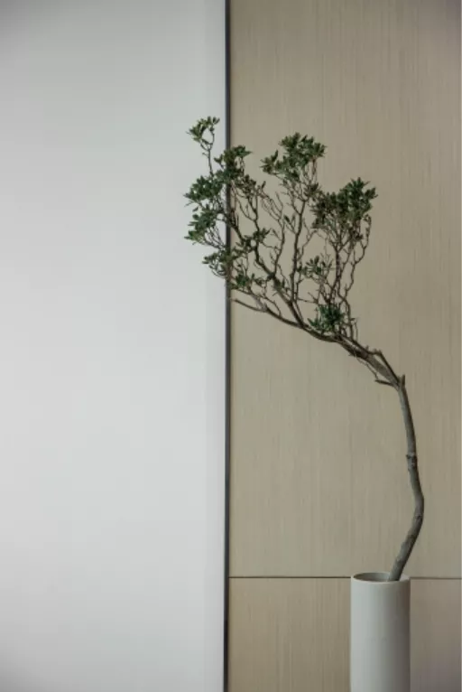 黑、白、木三种简单自然的元素搭配让空间产生一种肃静感。简洁有序的线条在不同的材质间交织链接,利用块面属性质感的差异,强调线与面所形成的空间关系。
