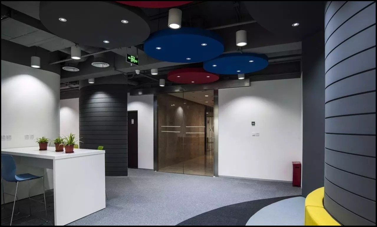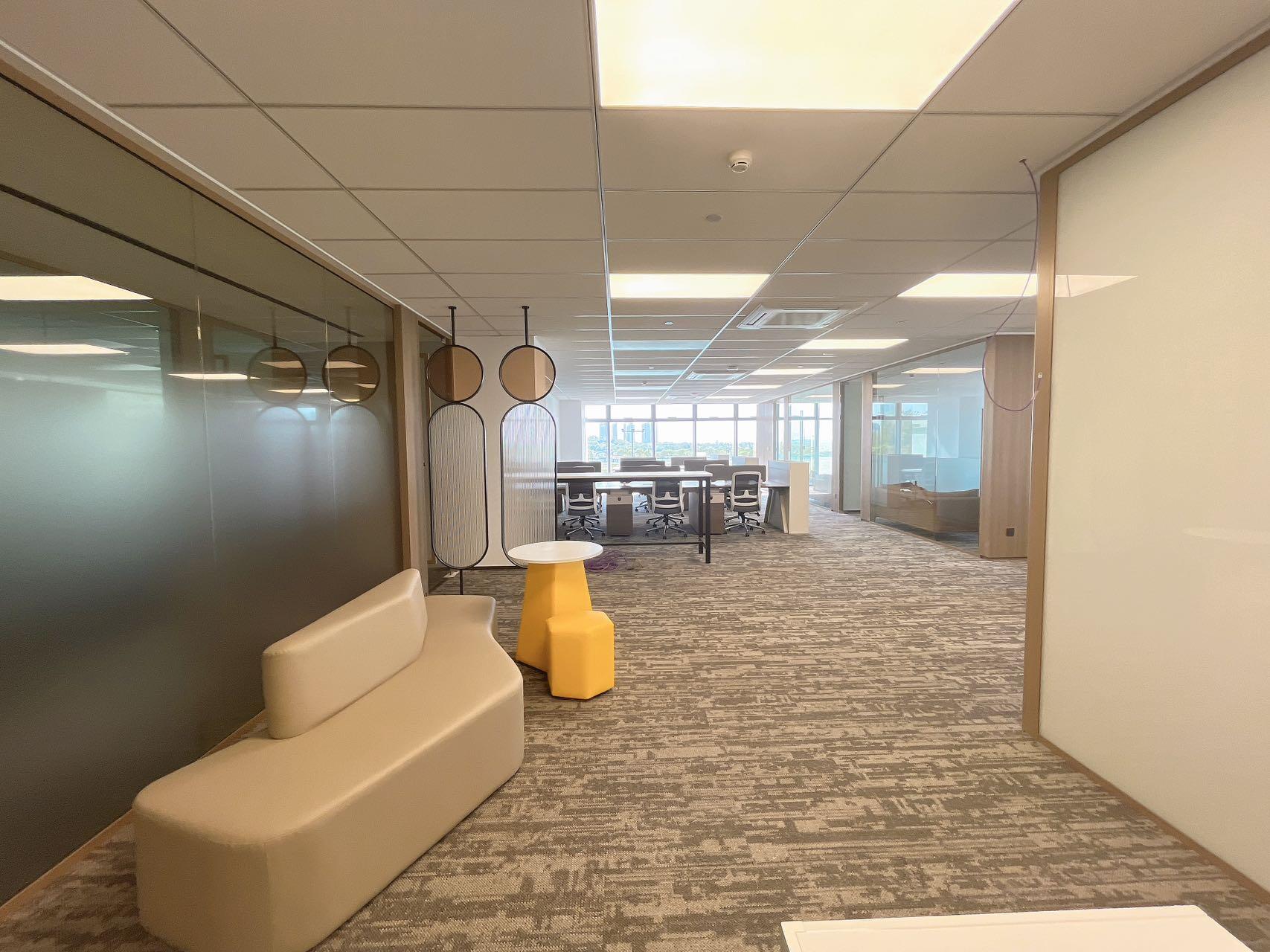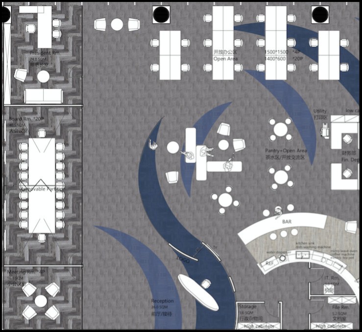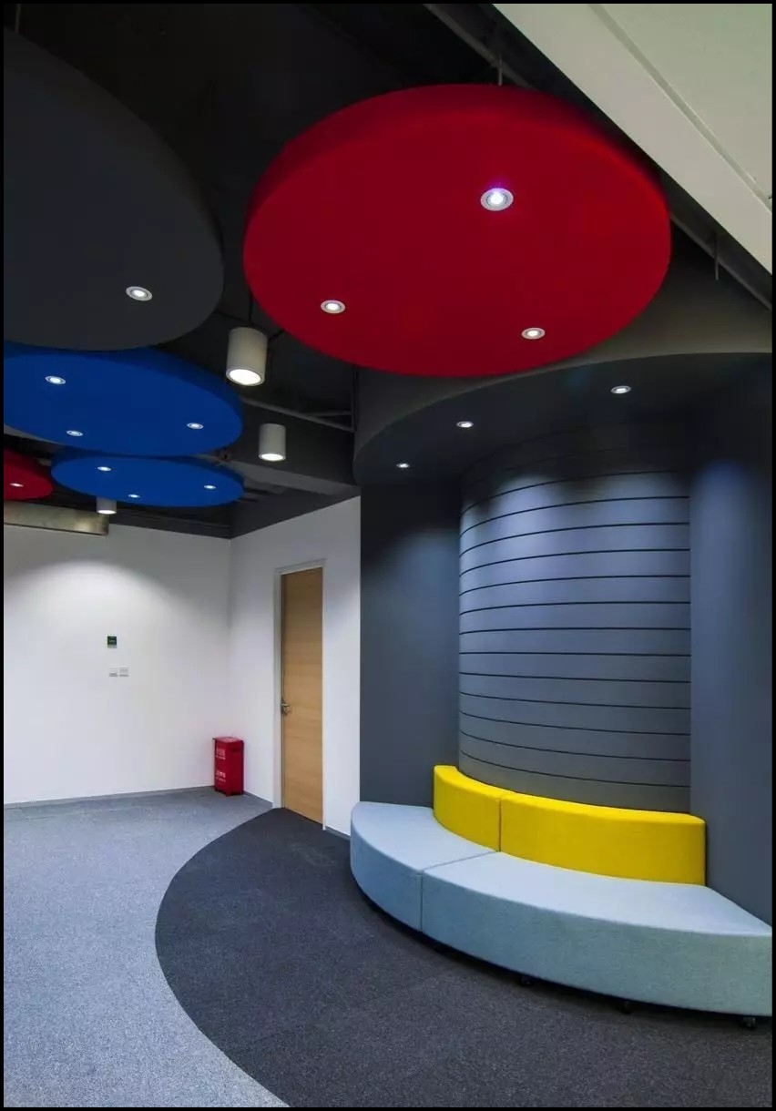 设计师在公共空间地面设计上运用了大面积的曲线造型,包括地毯和木纹LVT,除了起到分隔功能区的作用外,同时地毯造型和配色还是企业logo的变形延伸。企业的精髓融入进了整个空间。
