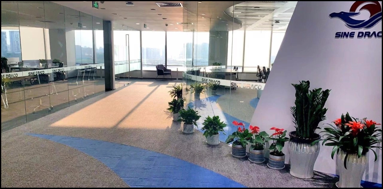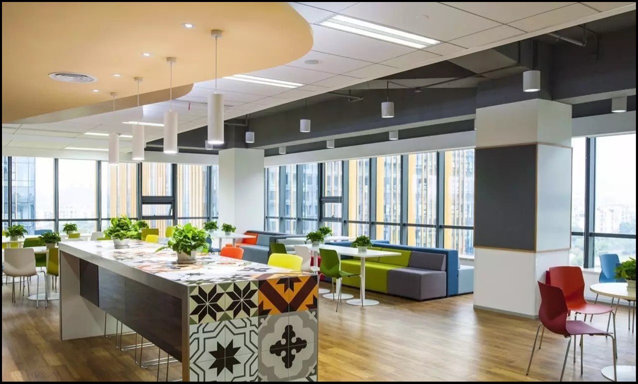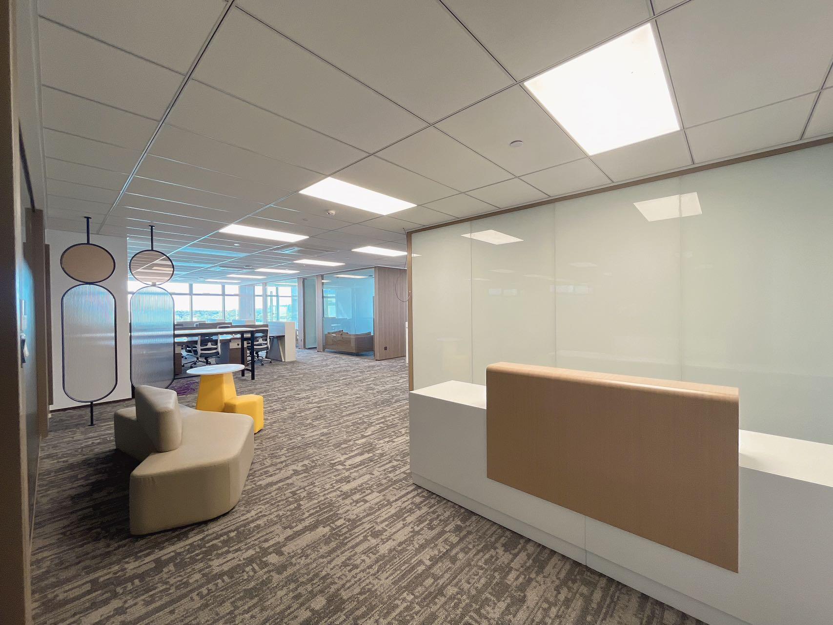 设计师在公共空间地面设计上运用了大面积的曲线造型,包括地毯和木纹LVT,除了起到分隔功能区的作用外,同时地毯造型和配色还是企业logo的变形延伸。企业的精髓融入进了整个空间。