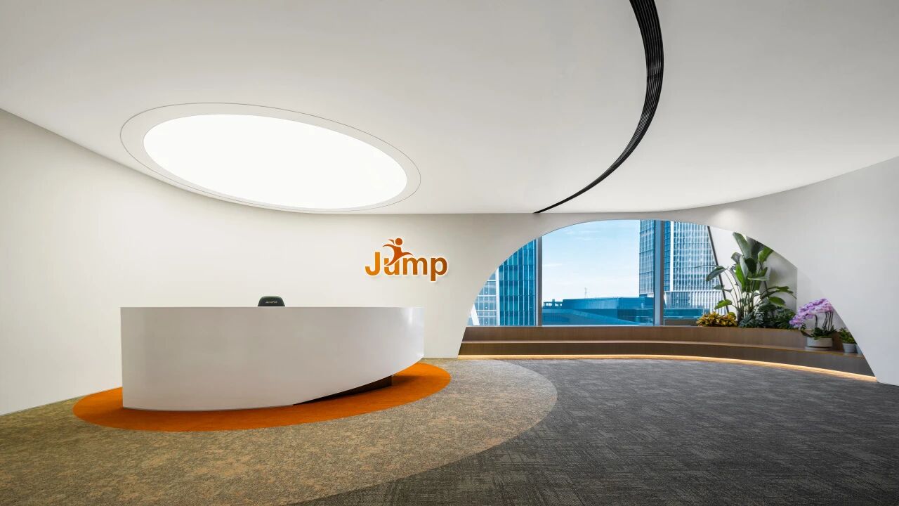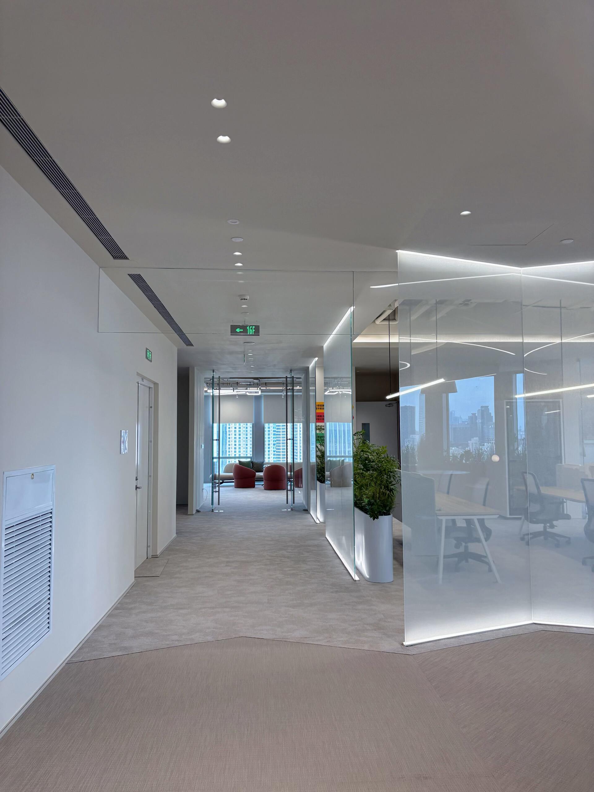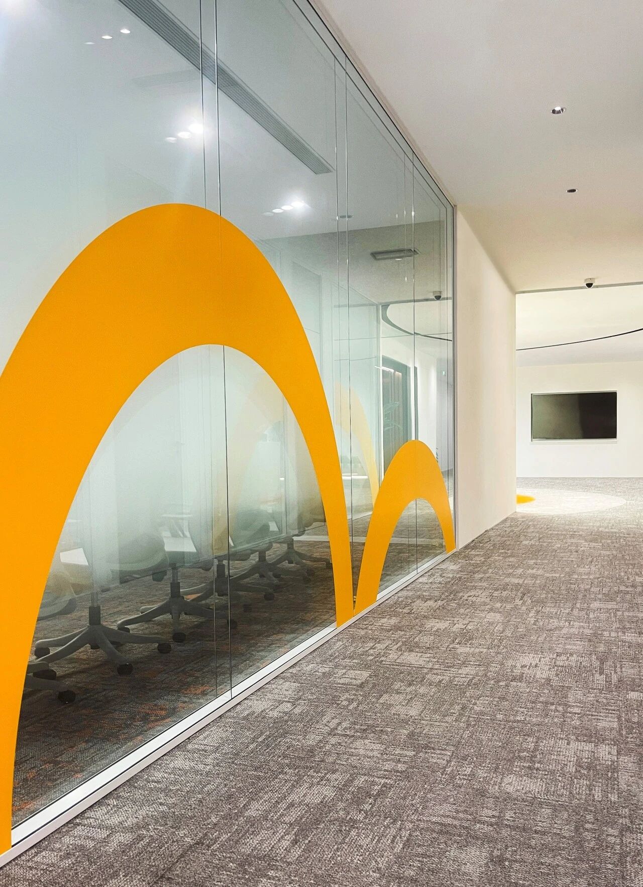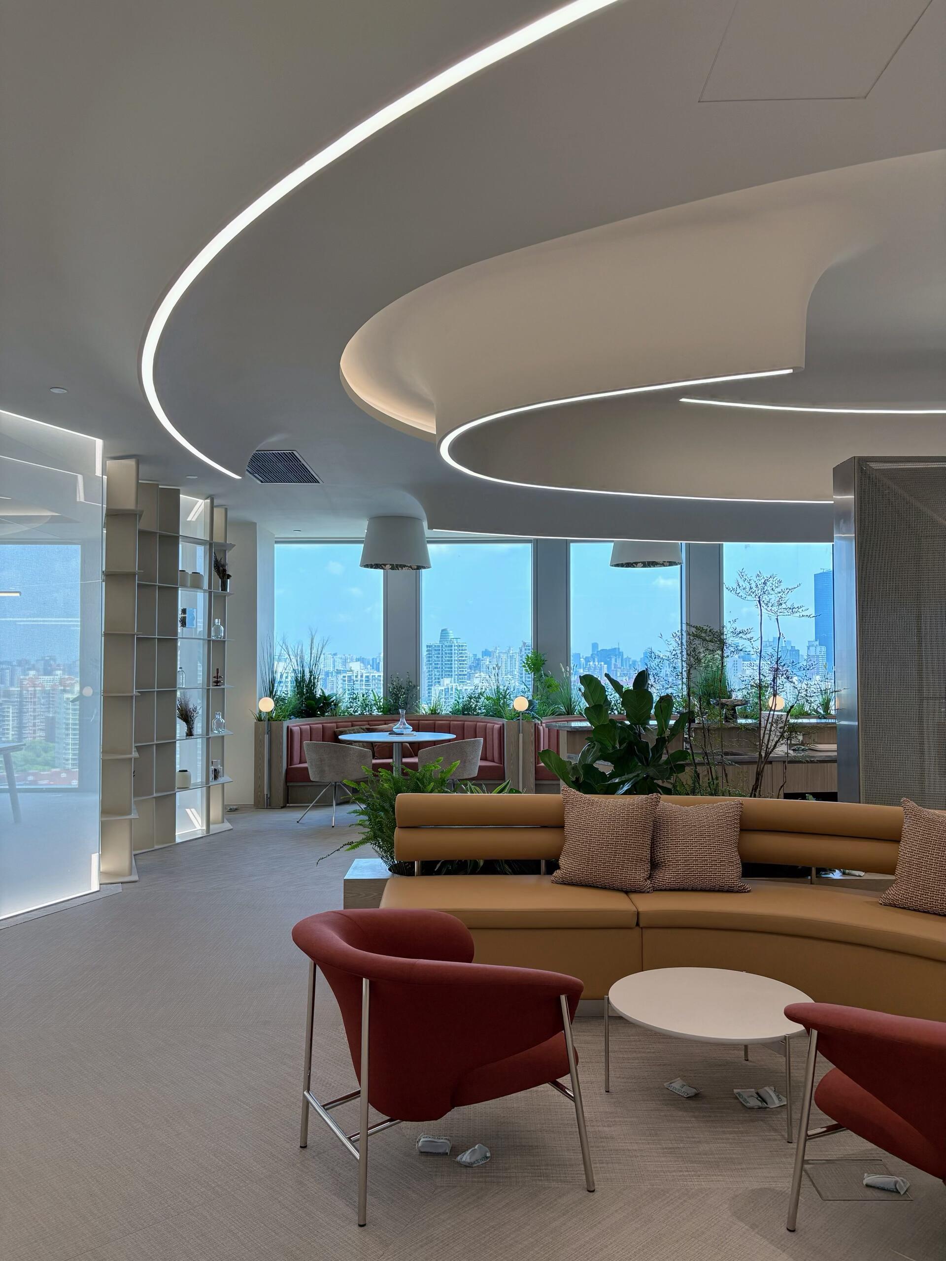 前台区域作为企业对外展示的第一窗口,延续现代简约的风格,弧线天花像是打开的一道光圈,寓意创意灵感的无限延伸,一扇拱形窗景,将外部的城市风景引入室内。简洁大气的线条与材质,用光影和色彩强化品牌识别度。让每一位踏入空间的人,都能感受到跳跃的创新能量。空间以简洁而富有张力的设计语言展现企业的属性。从入口Logo墙到配色与材质的细节,品牌调性在空间中无处不在。