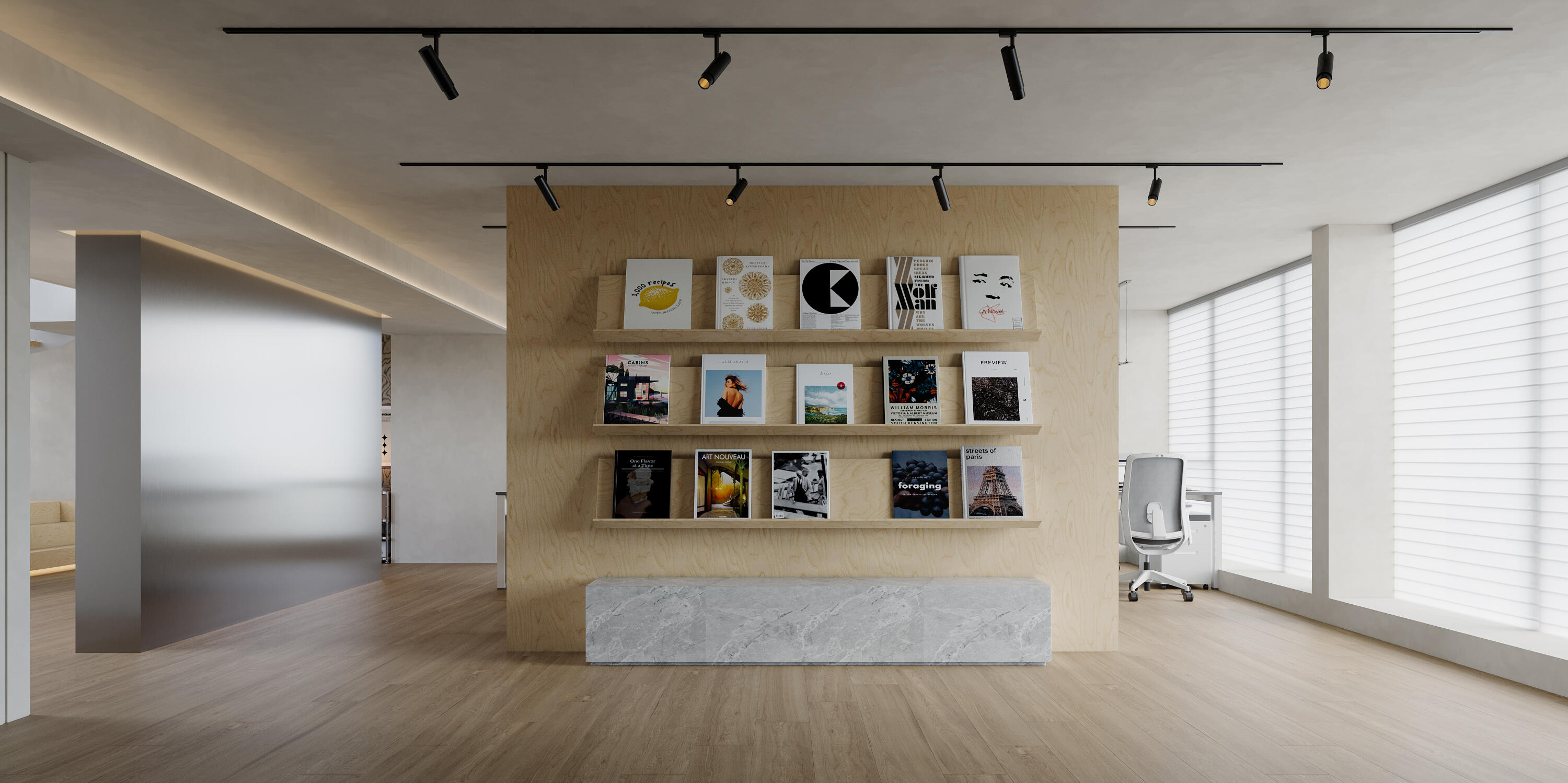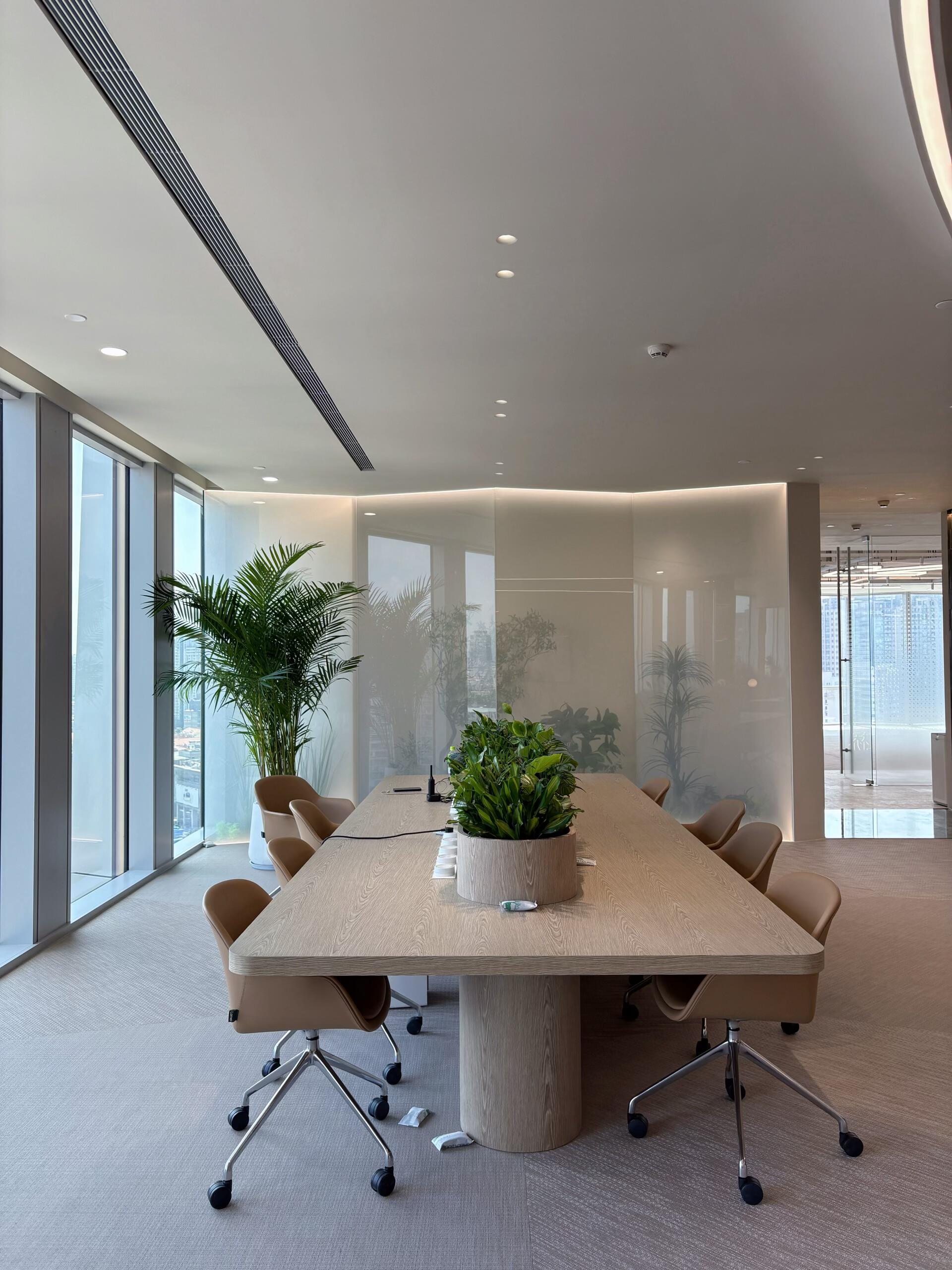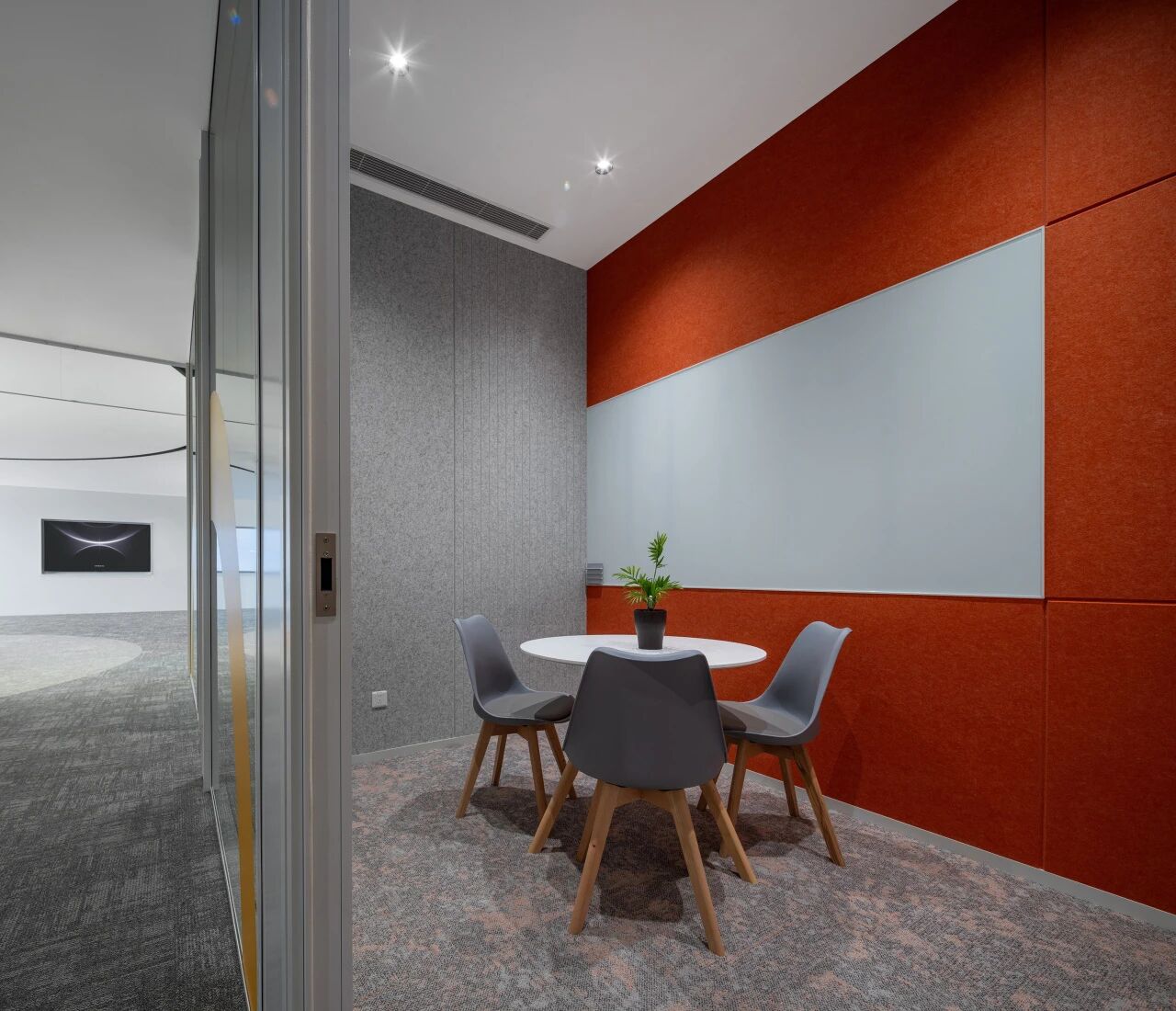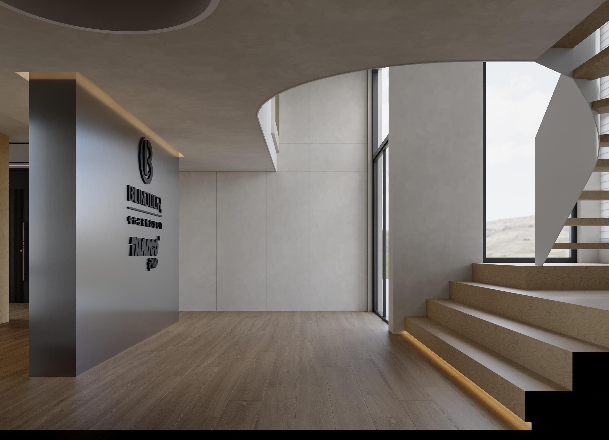 前台区域作为企业对外展示的第一窗口,延续现代简约的风格,弧线天花像是打开的一道光圈,寓意创意灵感的无限延伸,一扇拱形窗景,将外部的城市风景引入室内。简洁大气的线条与材质,用光影和色彩强化品牌识别度。让每一位踏入空间的人,都能感受到跳跃的创新能量。空间以简洁而富有张力的设计语言展现企业的属性。从入口Logo墙到配色与材质的细节,品牌调性在空间中无处不在。
