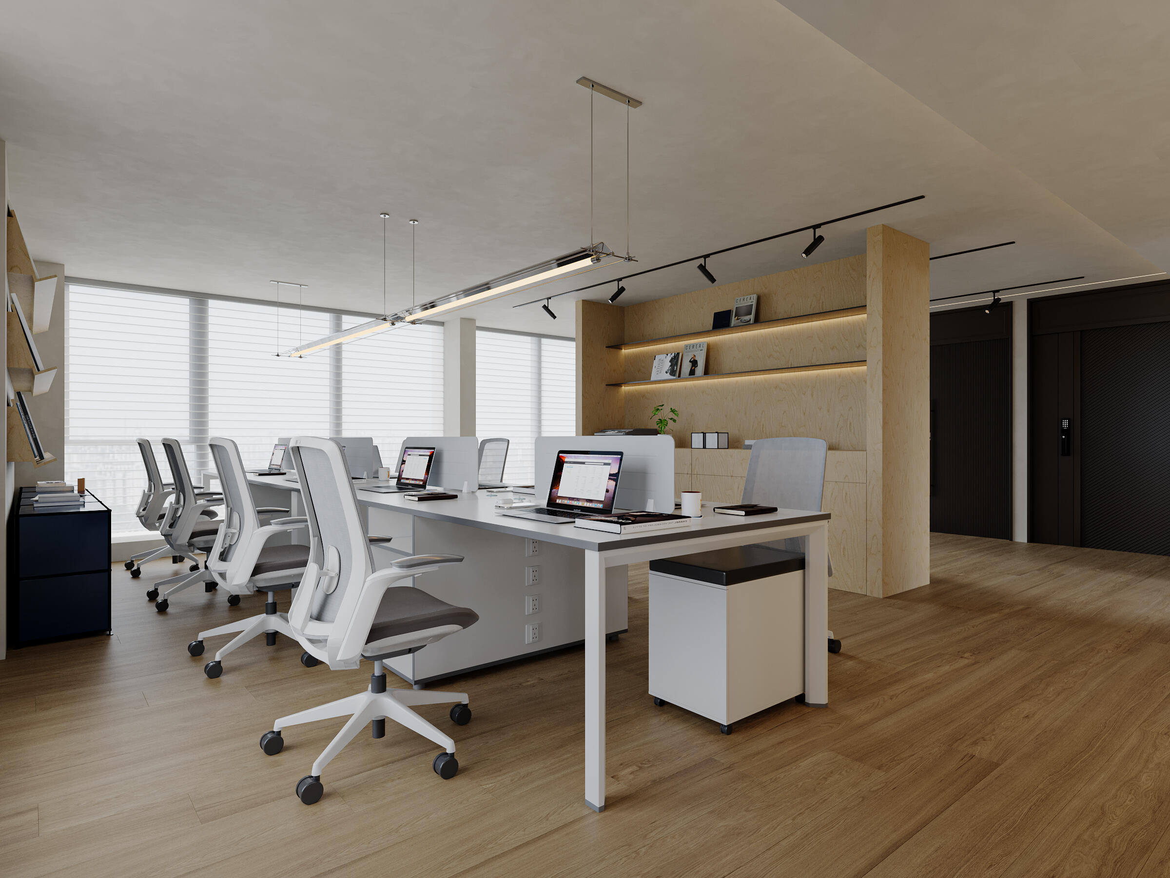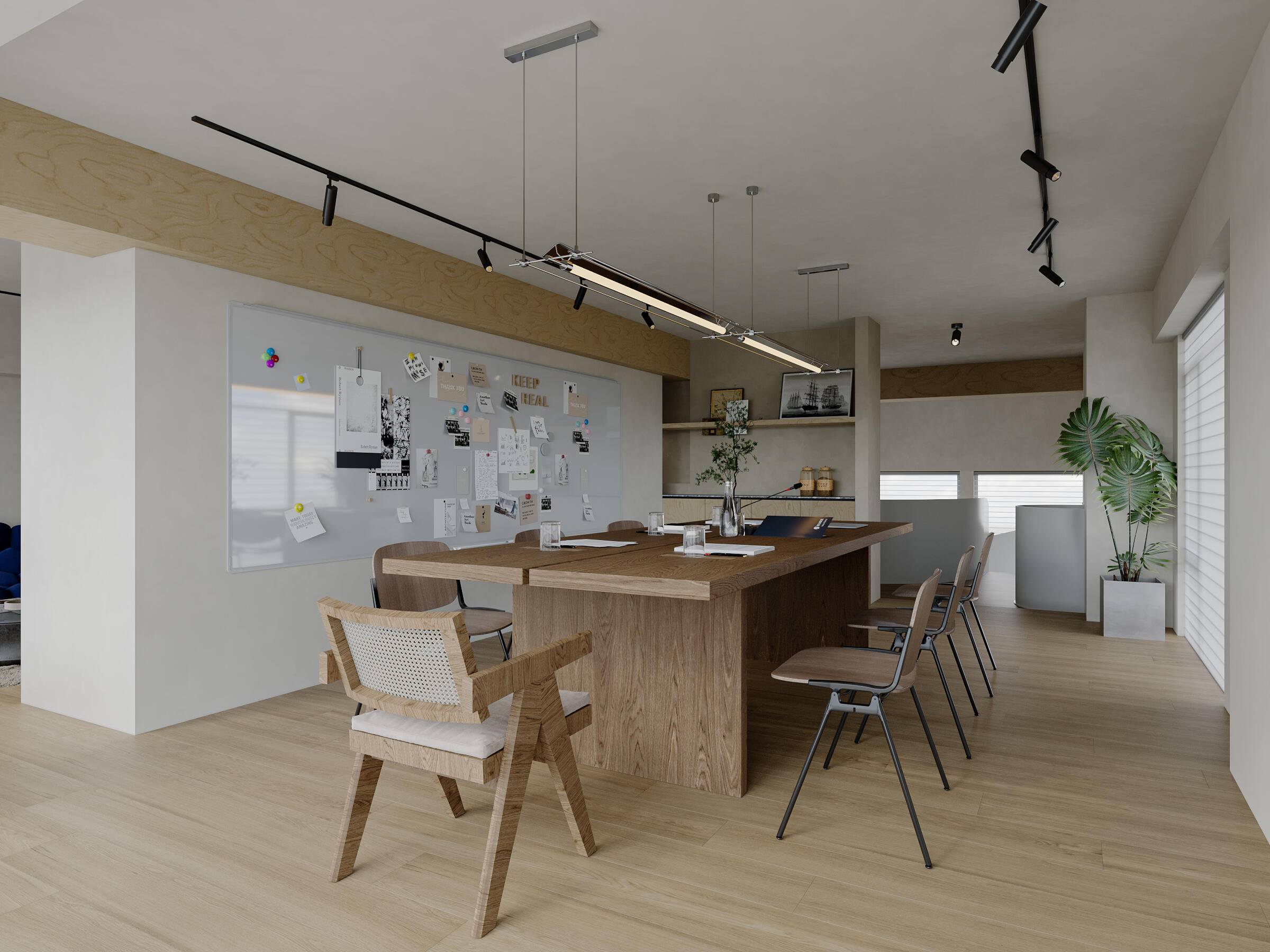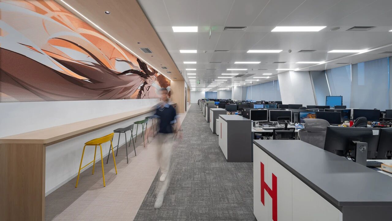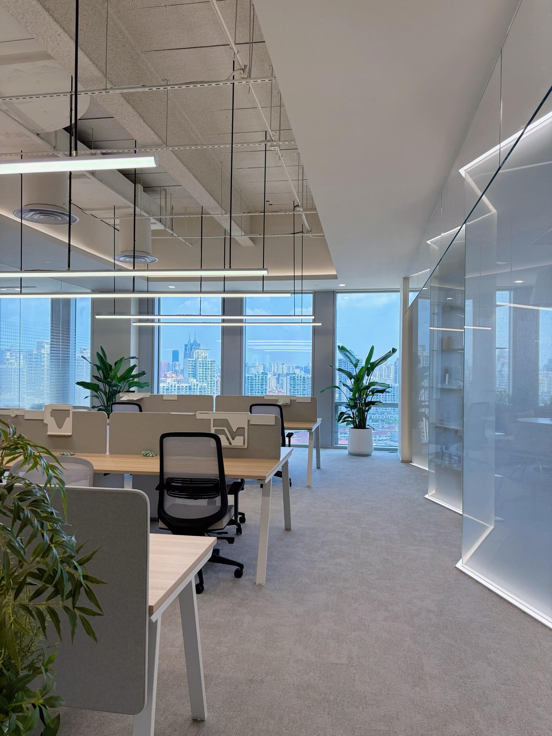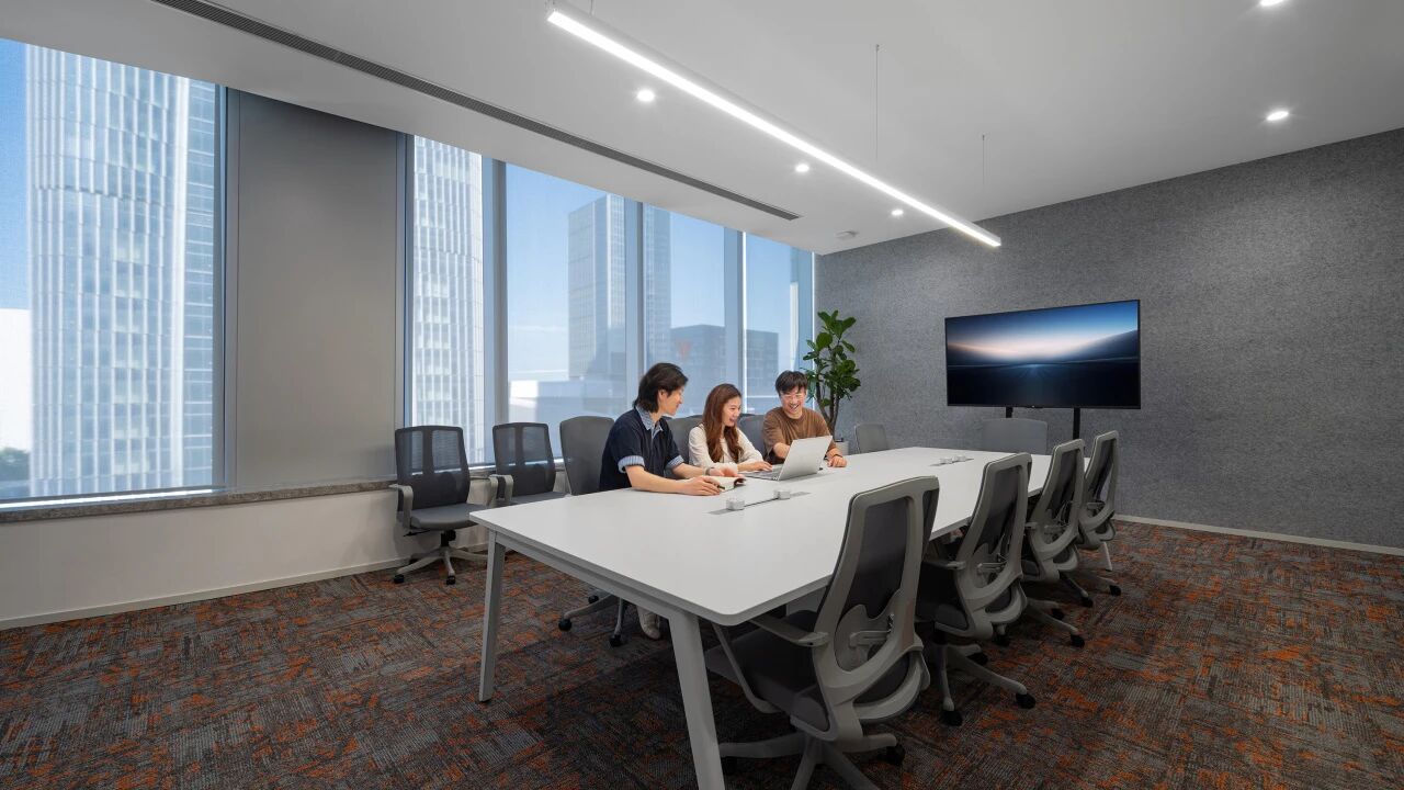 前台区域作为企业对外展示的第一窗口,延续现代简约的风格,弧线天花像是打开的一道光圈,寓意创意灵感的无限延伸,一扇拱形窗景,将外部的城市风景引入室内。简洁大气的线条与材质,用光影和色彩强化品牌识别度。让每一位踏入空间的人,都能感受到跳跃的创新能量。空间以简洁而富有张力的设计语言展现企业的属性。从入口Logo墙到配色与材质的细节,品牌调性在空间中无处不在。