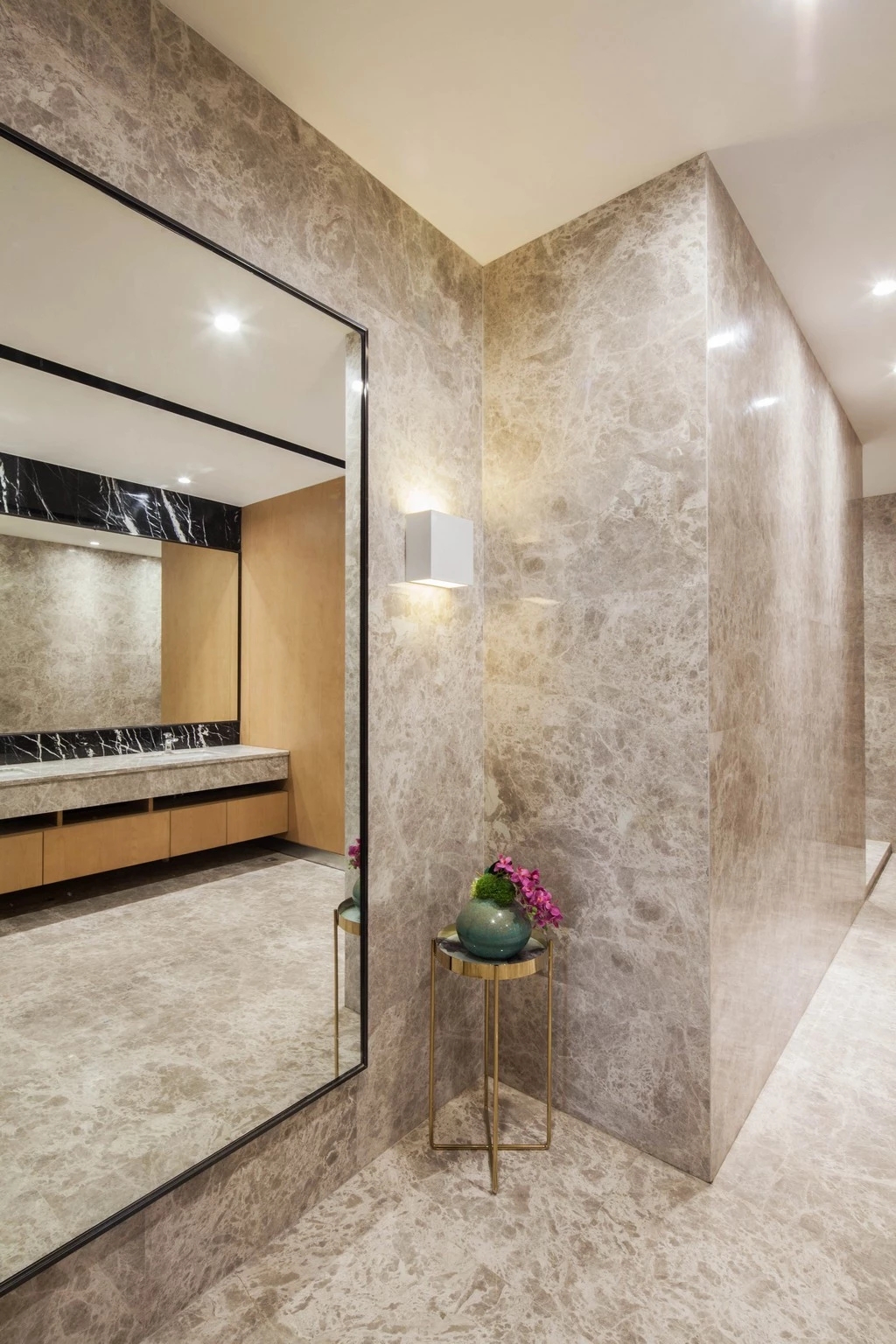 材料的使用方面,地面采用了大理石和高端塑胶仿木纹地板,这些材质的甲醛含量均为零。墙面采用实木贴皮及硬包板,均通过工厂预制现场拼装的施工方法,将现场施工的污染降到最低。家具、灯具及软装配饰都是根据整体设计风格定制设计,能够完美地与办公室内设计风格融为一体。