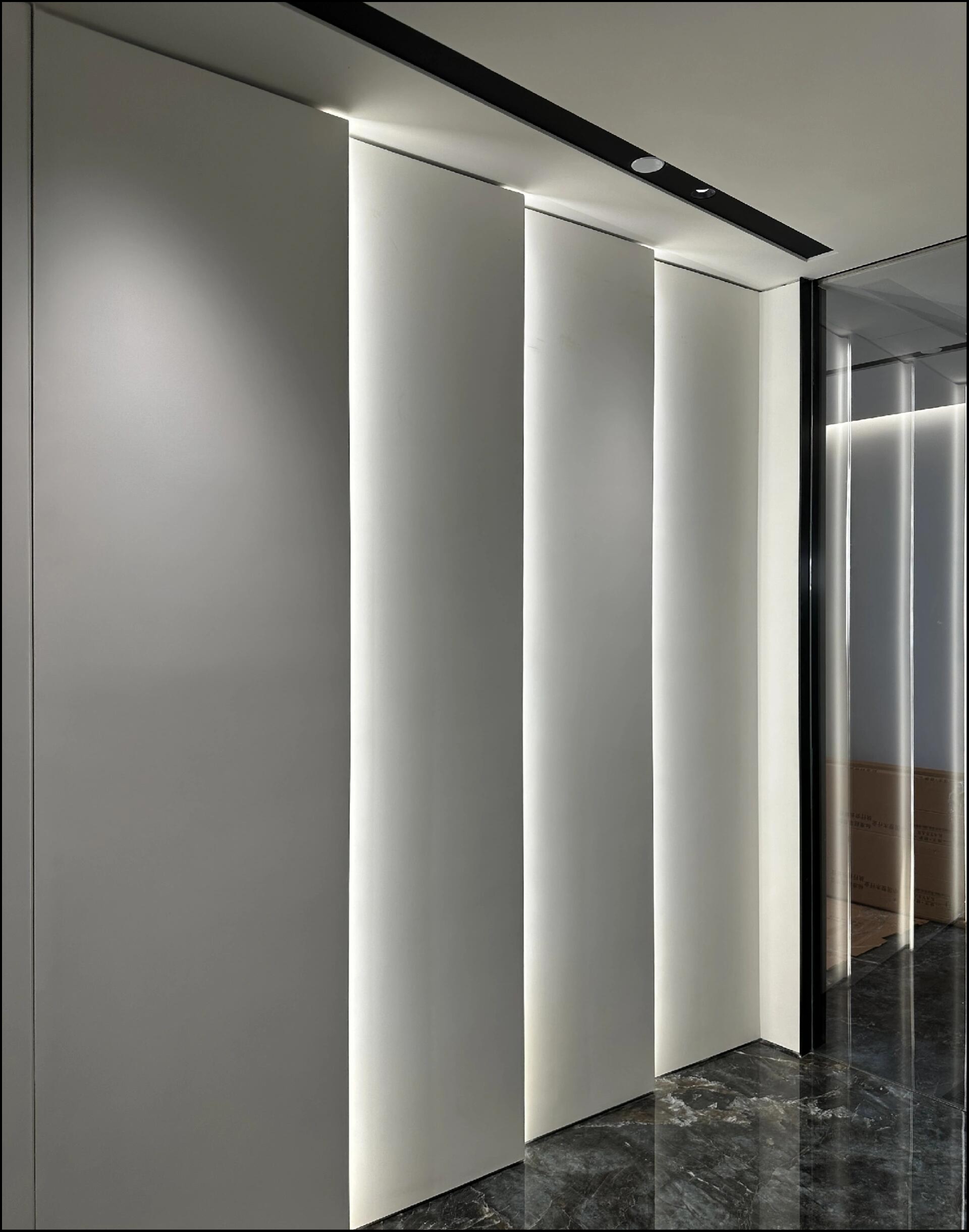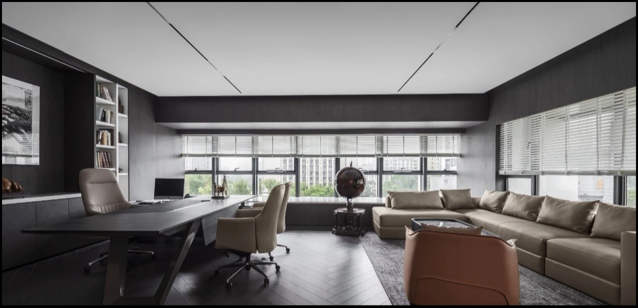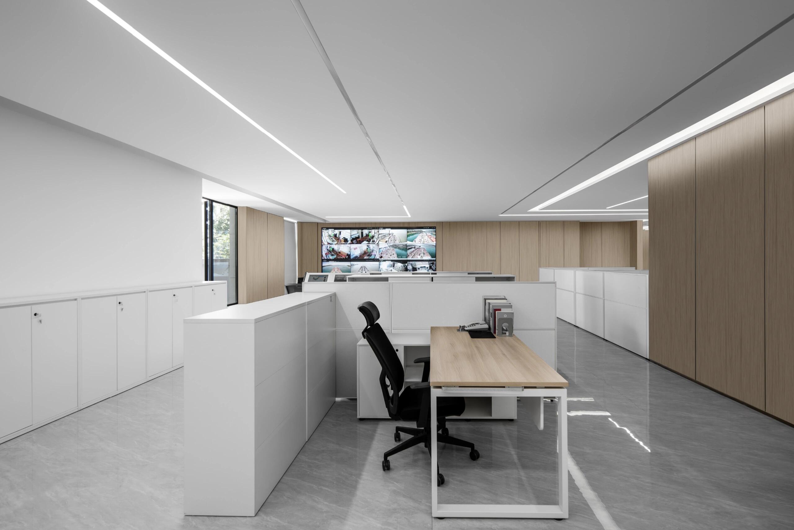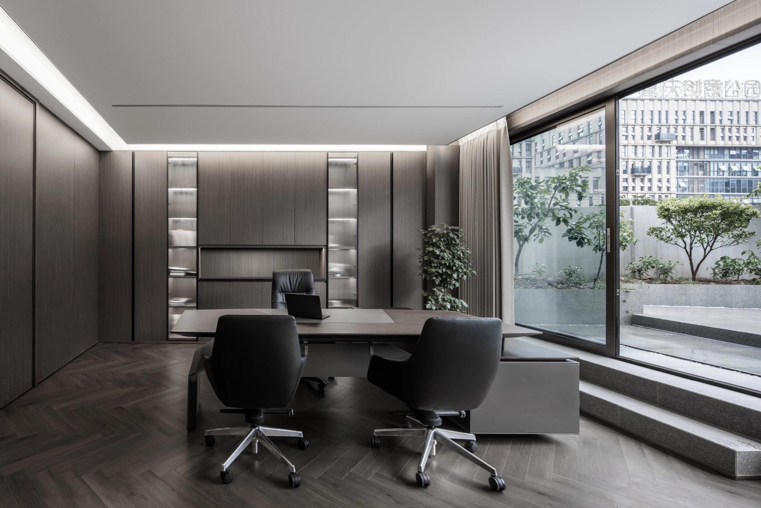 员工办公区,设计巧思注入进菱形和弧形的“变异”之中,让办公状态自由而相对独立,打破办公沟通屏障之后,办公效率有效提升。高层办公区的空间排列、道道智能化门禁系统传递出层层递进的秩序感,董事长办公室以高级灰为调性,线条在极简设计中造作,品质主材与隐射灯带的绝妙搭配透露出空间的豪奢内涵,空间更显沉稳大气。