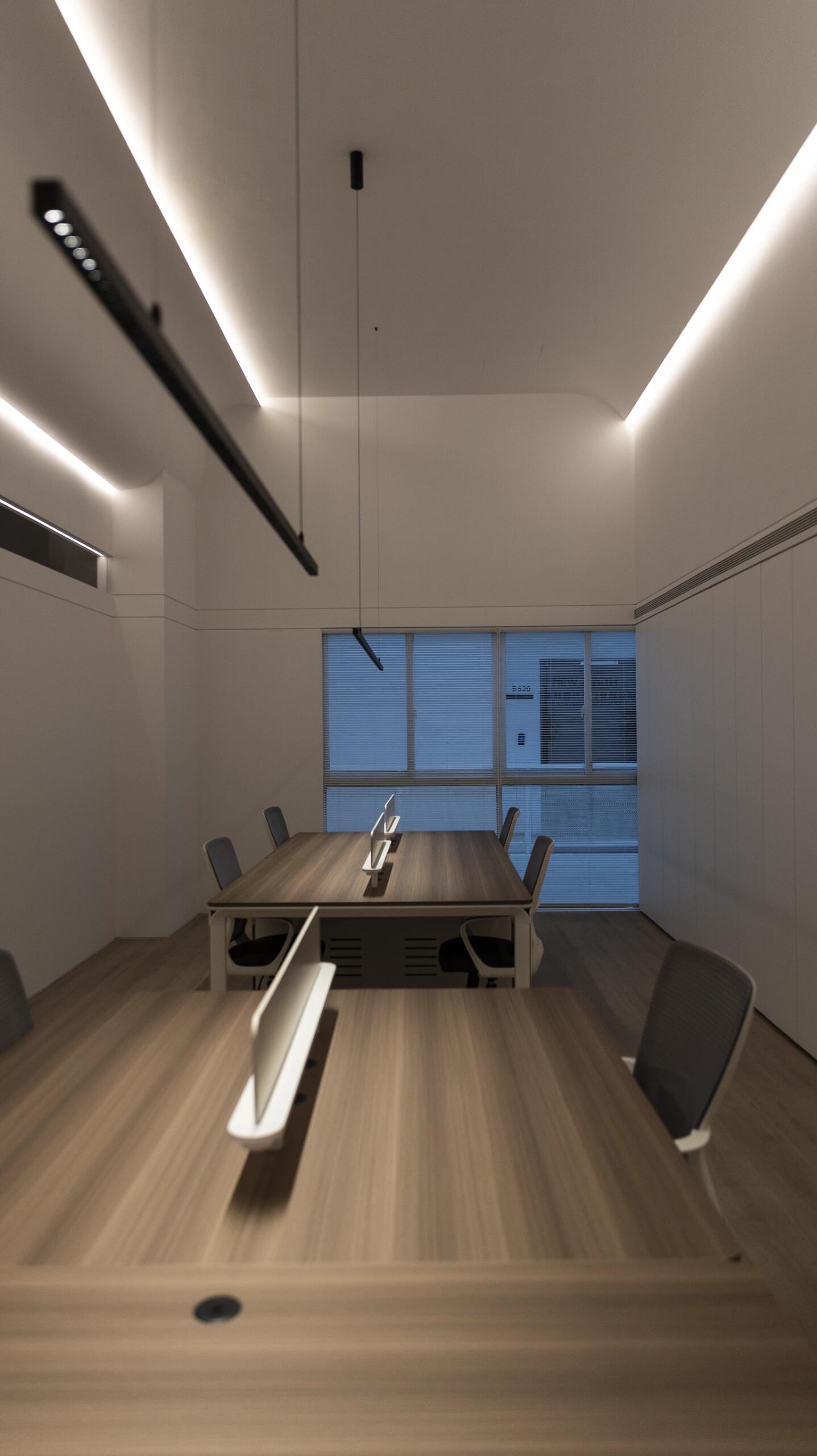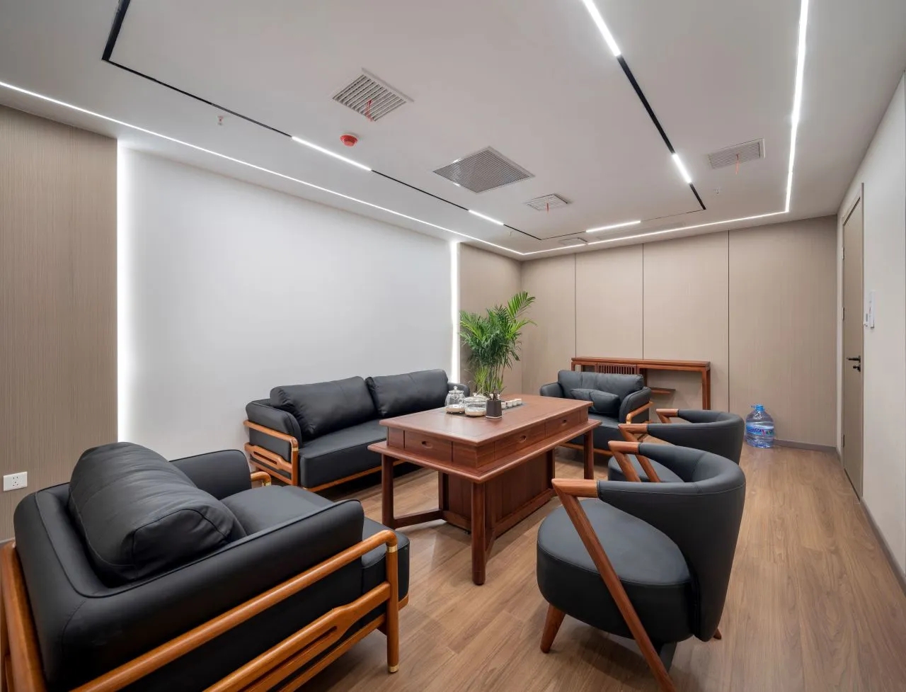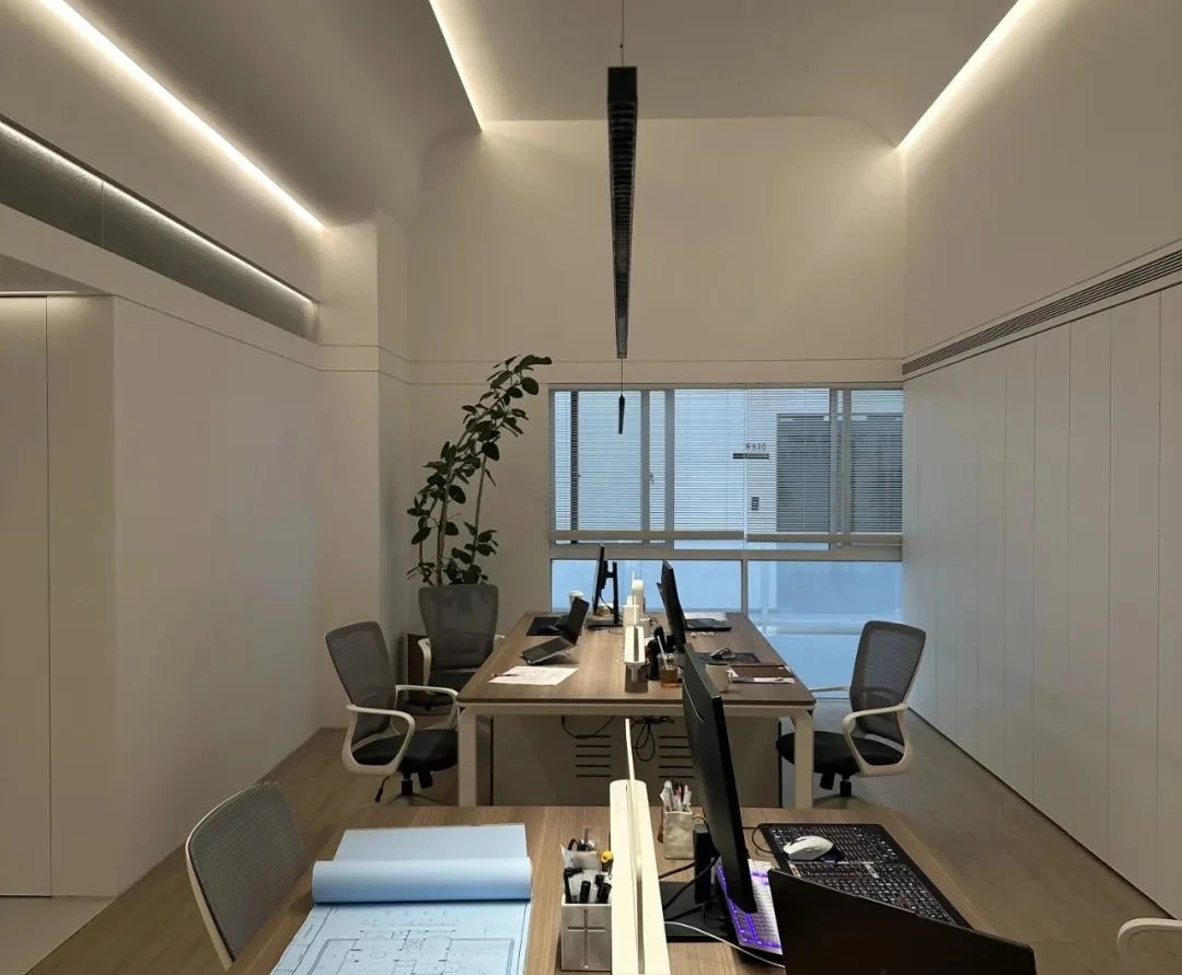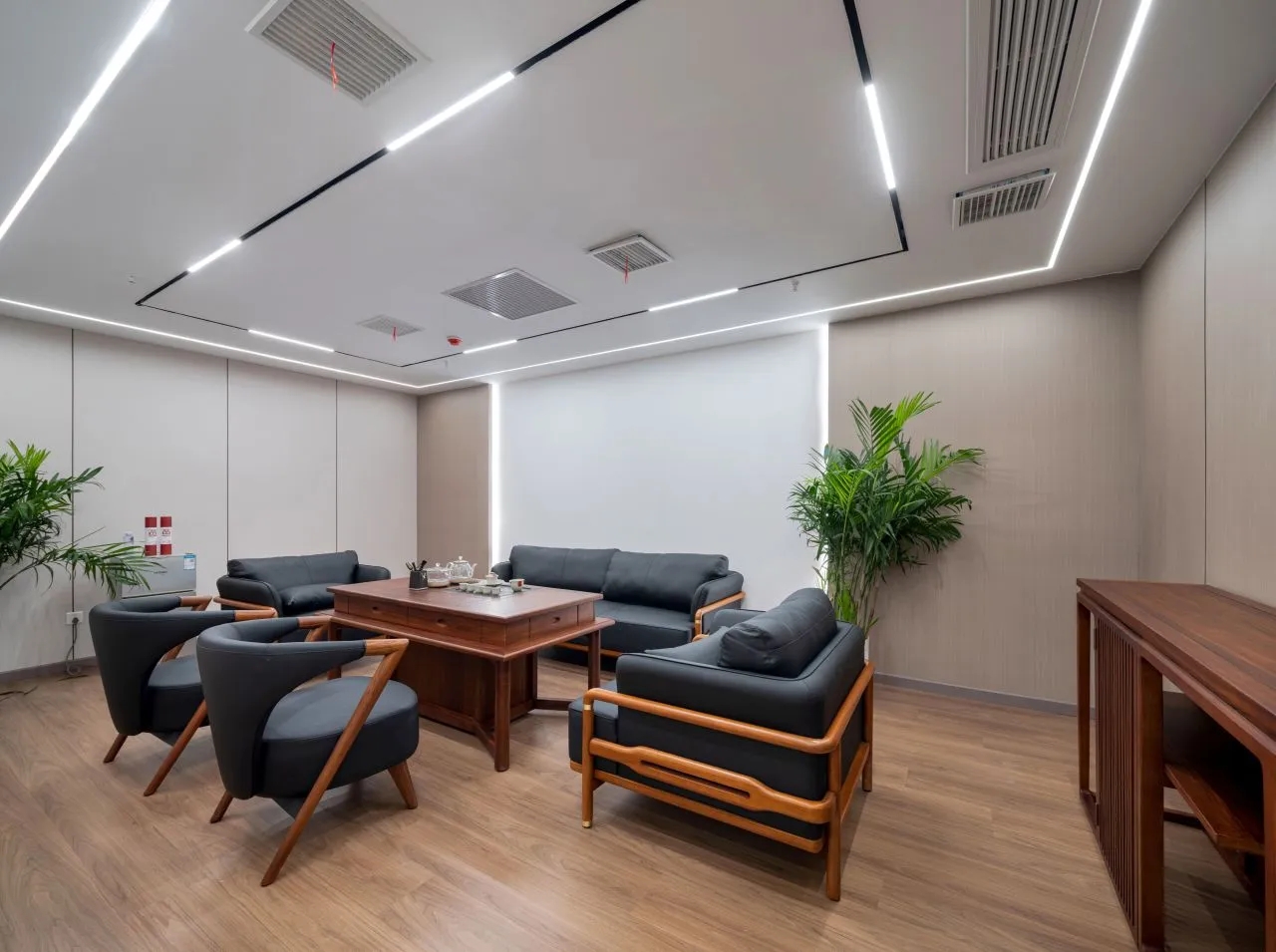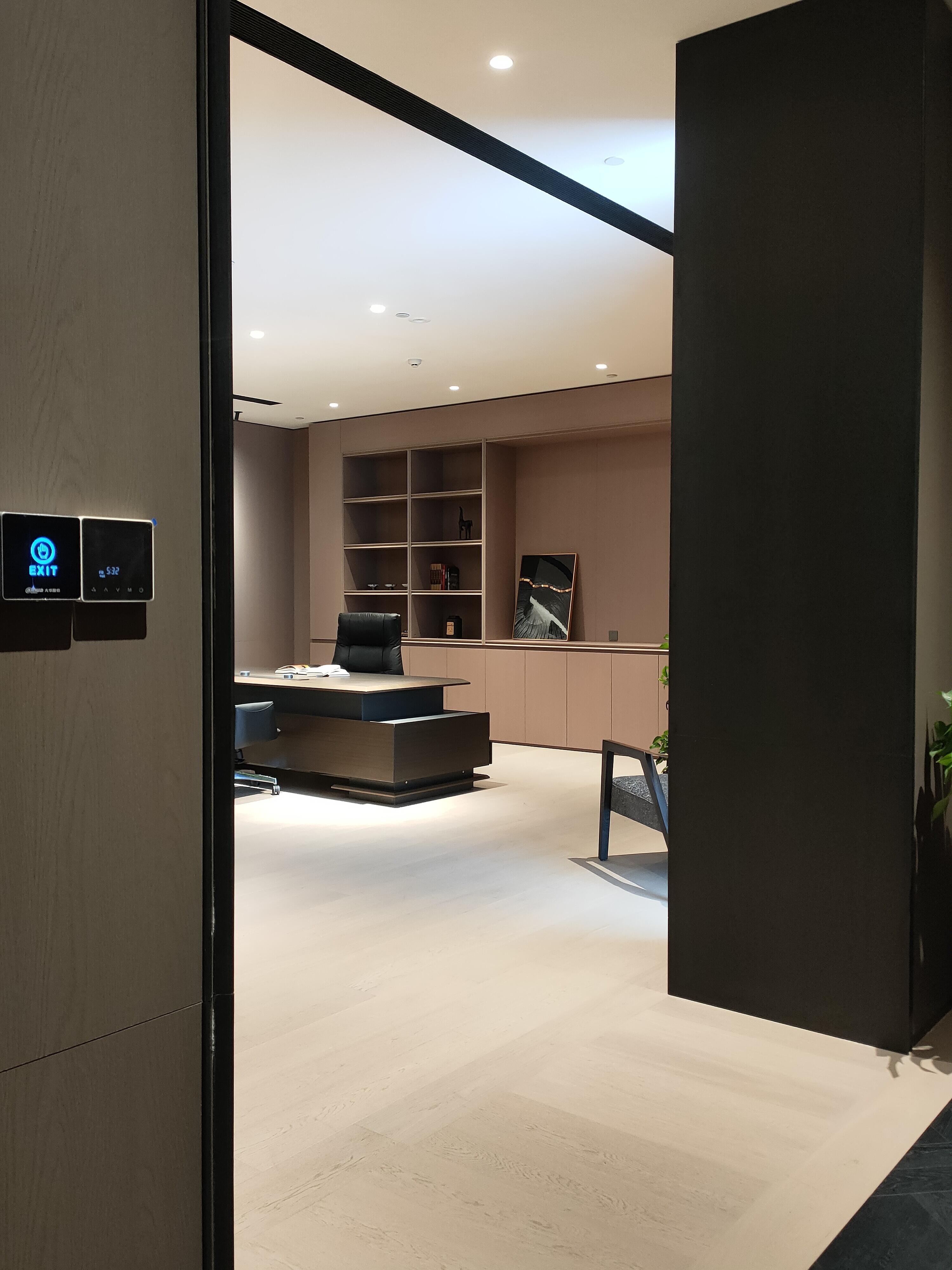 舒适和功能的结合:我们在设计阶段充分考虑了主入口的功能分区。入口左侧为通往二层独立接待室的楼梯,右侧则为办公区,实现了整个空间的动静分离。该空间的原始层高约为4.8米,为了给员工提供最大化的工作舒适度,我们将其设计为挑空区,提升了空间的通透感。顶面左侧的“S”形弧度设计并非单纯为了造型,而是为了解决建筑大梁和空调风道的功能性需求。整个吊顶设计将美学与功能融为一体,中间的细节凹缝贯穿整个空间,形成了层次感。右侧结合空调风管处理,增设了一整排暗门储藏柜,既满足了收纳需求,又保持了空间的整洁与美观。