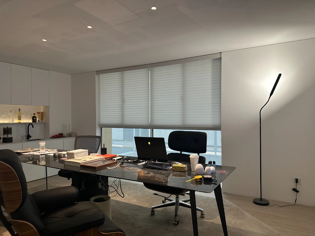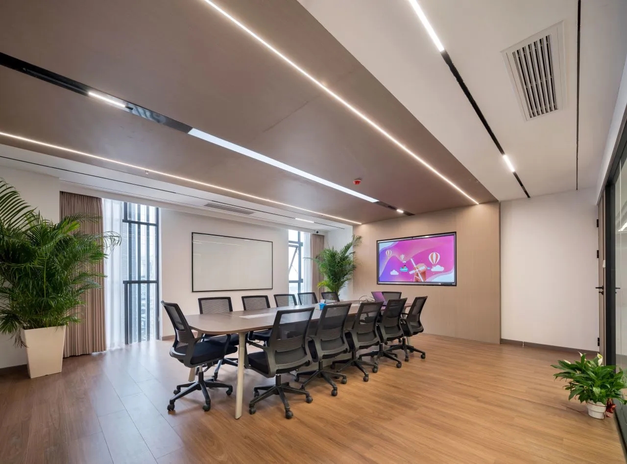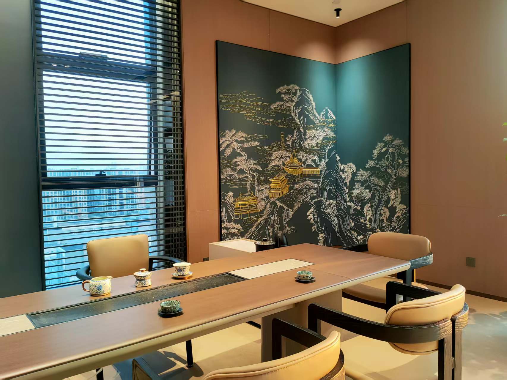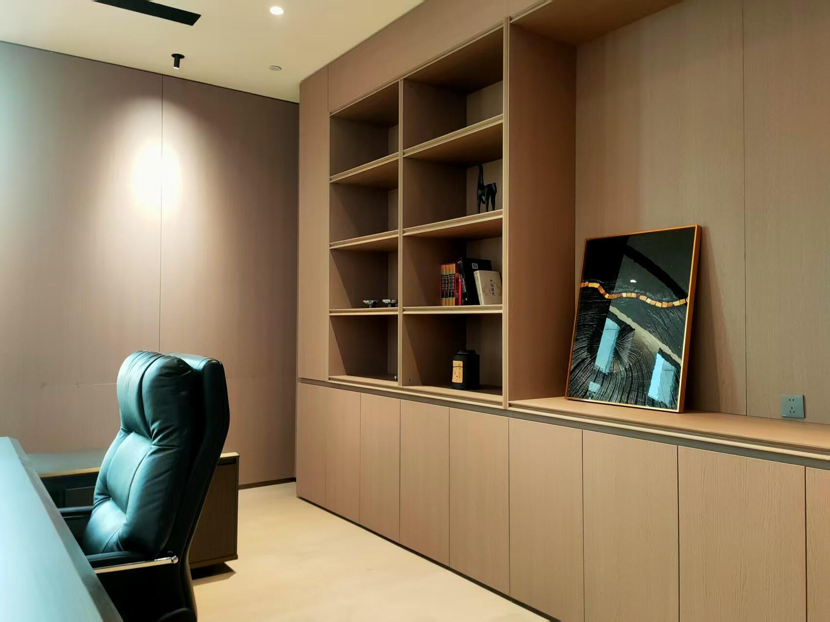 舒适和功能的结合:我们在设计阶段充分考虑了主入口的功能分区。入口左侧为通往二层独立接待室的楼梯,右侧则为办公区,实现了整个空间的动静分离。该空间的原始层高约为4.8米,为了给员工提供最大化的工作舒适度,我们将其设计为挑空区,提升了空间的通透感。顶面左侧的“S”形弧度设计并非单纯为了造型,而是为了解决建筑大梁和空调风道的功能性需求。整个吊顶设计将美学与功能融为一体,中间的细节凹缝贯穿整个空间,形成了层次感。右侧结合空调风管处理,增设了一整排暗门储藏柜,既满足了收纳需求,又保持了空间的整洁与美观。