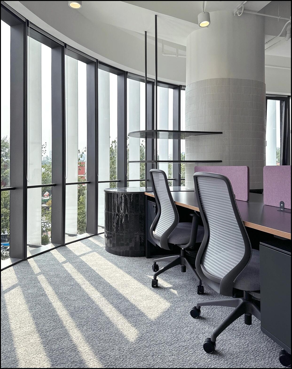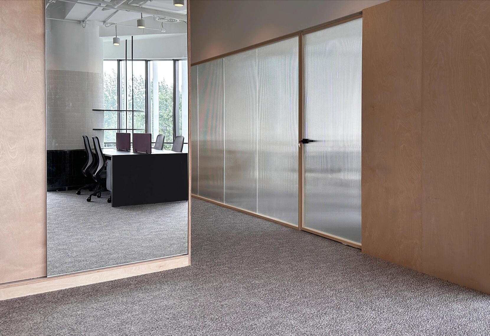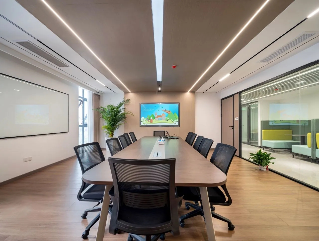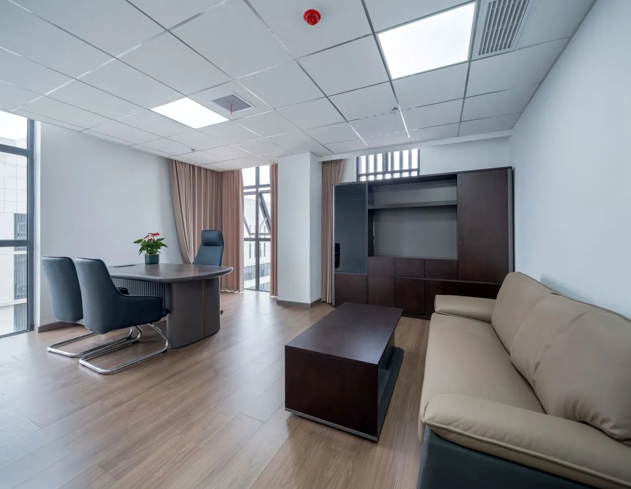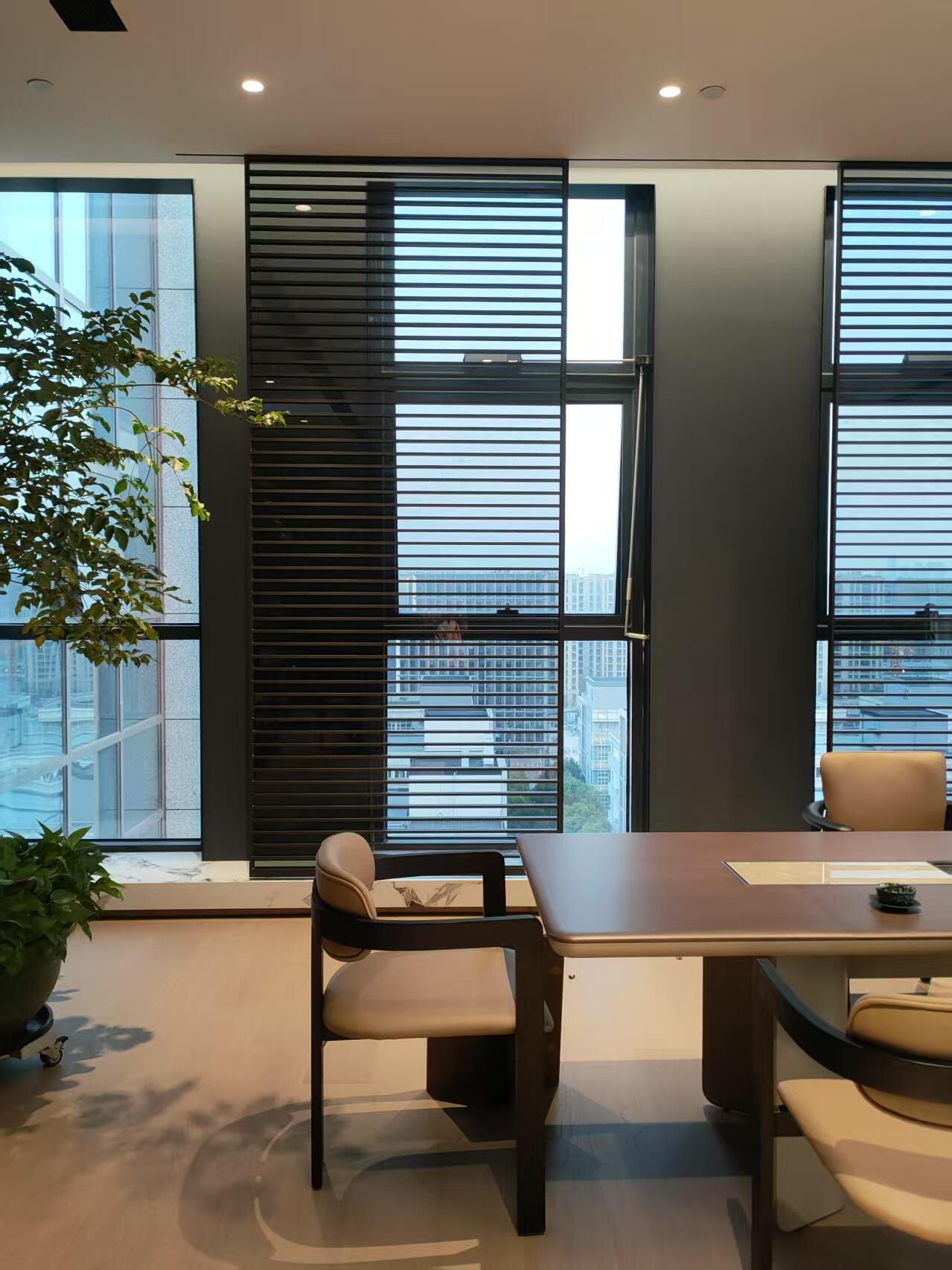舒适和功能的结合:我们在设计阶段充分考虑了主入口的功能分区。入口左侧为通往二层独立接待室的楼梯,右侧则为办公区,实现了整个空间的动静分离。该空间的原始层高约为4.8米,为了给员工提供最大化的工作舒适度,我们将其设计为挑空区,提升了空间的通透感。顶面左侧的“S”形弧度设计并非单纯为了造型,而是为了解决建筑大梁和空调风道的功能性需求。整个吊顶设计将美学与功能融为一体,中间的细节凹缝贯穿整个空间,形成了层次感。右侧结合空调风管处理,增设了一整排暗门储藏柜,既满足了收纳需求,又保持了空间的整洁与美观。