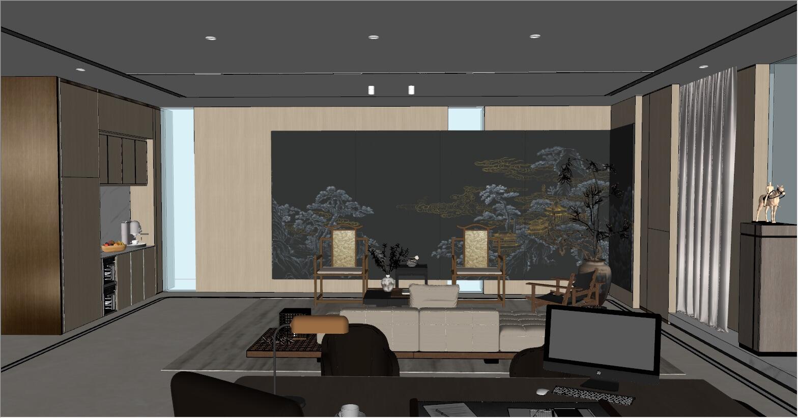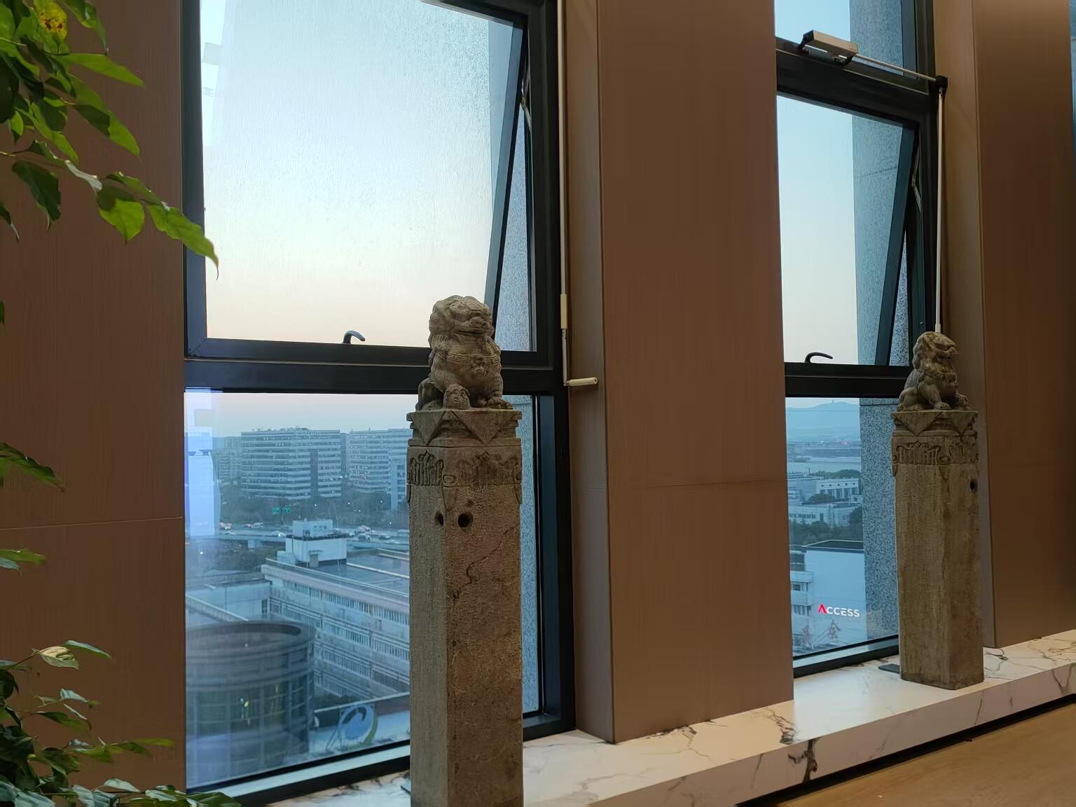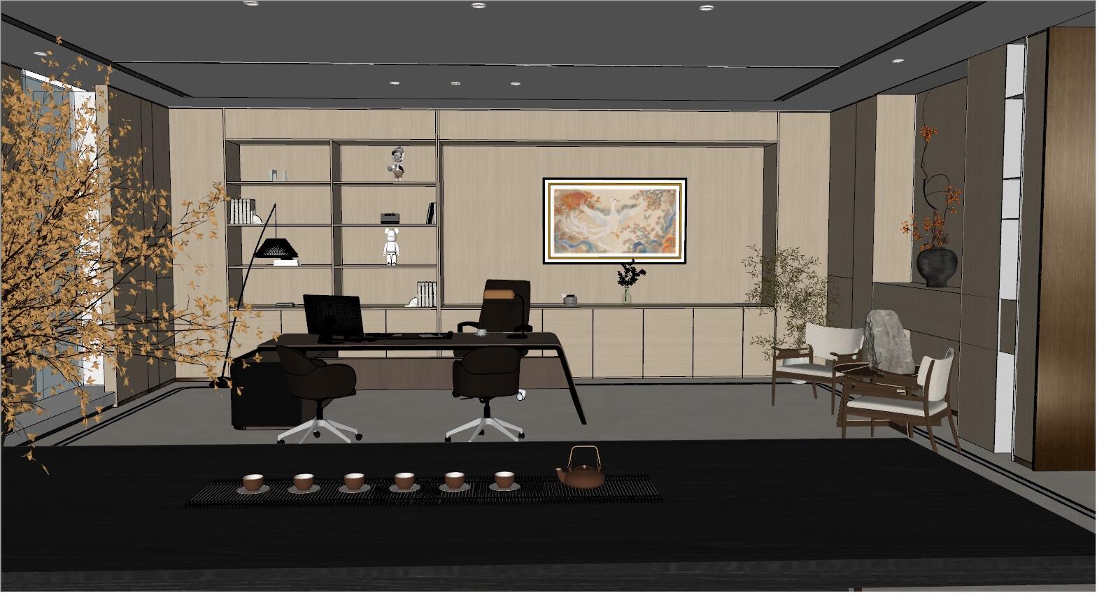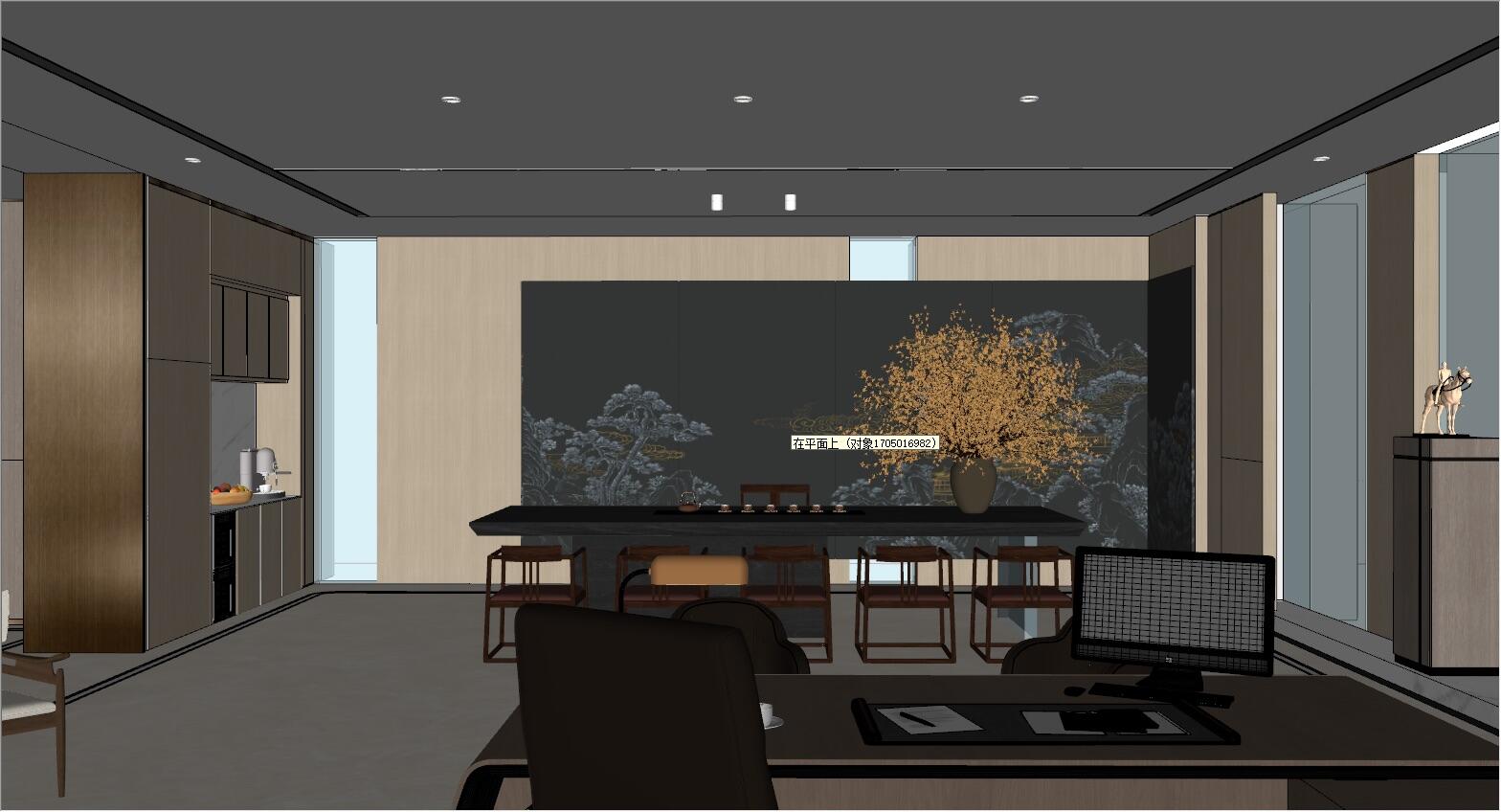 舒适和功能的结合:我们在设计阶段充分考虑了主入口的功能分区。入口左侧为通往二层独立接待室的楼梯,右侧则为办公区,实现了整个空间的动静分离。该空间的原始层高约为4.8米,为了给员工提供最大化的工作舒适度,我们将其设计为挑空区,提升了空间的通透感。顶面左侧的“S”形弧度设计并非单纯为了造型,而是为了解决建筑大梁和空调风道的功能性需求。整个吊顶设计将美学与功能融为一体,中间的细节凹缝贯穿整个空间,形成了层次感。右侧结合空调风管处理,增设了一整排暗门储藏柜,既满足了收纳需求,又保持了空间的整洁与美观。