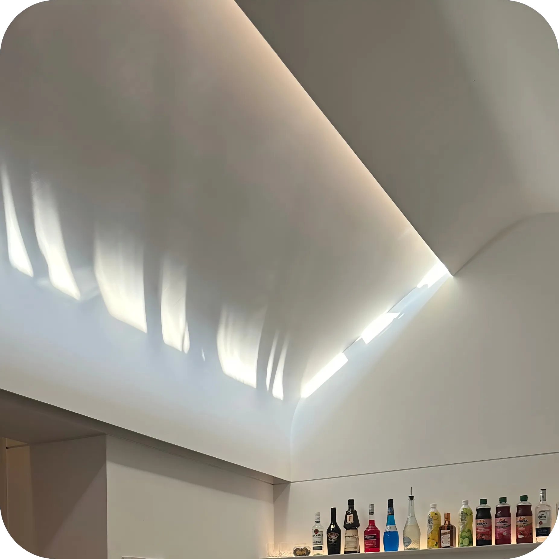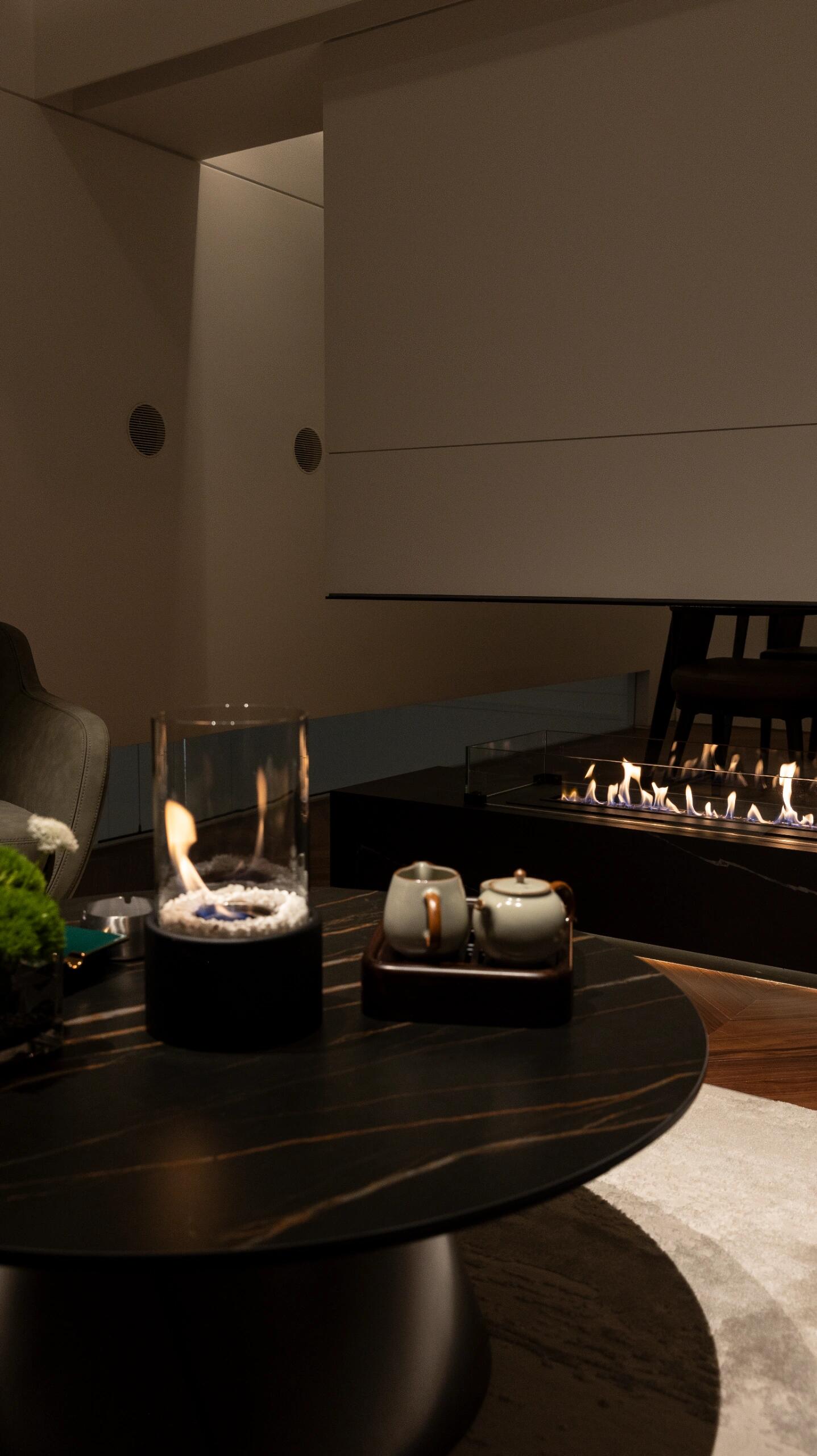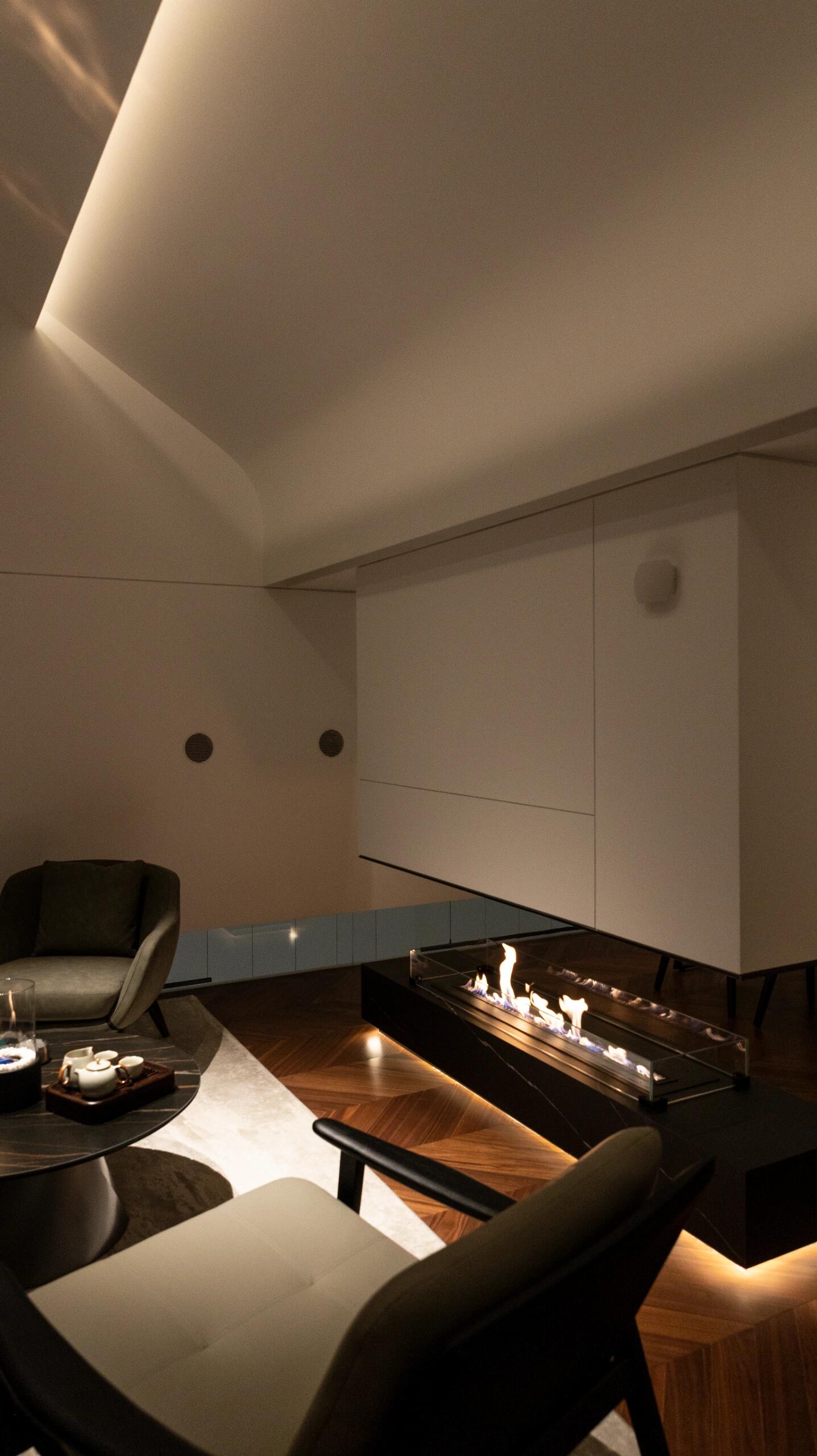 自然光和空间的结合:在设计推敲阶段,整个空间的方案既充满挑战又颇具趣味。挑战在于,二层隔层完成后,地面到大梁底的高度有限,且原始弧形顶面上方是陈旧的玻璃采光顶,需要综合考虑设备、采光和隔热的处理方式。而趣味性则体现在二层空间的设计中,我们可以在基础条件的限制下发挥想象力,创造出独特的空间体验。最终,我们结合二层大梁和原始玻璃采光顶的特点,确定了现有方案:墙面的圆孔作为空调出风口,由于原始结构的限制,空调内机和风管的位置经过特殊设计,以确保二层保留舒适的层高。梁下沿采用与一层相同的内凹工艺缝手法,使细节贯穿整个二层空间,同时弱化了酒精壁炉正上方大梁的存在感,将其转化为工艺体块的造型。吊顶的弧形处理也别具匠心:白天,日光从斜口缝隙洒入,投射在侧面弧形吊顶上,形成一道灵动光影,为二层空间增添了趣味性。这道光影会随着时间和天气的变化而改变,通过自然光的微妙变化,让人感知时间与天气的流转,增强了人与空间的互动性,使整个空间焕发出独特的生命力。