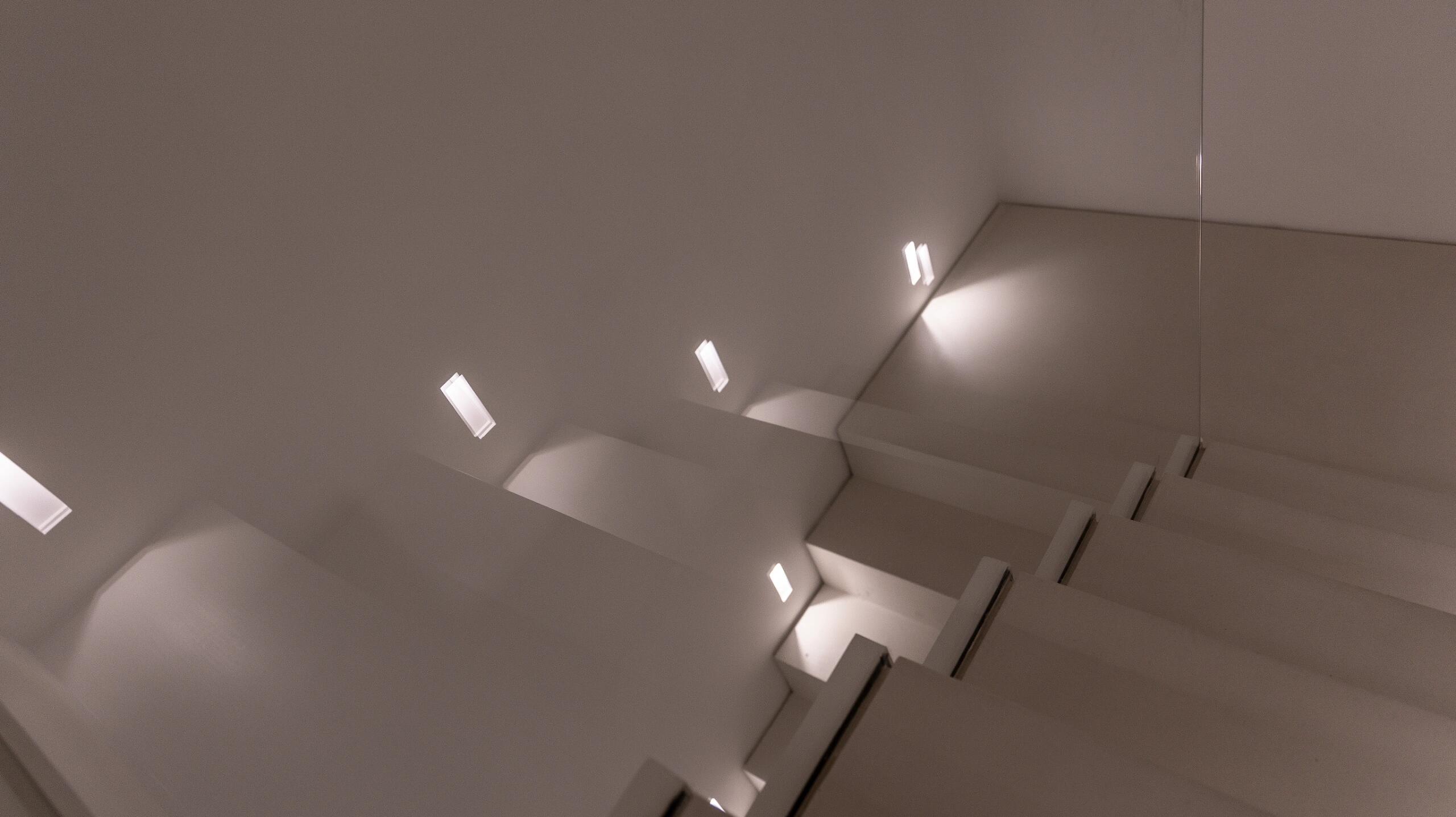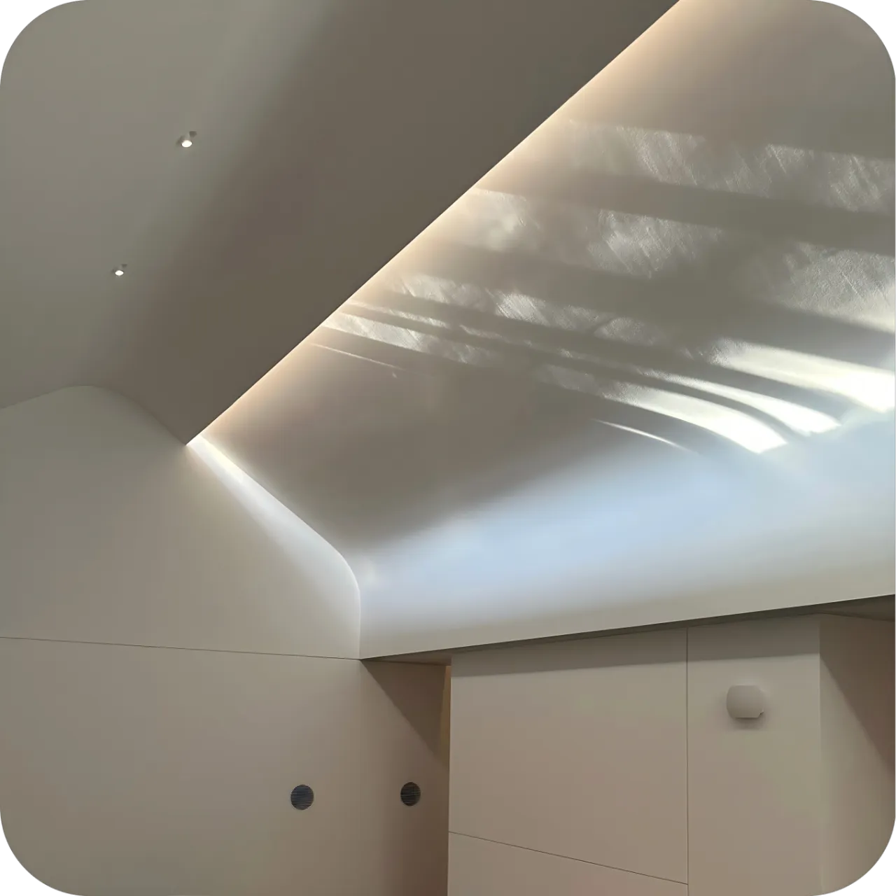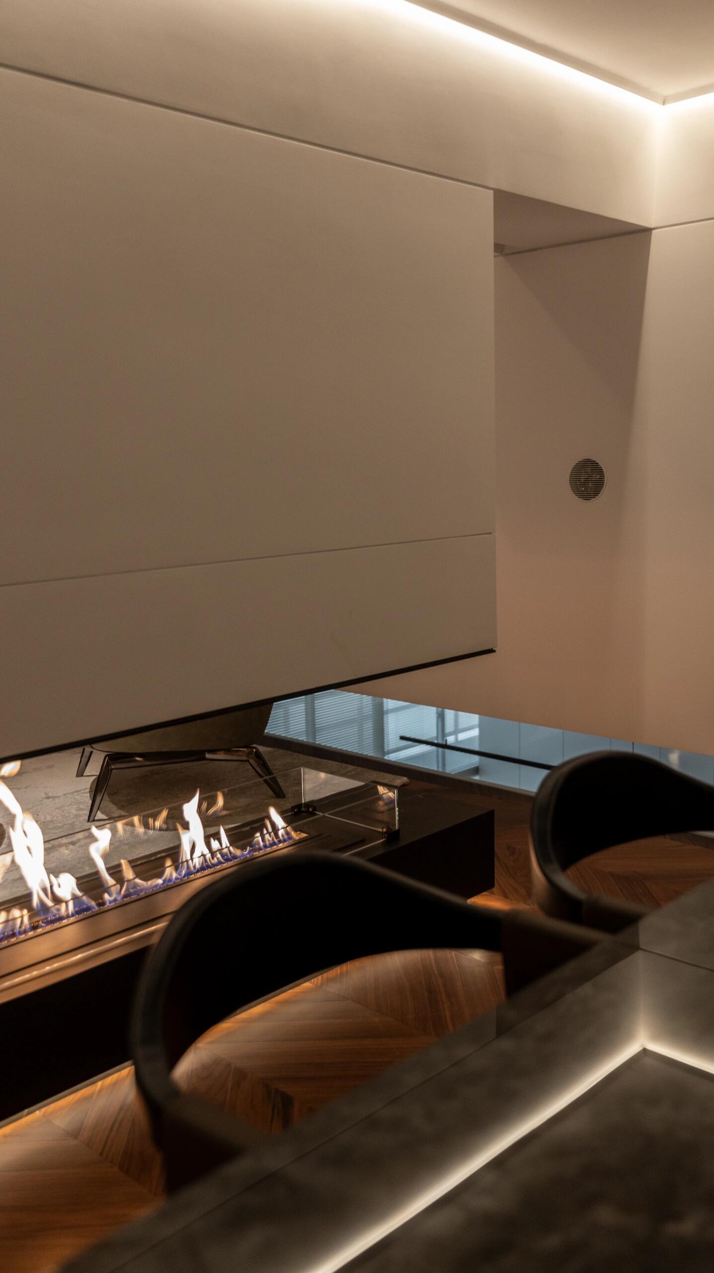 自然光和空间的结合:在设计推敲阶段,整个空间的方案既充满挑战又颇具趣味。挑战在于,二层隔层完成后,地面到大梁底的高度有限,且原始弧形顶面上方是陈旧的玻璃采光顶,需要综合考虑设备、采光和隔热的处理方式。而趣味性则体现在二层空间的设计中,我们可以在基础条件的限制下发挥想象力,创造出独特的空间体验。最终,我们结合二层大梁和原始玻璃采光顶的特点,确定了现有方案:墙面的圆孔作为空调出风口,由于原始结构的限制,空调内机和风管的位置经过特殊设计,以确保二层保留舒适的层高。梁下沿采用与一层相同的内凹工艺缝手法,使细节贯穿整个二层空间,同时弱化了酒精壁炉正上方大梁的存在感,将其转化为工艺体块的造型。吊顶的弧形处理也别具匠心:白天,日光从斜口缝隙洒入,投射在侧面弧形吊顶上,形成一道灵动光影,为二层空间增添了趣味性。这道光影会随着时间和天气的变化而改变,通过自然光的微妙变化,让人感知时间与天气的流转,增强了人与空间的互动性,使整个空间焕发出独特的生命力。