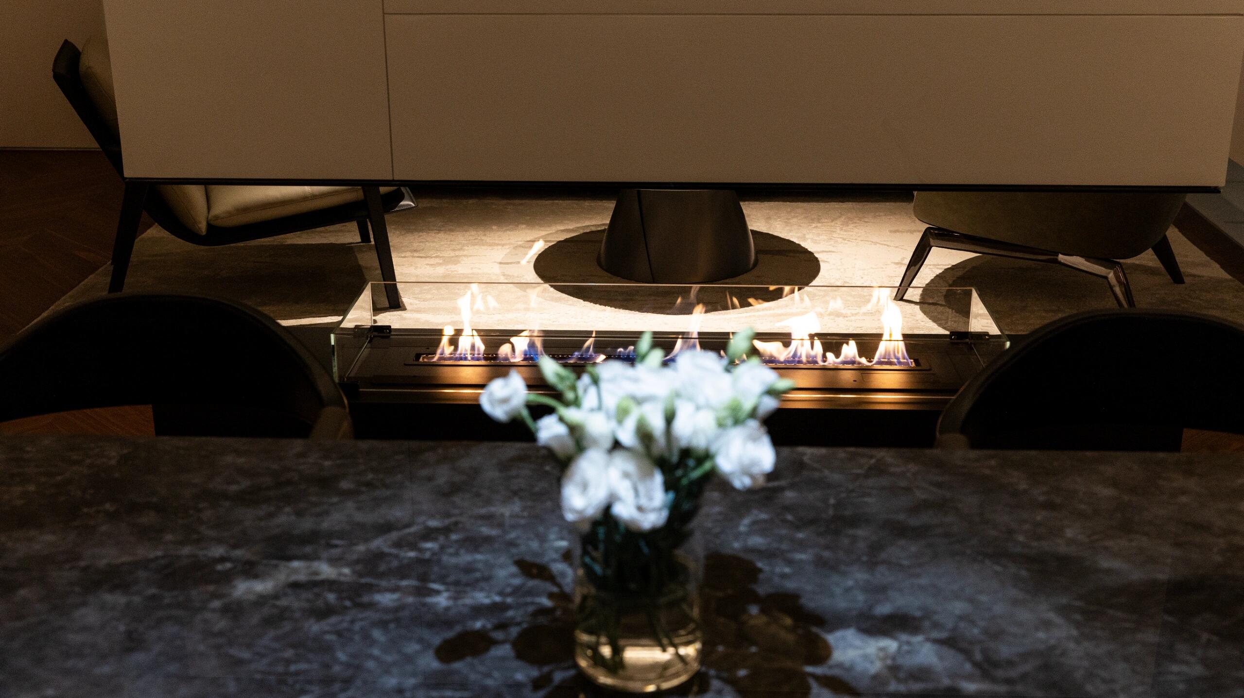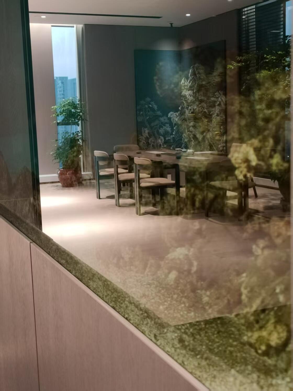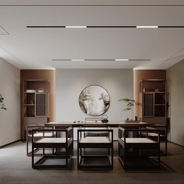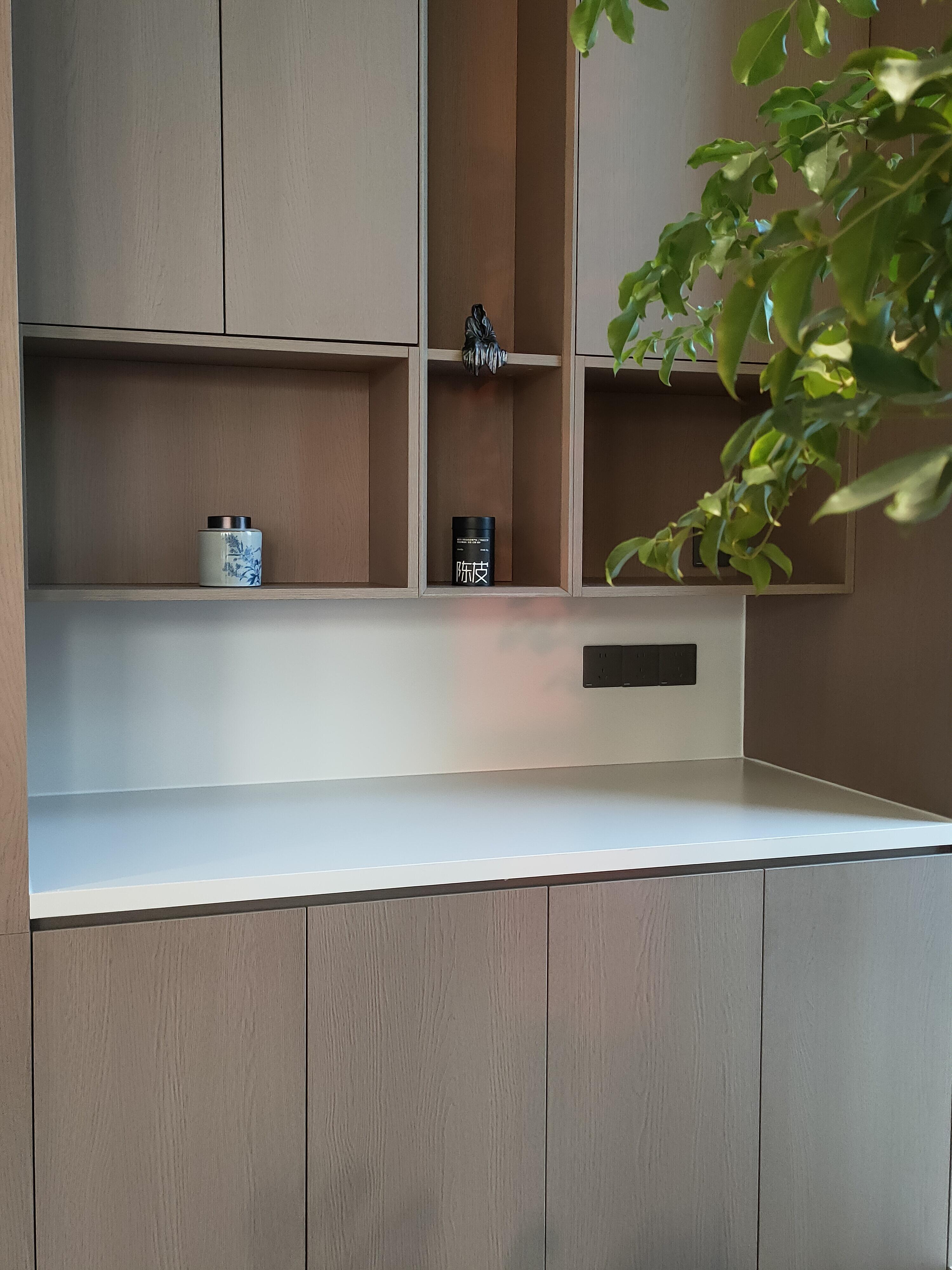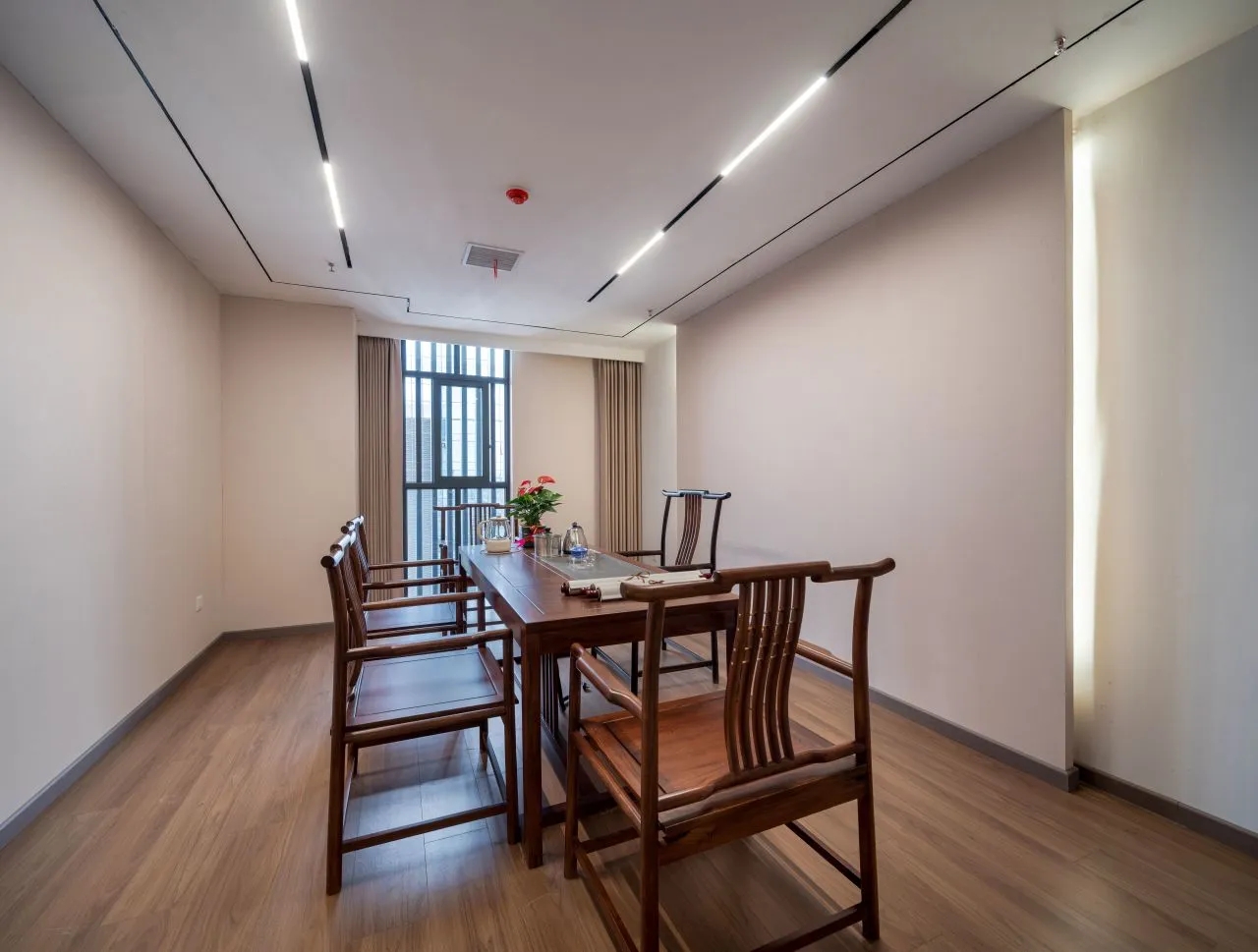 灯光和空间的结合:位于空间最高位的三盏射灯从中心向两侧等距排列,既不喧宾夺主,又保持了视觉平衡;中位的一盏落地灯将柔和的光线投射到墙面,为使用者提供了充足的照明;而相对低位的陈列区则通过背景灯带营造出浓郁的氛围感。整个空间无需过多光源,却通过巧妙搭配实现了完美的照明效果。与其他空间一致的是,硬装设计摒弃了材料的堆砌,仅在空间中心放置了一张3米长的岩板桌。这种简洁的设计语言为空间使用者的想象力提供了充分的发挥空间。