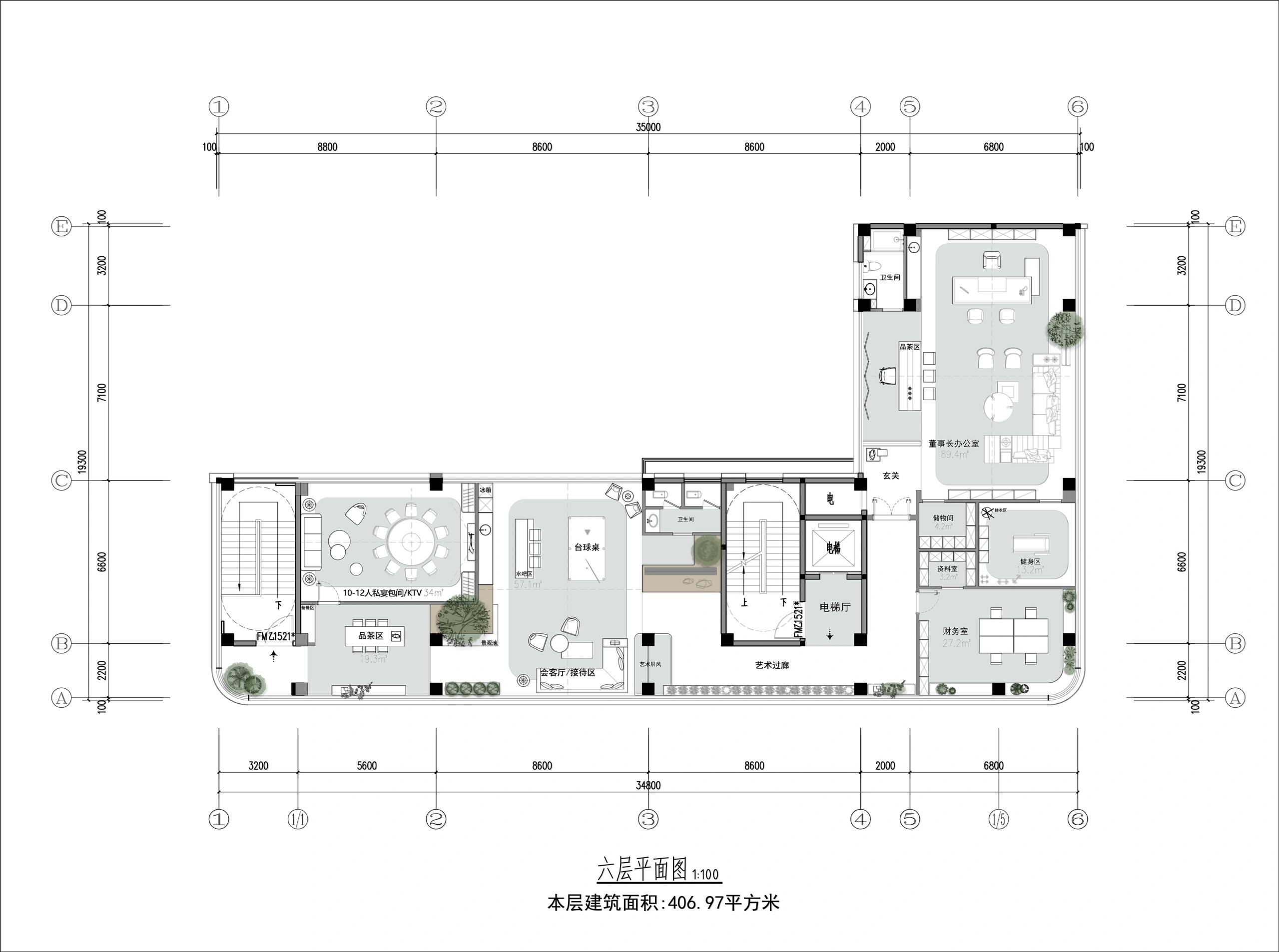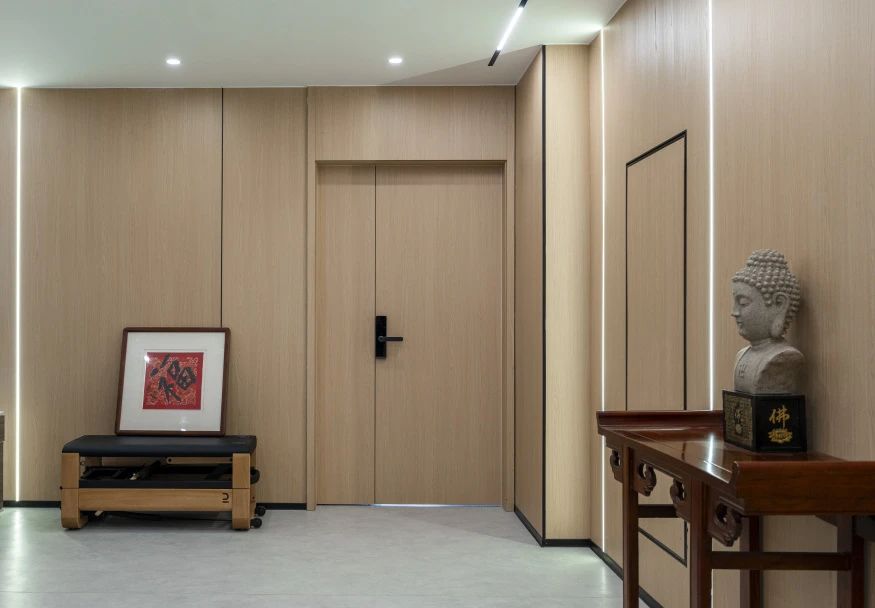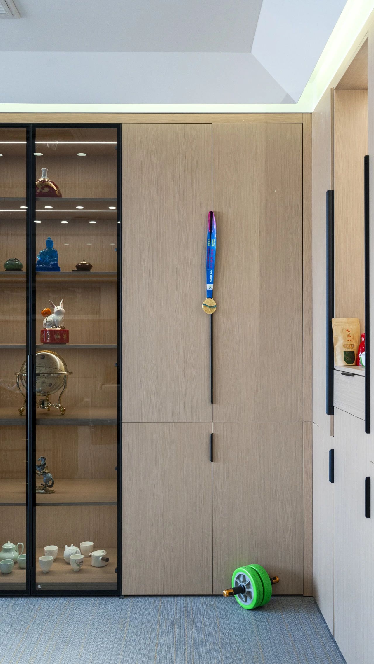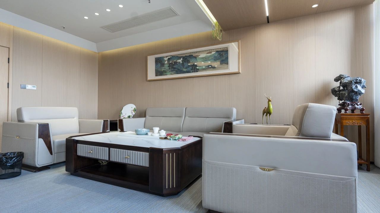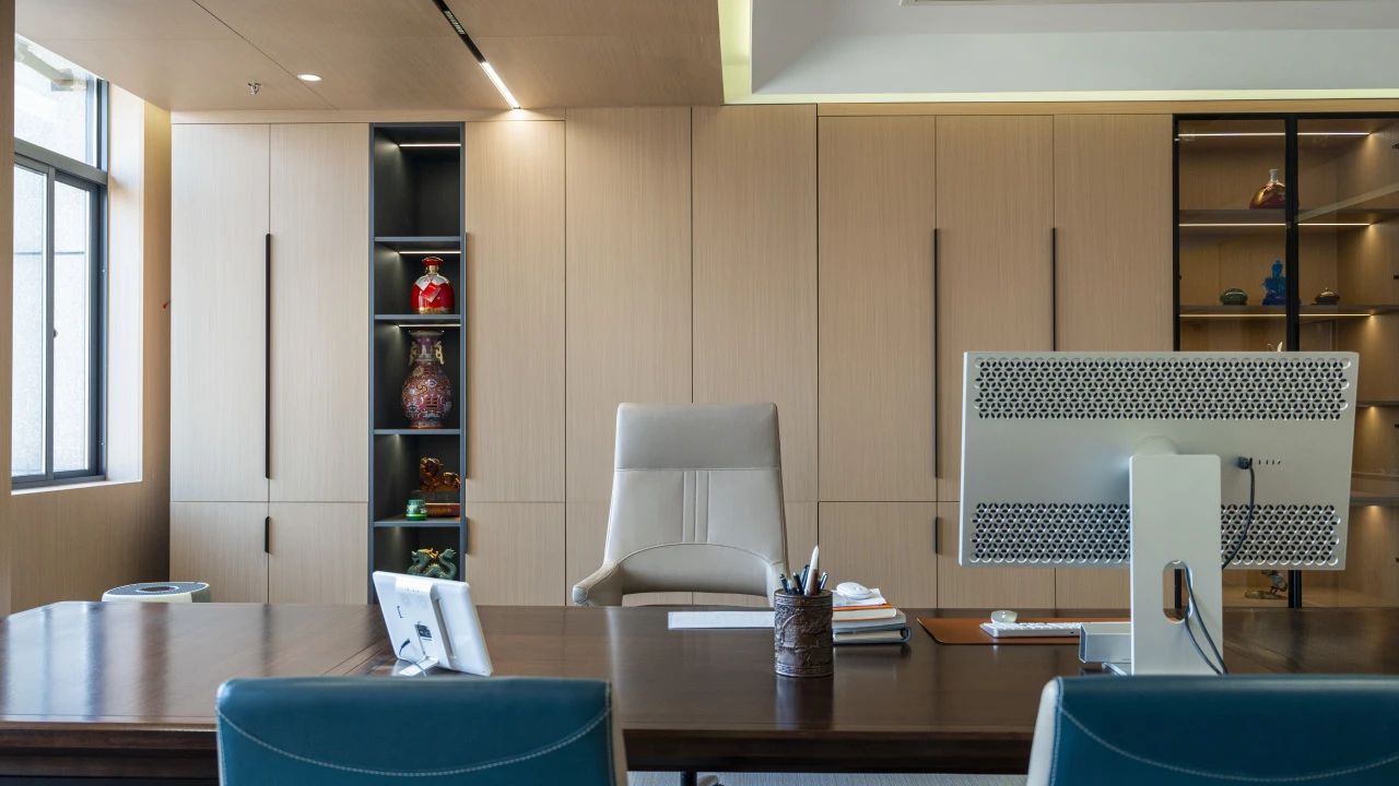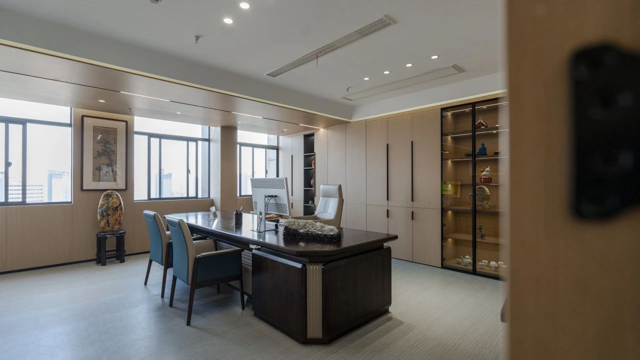 在设计董事长办公室的时候,无论是在空间布局、颜色搭配还是在软装上,都要突出其干练沉稳、大气风范的形象与气质。玻璃展示柜内陈列的工艺品、茶具、地球仪等物品和地上的健腹轮,不仅起到装饰作用,还能彰显董事长的文化品味与兴趣爱好。顶面有根横梁,梁上做了木饰面,与吊顶的衔接较为自然,没有破坏整体的视觉效果,既保证了空间的功能性,又兼顾了美观性。