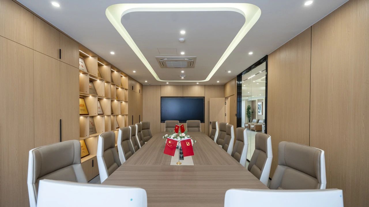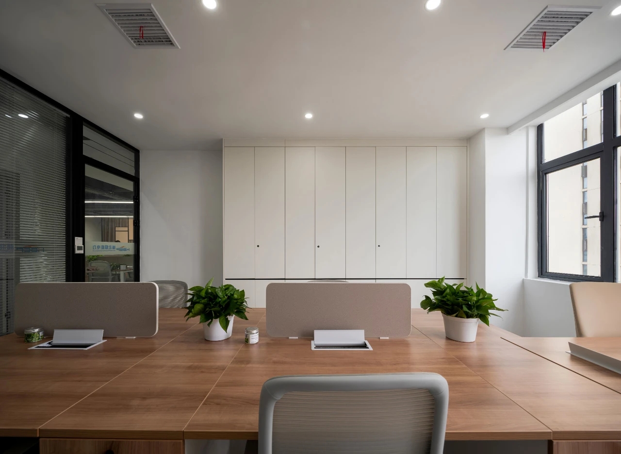 会议室从墙面到长桌都采用原木元素和自然色调,温润的质感氤氲整个空间,营造出温馨舒适的工作氛围。原木材质的选择可以提升会议室的整体品质,还能展现公司的品牌形象和价值观。