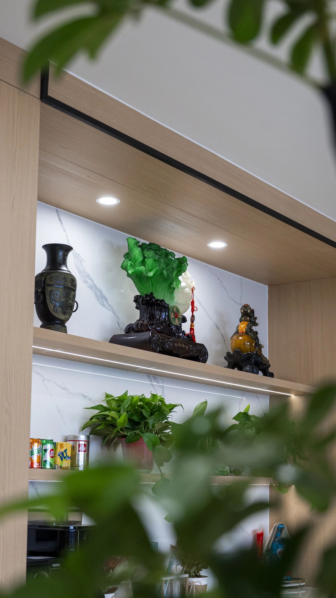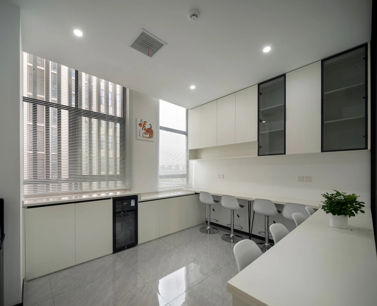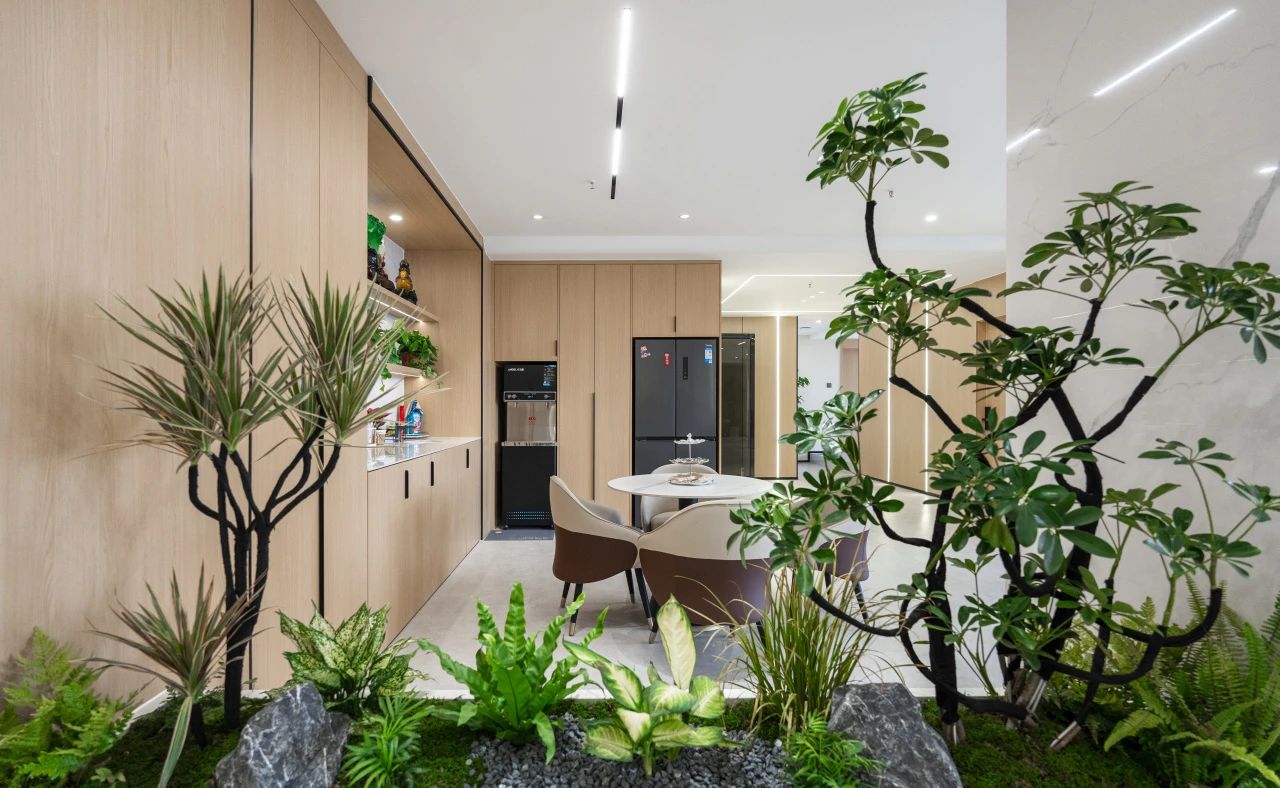 休闲区空间布局紧凑且功能明确。中部摆放着圆形餐桌与几把椅子,形成用餐、交流区域;还配备了冰箱、饮水机和微波炉等电器,方便员工使用。另一侧的造景,为空间增添生机与美感。选用多种绿植,有高大的植株撑起竖向空间,也有低矮的蕨类、草本植物铺陈地面,形成高低错落的层次感。