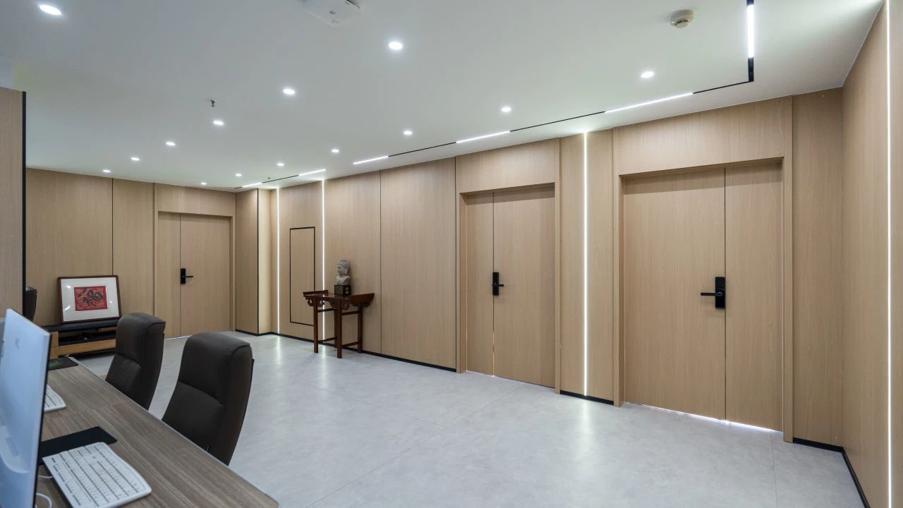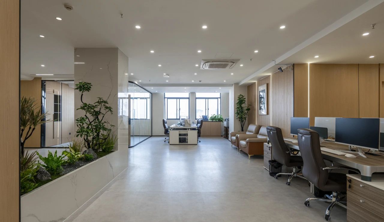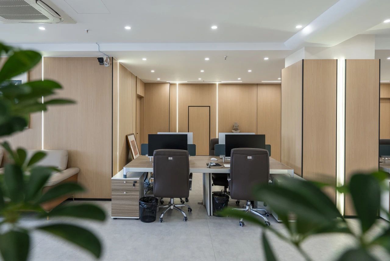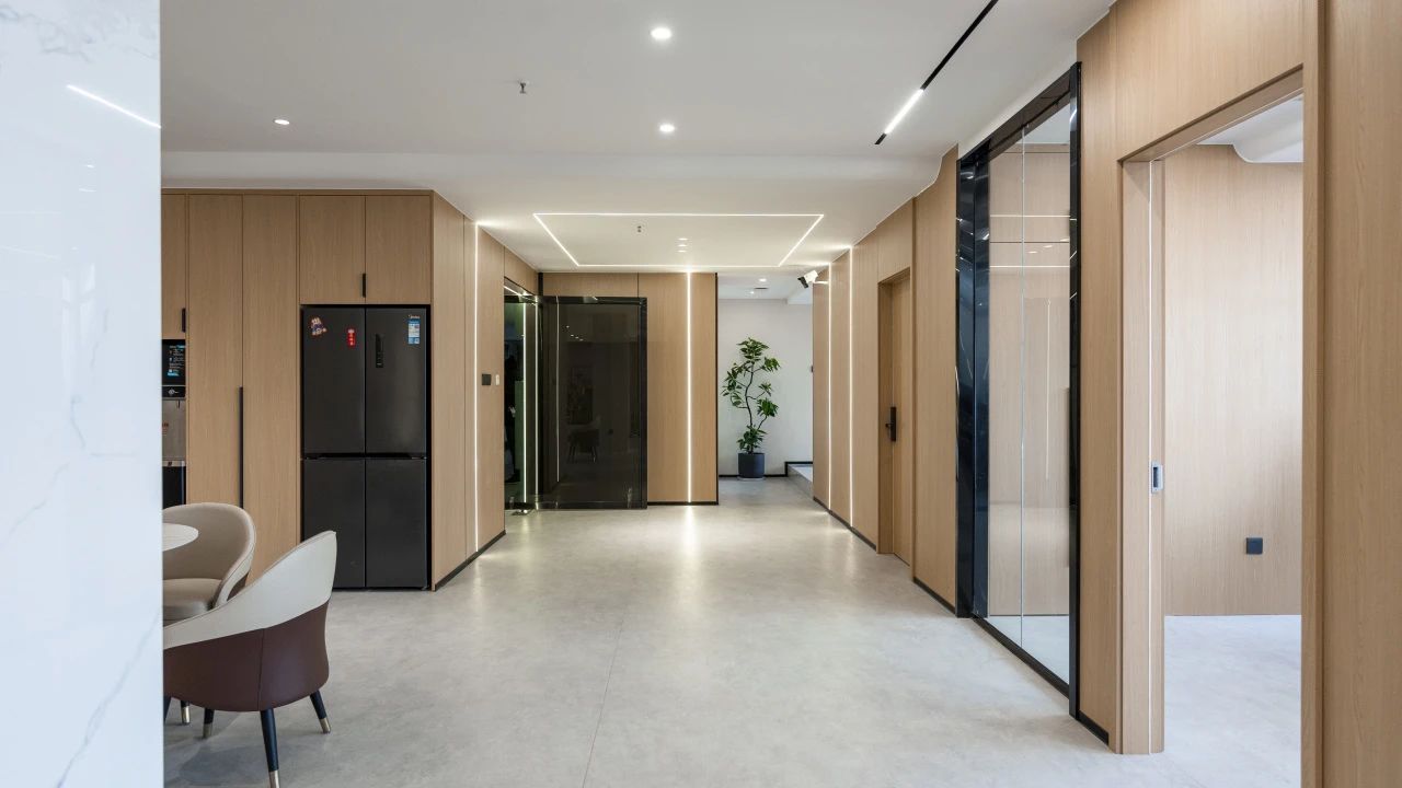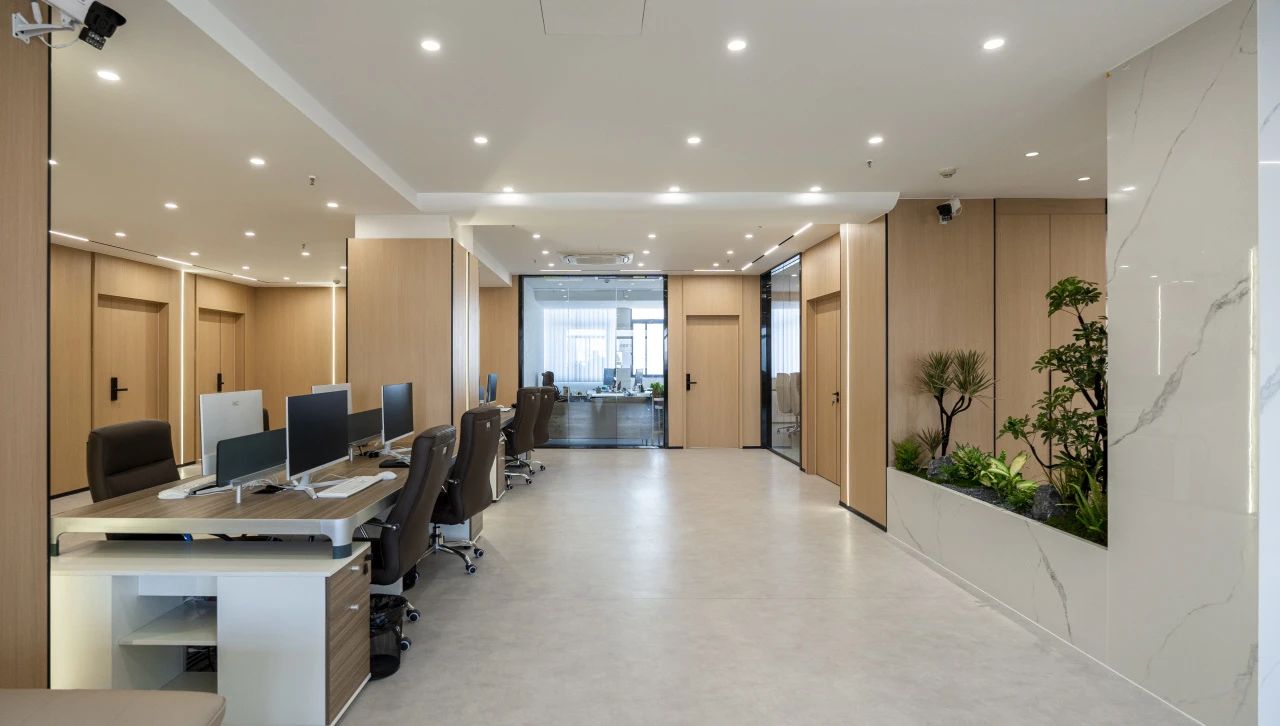办公室墙面整体采用原木色木饰面装饰,具有温暖的质感,能够中和办公空间可能带来的冷漠感,营造出一种亲切、舒适的氛围。工作区分布合理,电脑桌椅整齐排列,为员工提供了充足的工作空间。地面采用了灰色水泥自流平,具有现代感,同时也易于清洁和维护。大量使用了筒灯和灯带,提供了充足的基础照明,保证了办公区域的亮度需求。