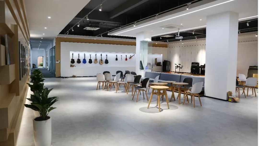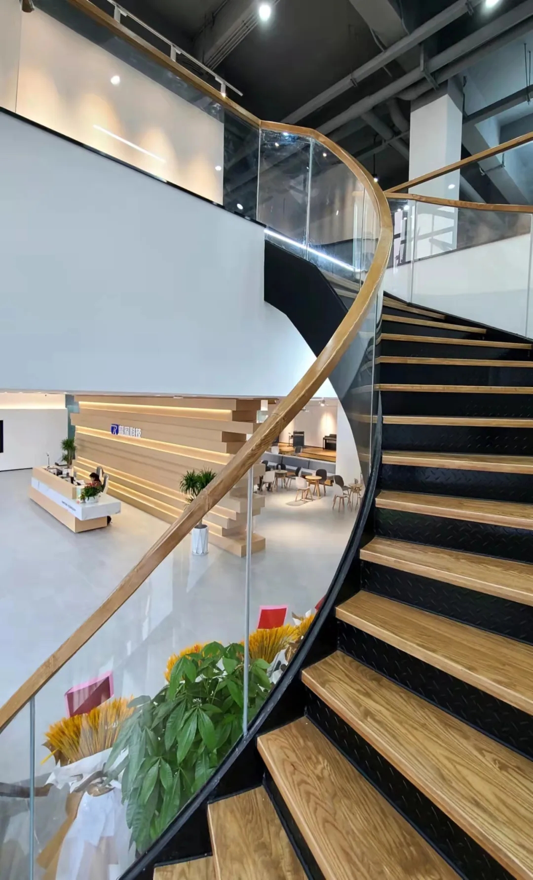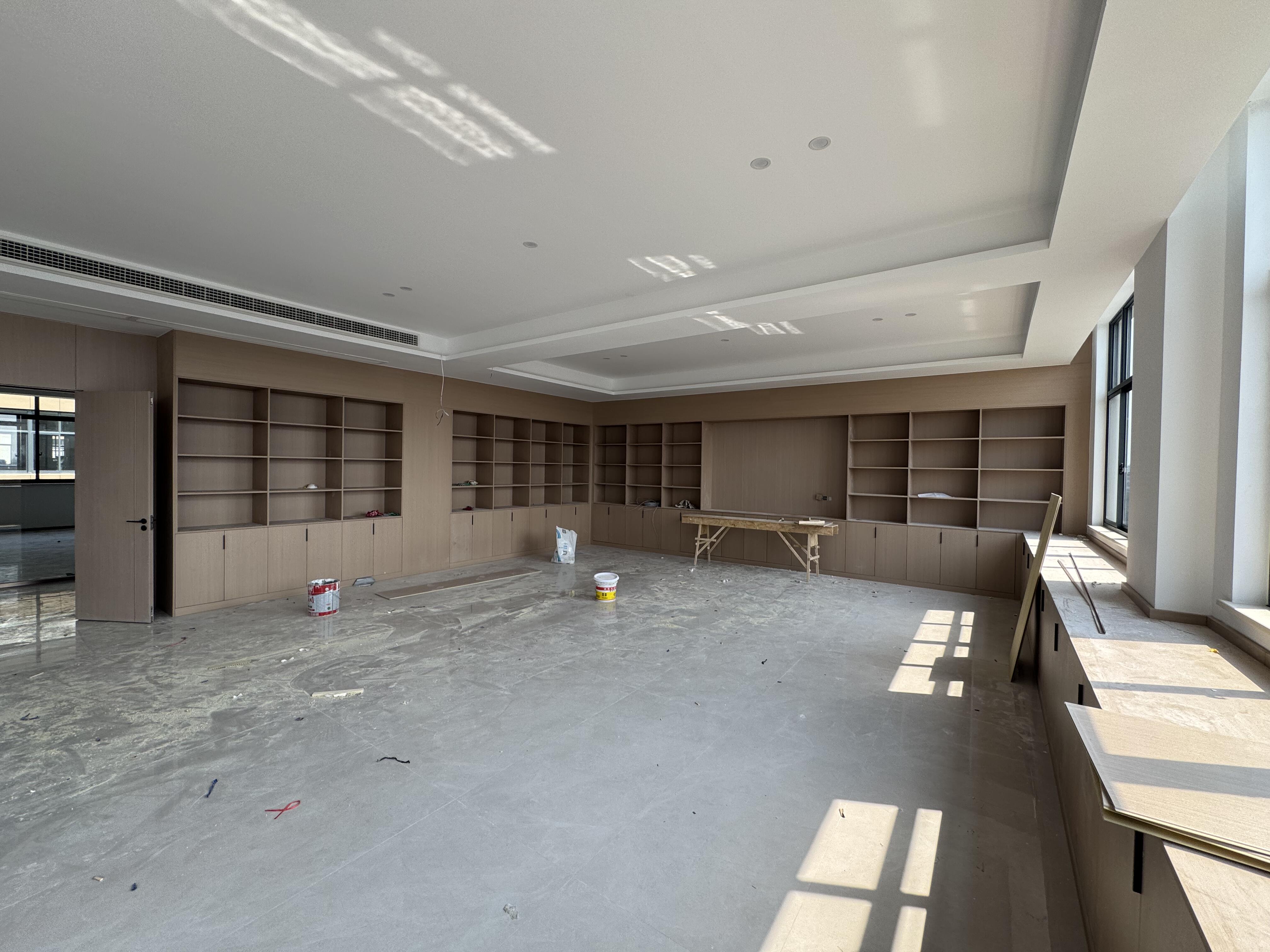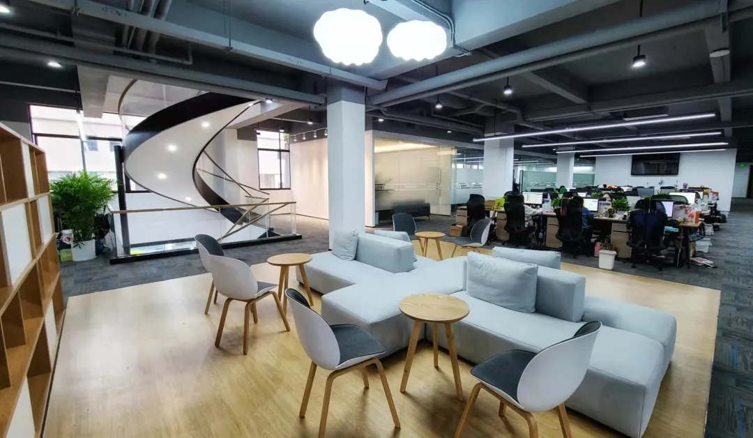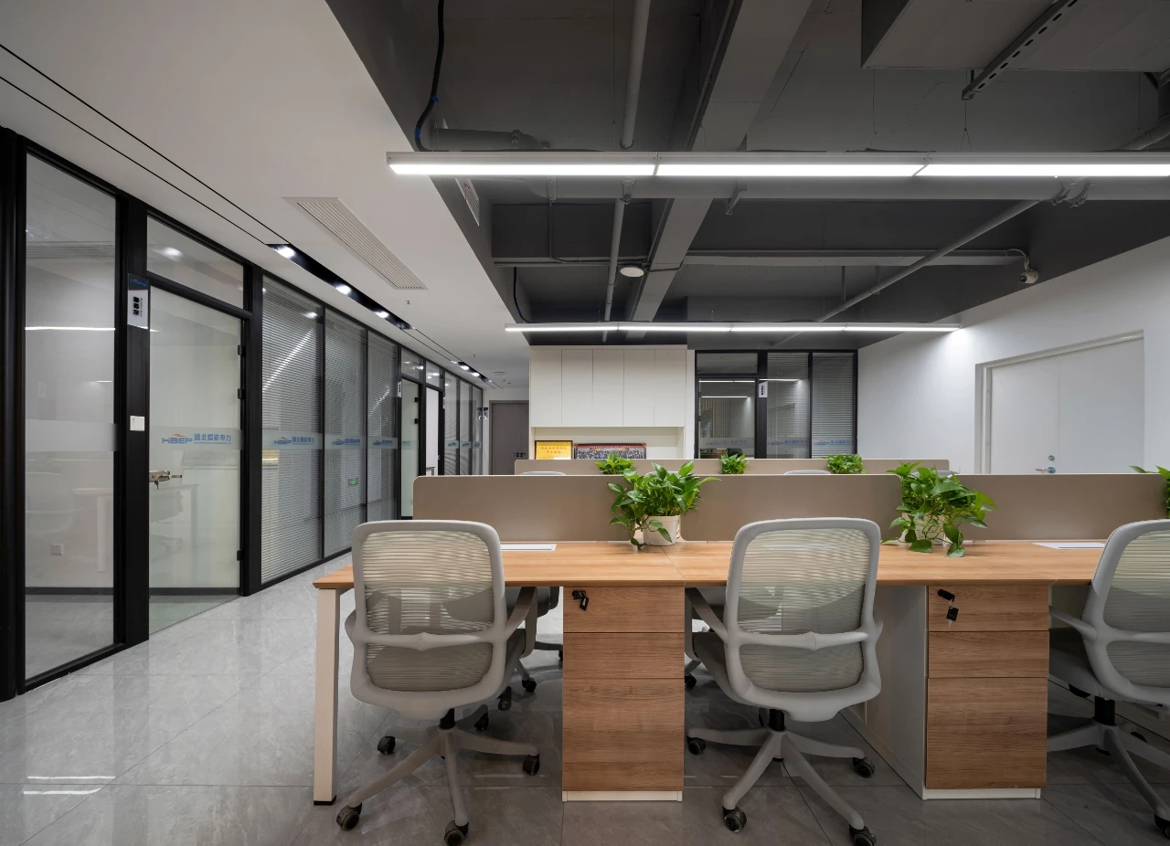 办公室墙面整体采用原木色木饰面装饰,具有温暖的质感,能够中和办公空间可能带来的冷漠感,营造出一种亲切、舒适的氛围。工作区分布合理,电脑桌椅整齐排列,为员工提供了充足的工作空间。地面采用了灰色水泥自流平,具有现代感,同时也易于清洁和维护。大量使用了筒灯和灯带,提供了充足的基础照明,保证了办公区域的亮度需求。