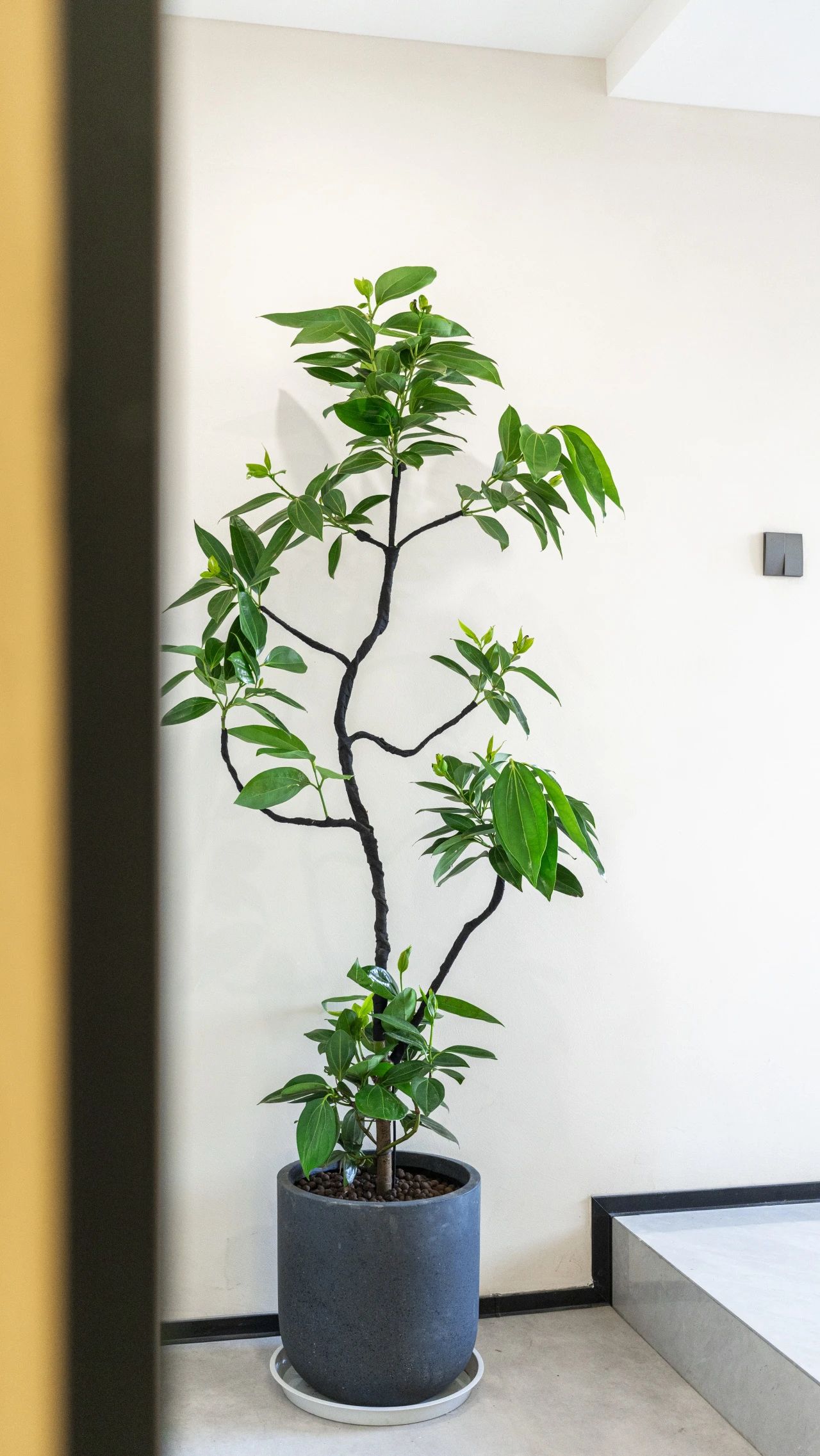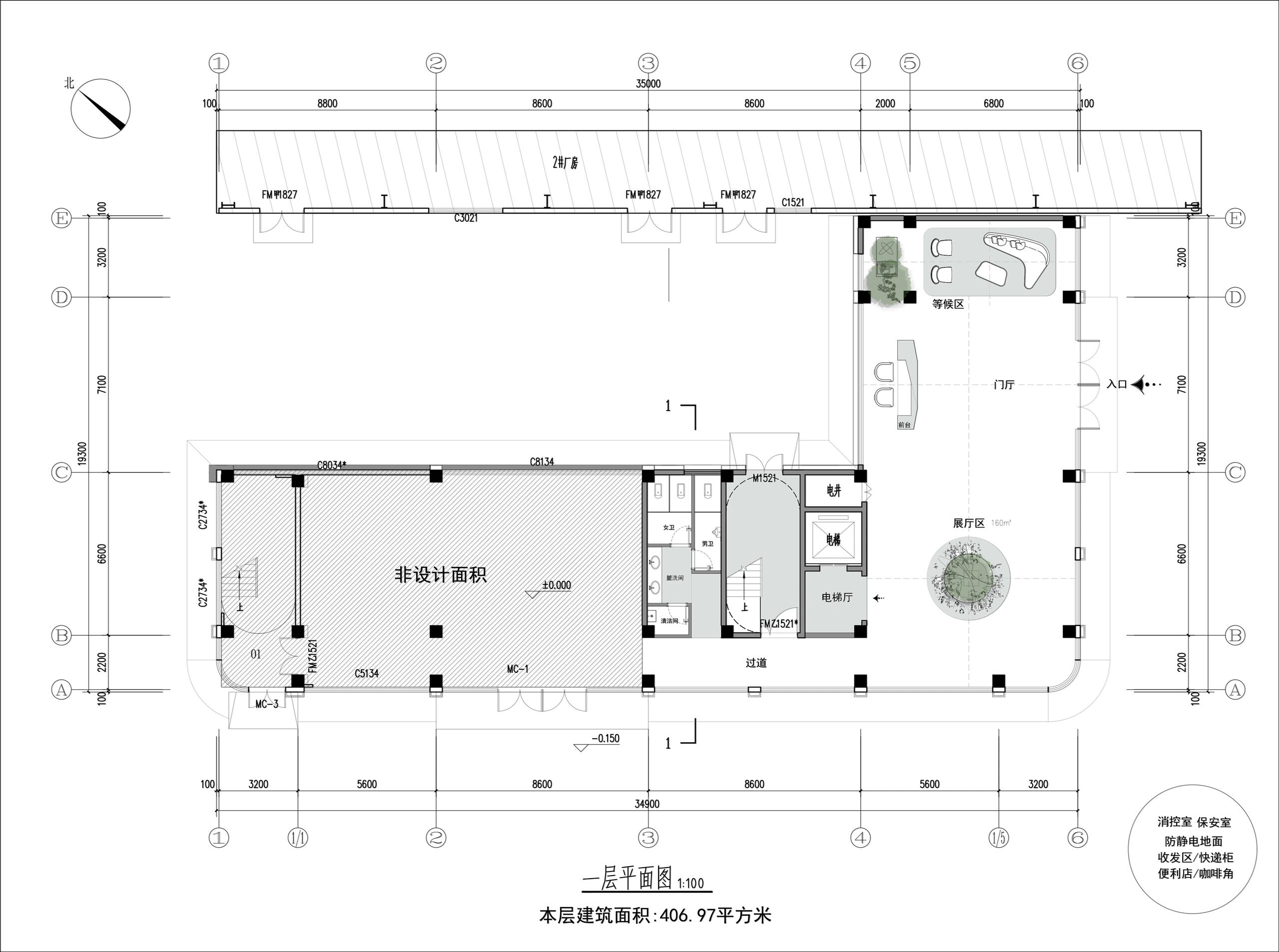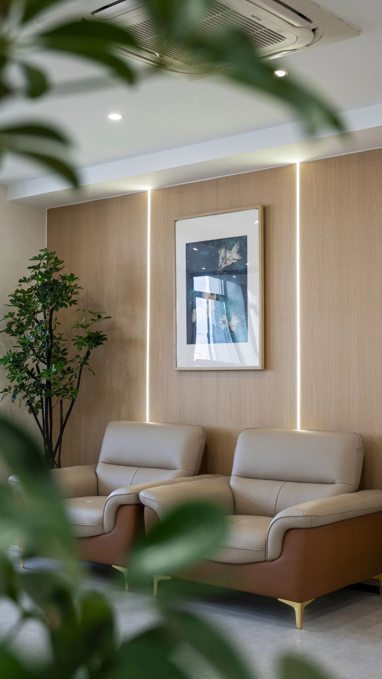 ♡ 前台区域采用绿植,金属色小圆桌,橙色沙发这些亮色来点缀,打破灰白色带来的单调感,使空间更具活力。