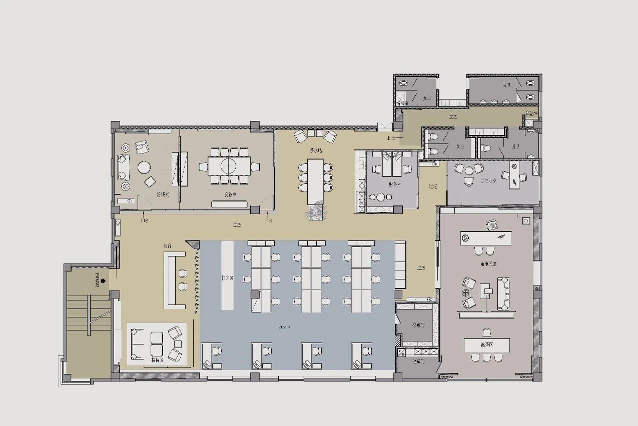 根据不同的顾客类型,企业展厅和设备维修设置在一层,方便普通客户参观、购买。办公、会客和接待设置在二层,重要客户参观后由负责人引入二层会客室接洽,提升接待品质。