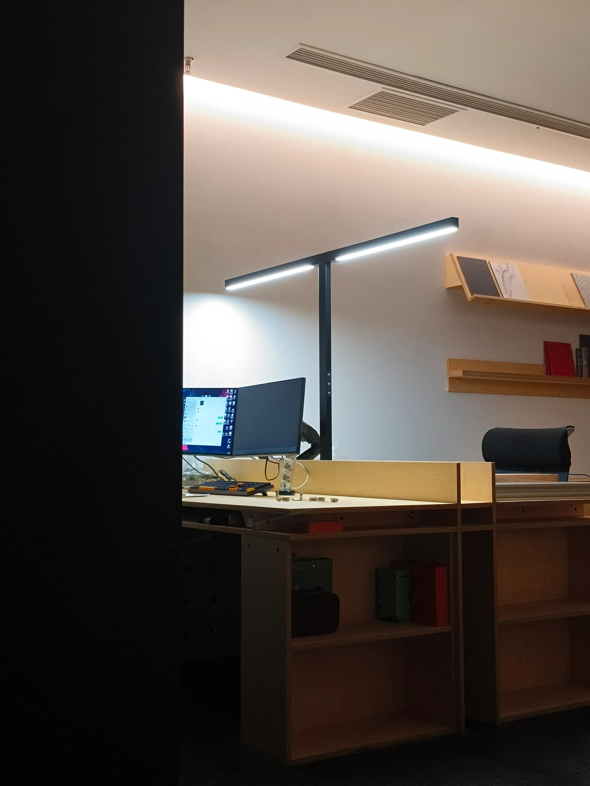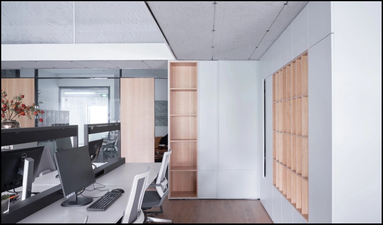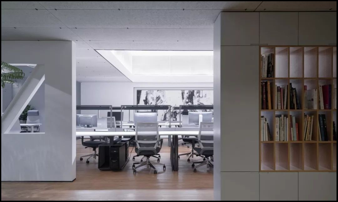 办公区一层是主要办公空间。工作区域挑高,天花不设光源,全部采用间接光源和桌面工作灯照明,意在使空间更为开阔,同时避免过多射灯带来的杂乱感观。柔和的光线营造了一个轻松愉悦的办公环境,可以毫无拘束,实现更多想法的交流,最终选择一个最优的答案交付给公众。