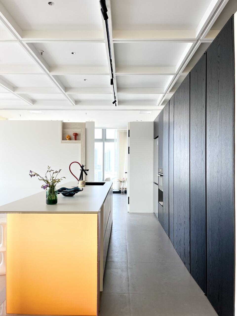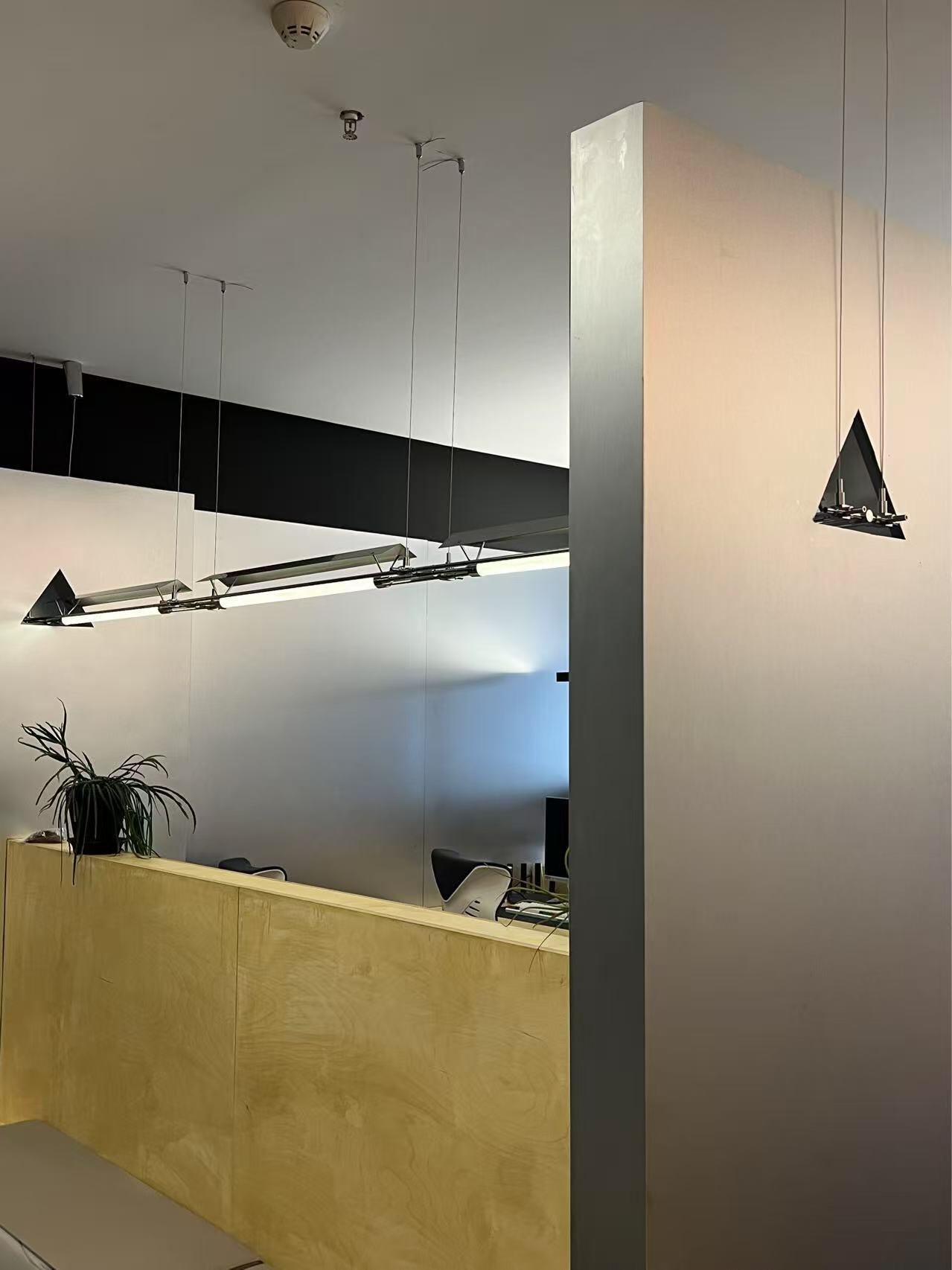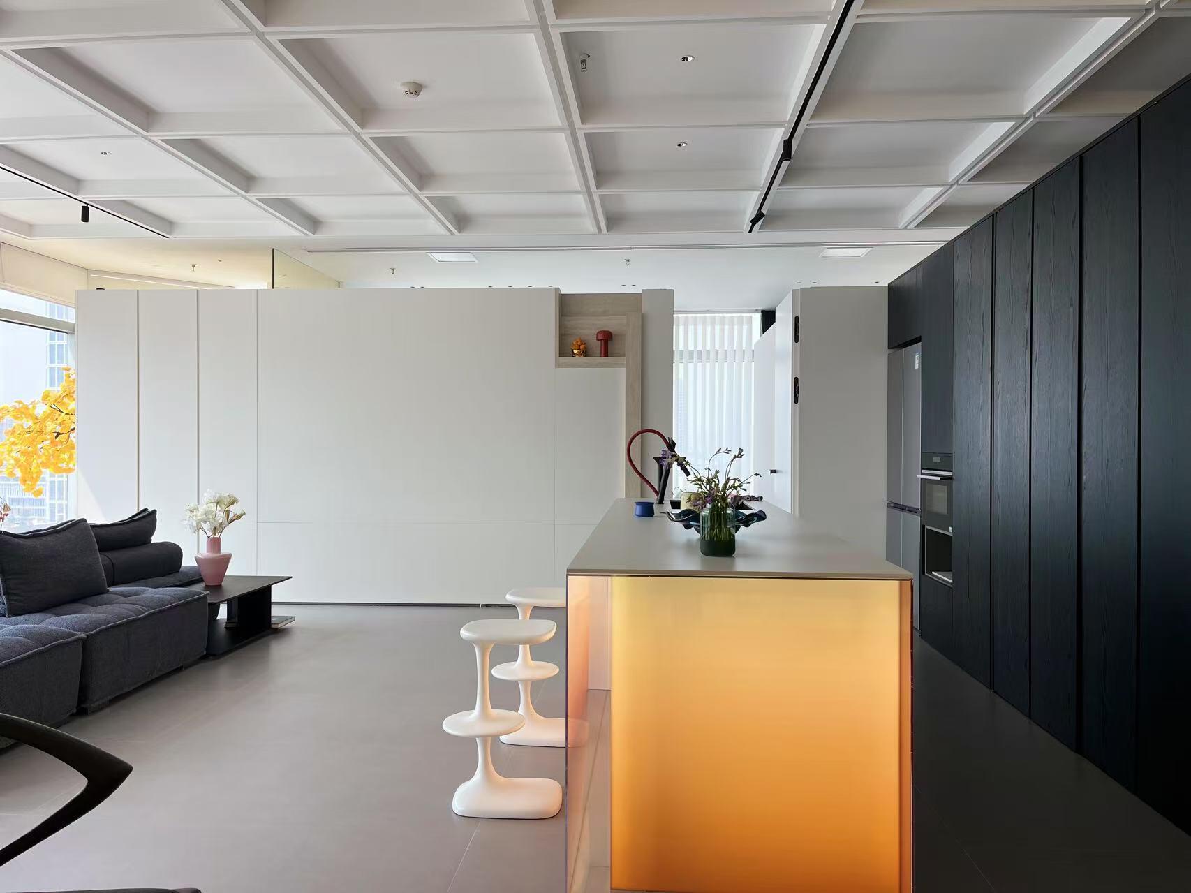 办公区一层是主要办公空间。工作区域挑高,天花不设光源,全部采用间接光源和桌面工作灯照明,意在使空间更为开阔,同时避免过多射灯带来的杂乱感观。柔和的光线营造了一个轻松愉悦的办公环境,可以毫无拘束,实现更多想法的交流,最终选择一个最优的答案交付给公众。