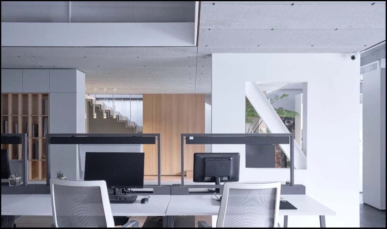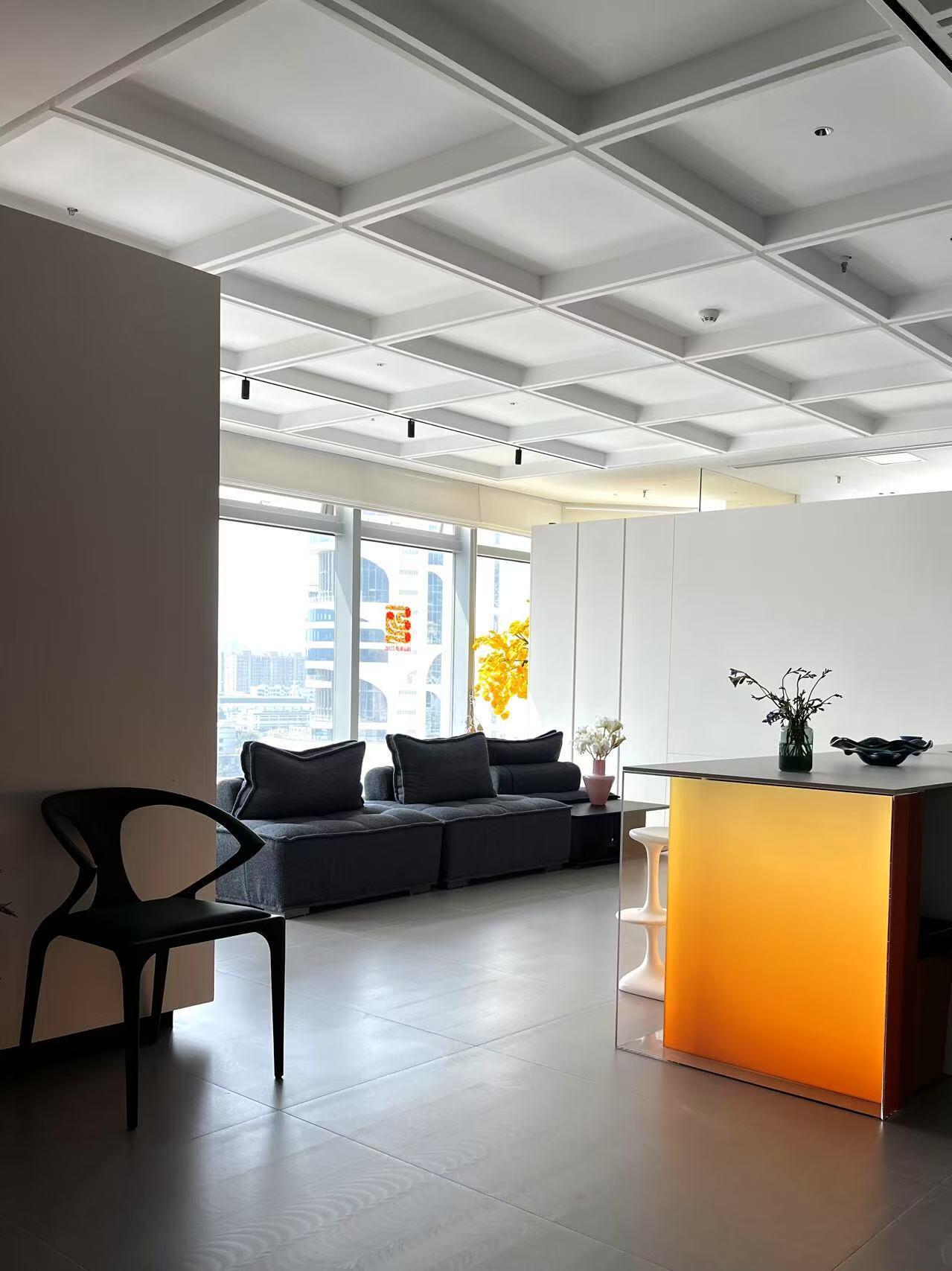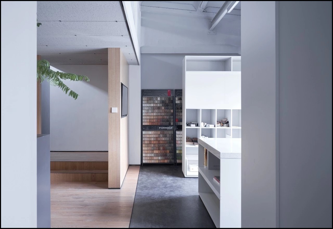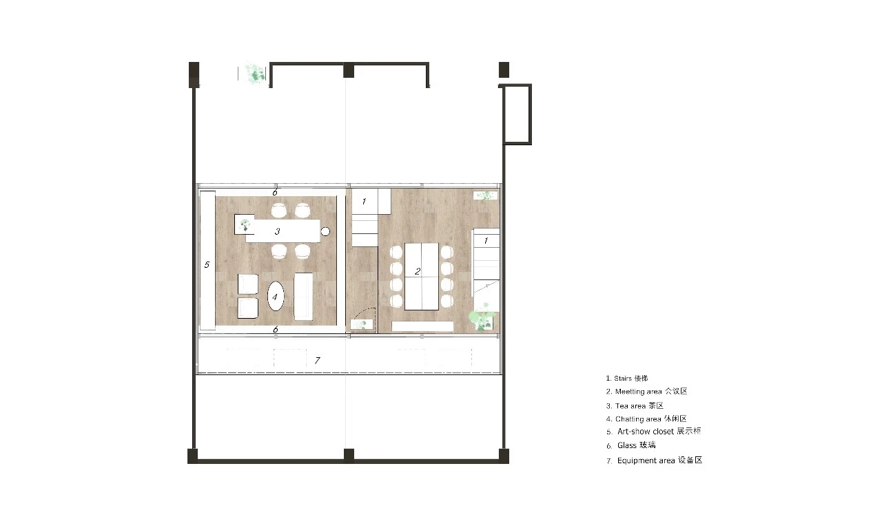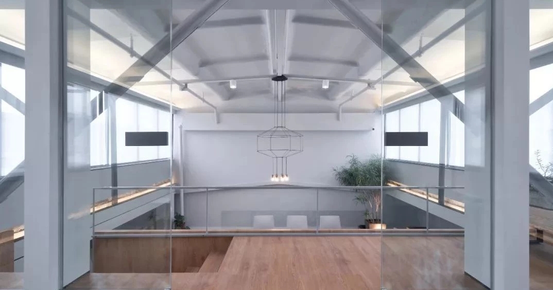 二层为会议区和会客区。我们把二层通过空间安排对使用效率较低的会议室,提高空间利用率。会客室则位于最里,通过台阶越过原有的三角结构梁,在这里进行更多私密性的交流。会客区除了会客功能,也是进行团队学习、分享、交流、共同成长的空间。