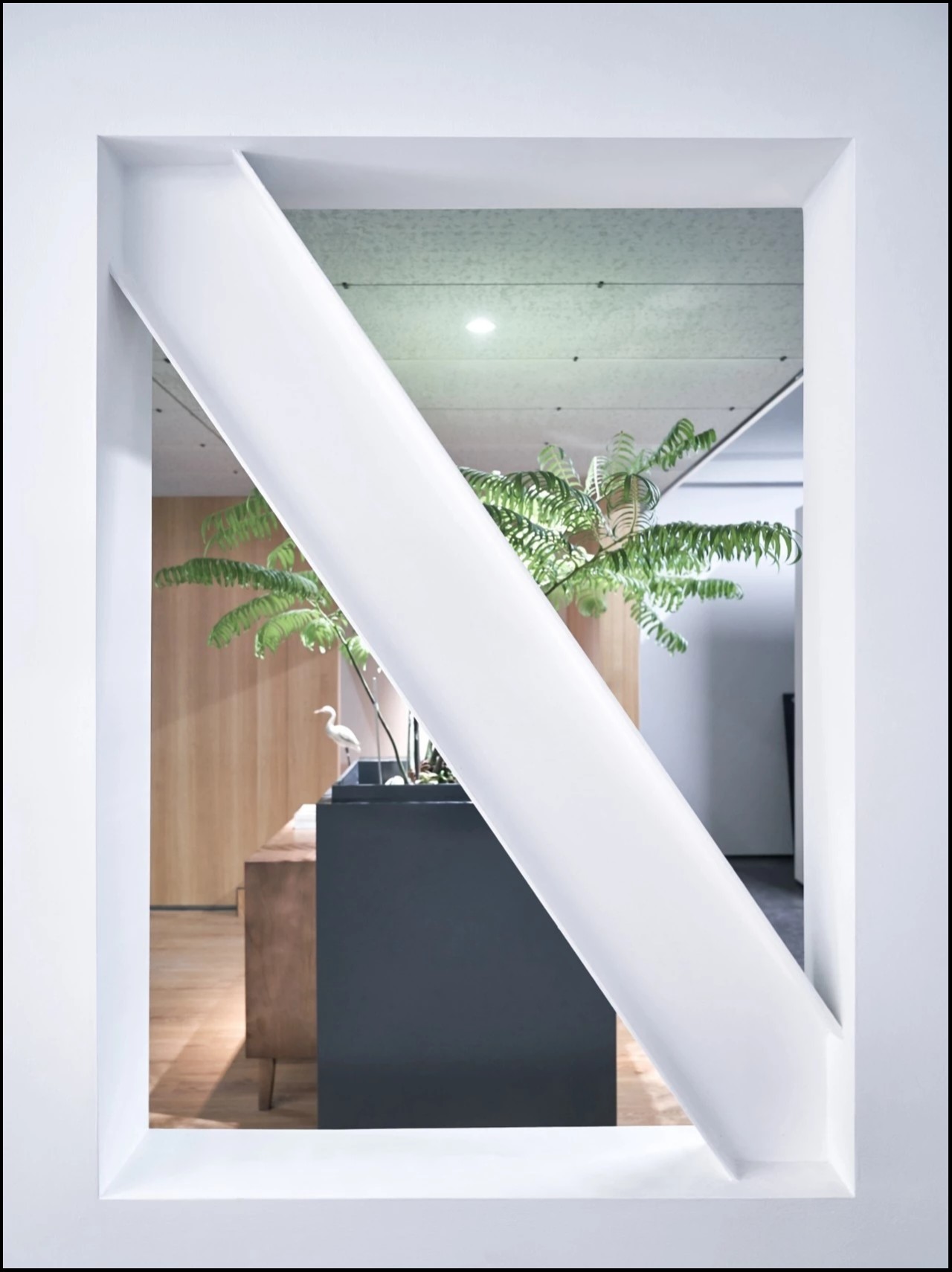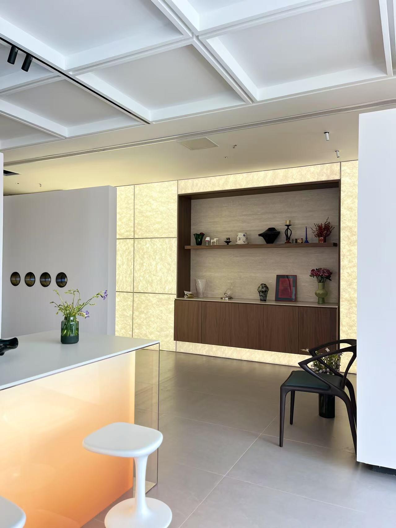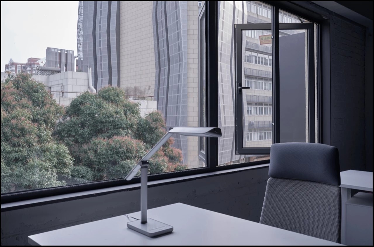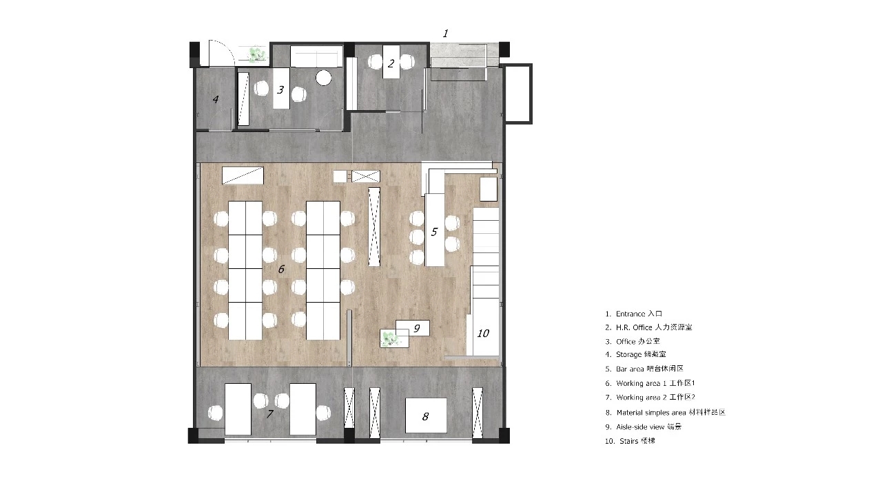 二层为会议区和会客区。我们把二层通过空间安排对使用效率较低的会议室,提高空间利用率。会客室则位于最里,通过台阶越过原有的三角结构梁,在这里进行更多私密性的交流。会客区除了会客功能,也是进行团队学习、分享、交流、共同成长的空间。