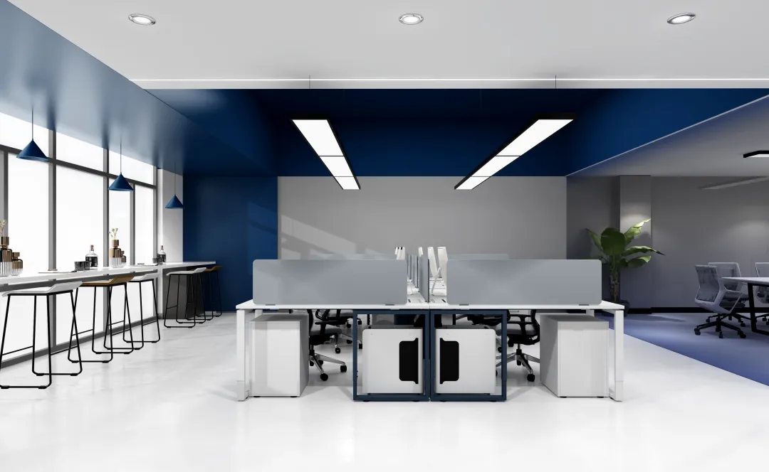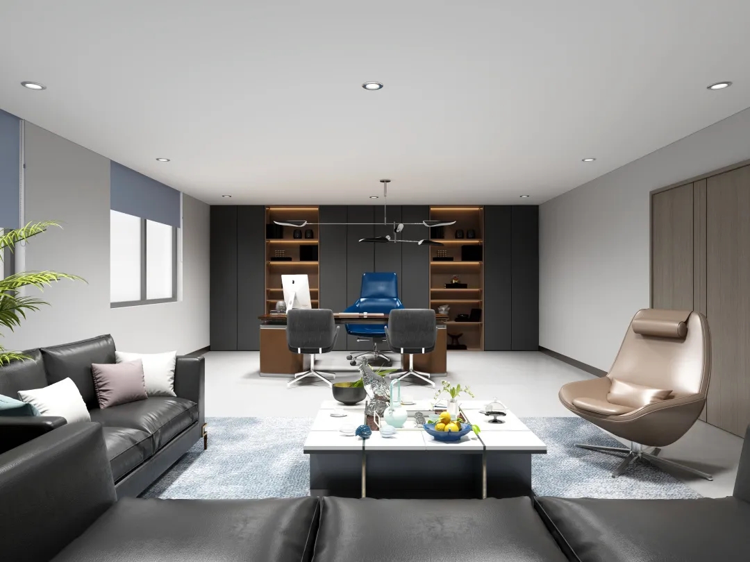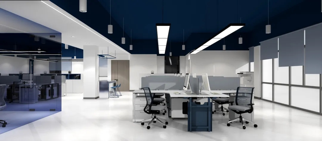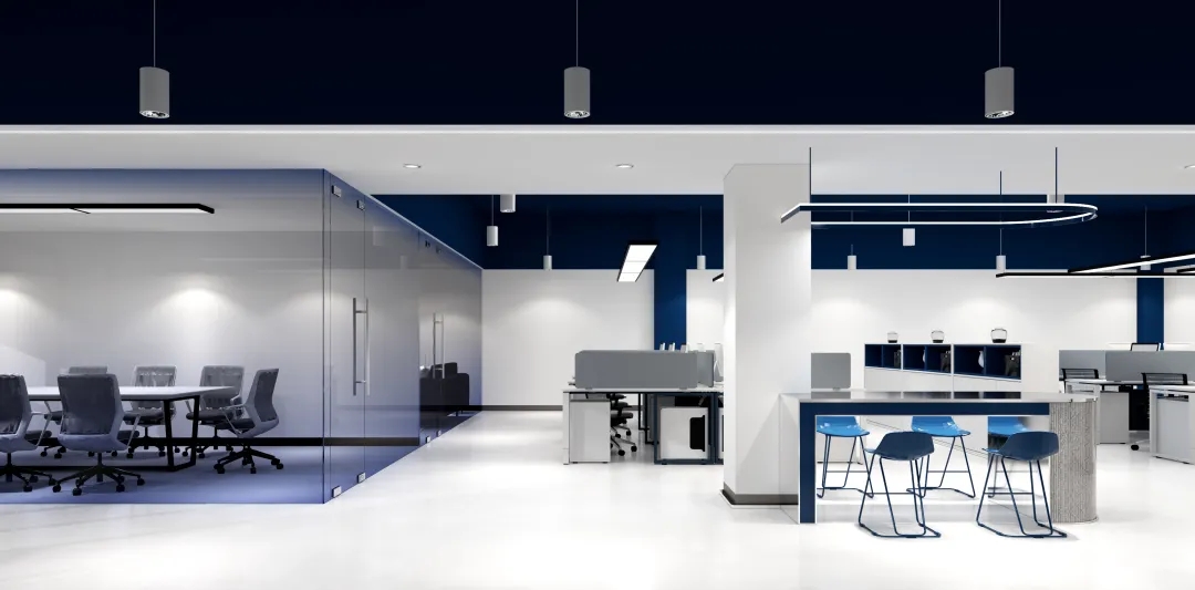 装修设计意在展现企业的品牌形象和企业文化。以蓝色点缀色调,使人们联想到创新和前瞻性,也一种非常充满活力和新鲜感的颜色组合,为办公室带来现代感和精神振奋。